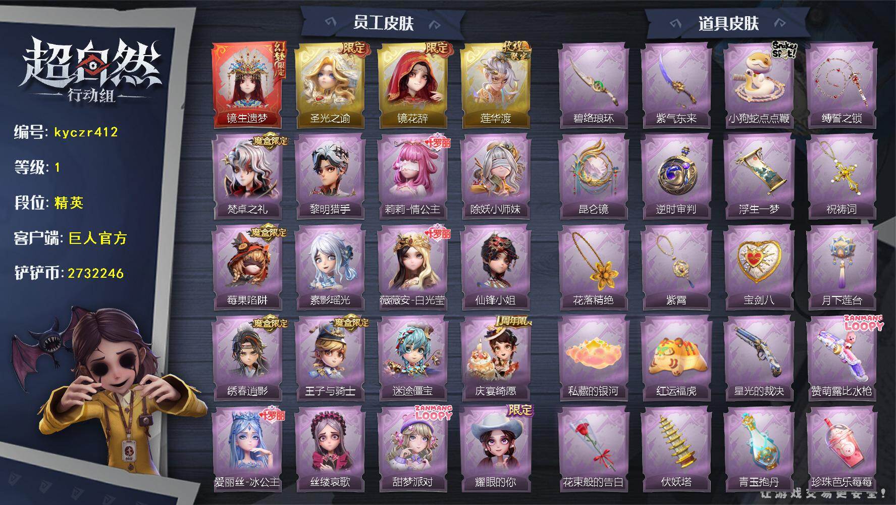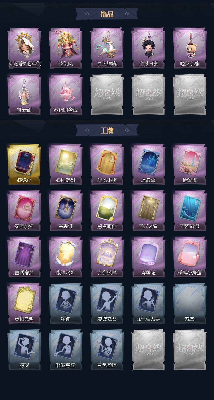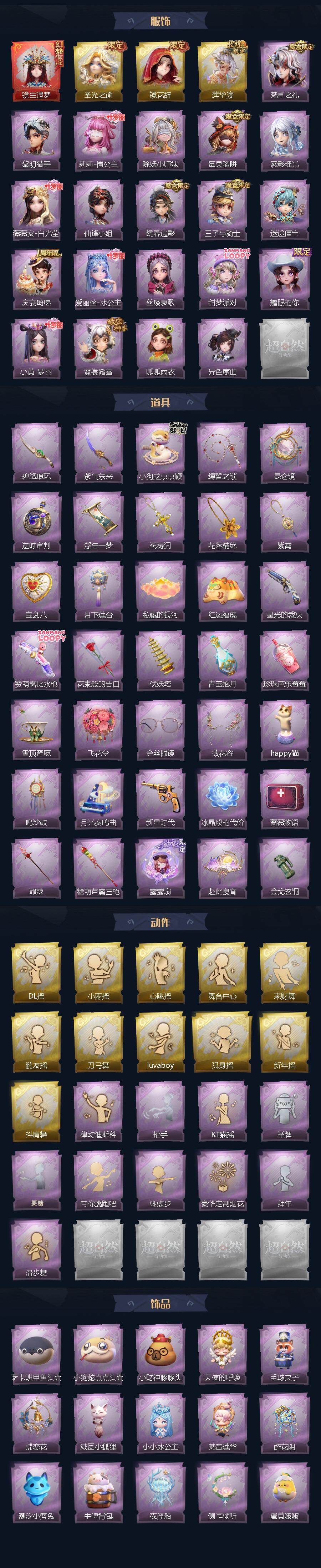 巫铃儿-镜生遗梦,薇薇安-圣光之谕,巫铃儿-镜花辞,逍遥-莲华渡,爱德华-梵卓之礼,艾伦-黎明猎手,莉莉-情公主,莉莉-除妖小师妹,莉莉-莓果陷阱,巫铃儿-素影瑶光,薇薇安-白光莹,薇薇安-仙锋小姐,逍遥-绣春逍影,阿念-王子与骑士,阿念-迷途僵宝,阿念-庆宴绮愿,爱丽丝-冰公主,爱丽丝-丝缕哀歌,爱丽丝-甜梦派对,爱丽丝-耀眼的你,小黄-罗丽,小黄-霓裳踏雪,小黄-呱呱雨衣,小黄-异色序曲,刺刀-碧络琅环,刺刀-紫气东来,长鞭-小狗蛇点点鞭,长鞭-缚誓之锁,传送按钮-昆仑镜,传送按钮-逆时审判