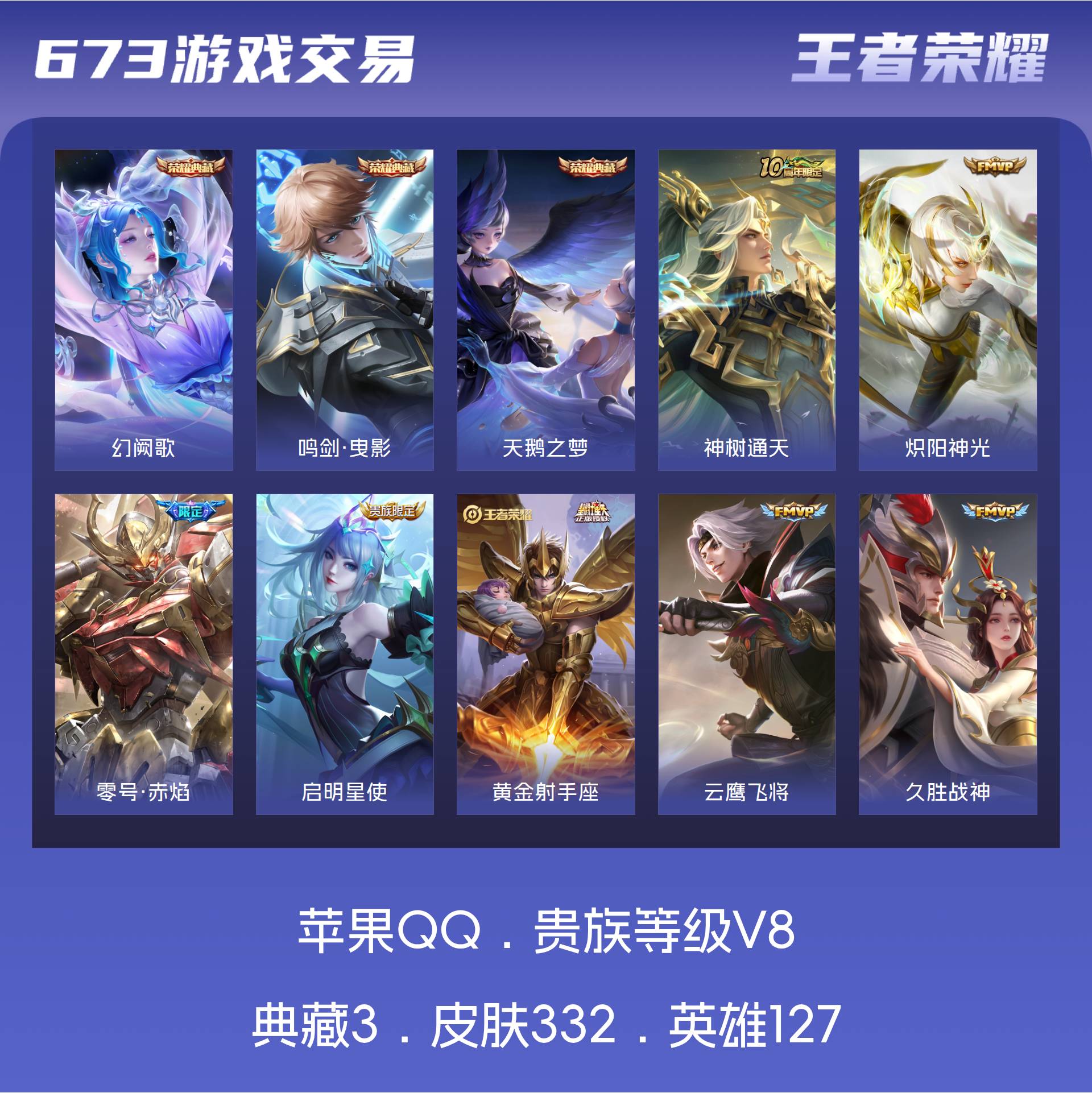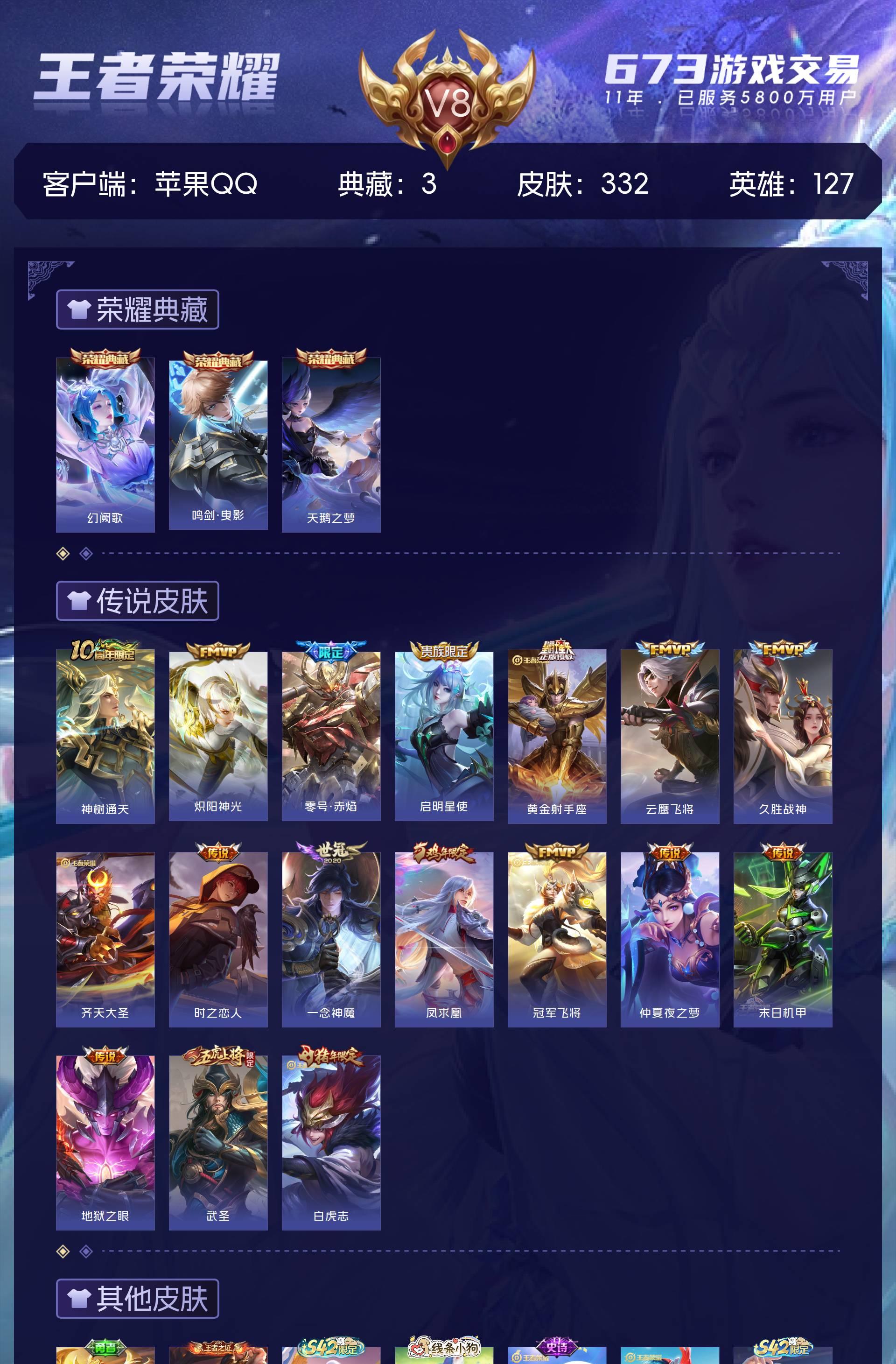 苹果QQ/最强王者/332皮肤/127英雄/3典藏/0珍品无双/0无双/0珍品传说/16传说/108