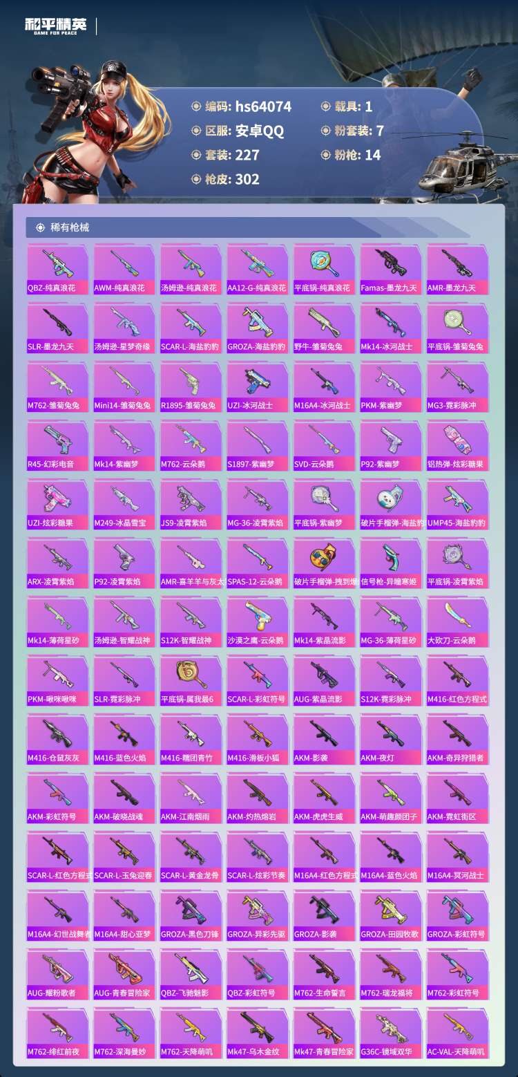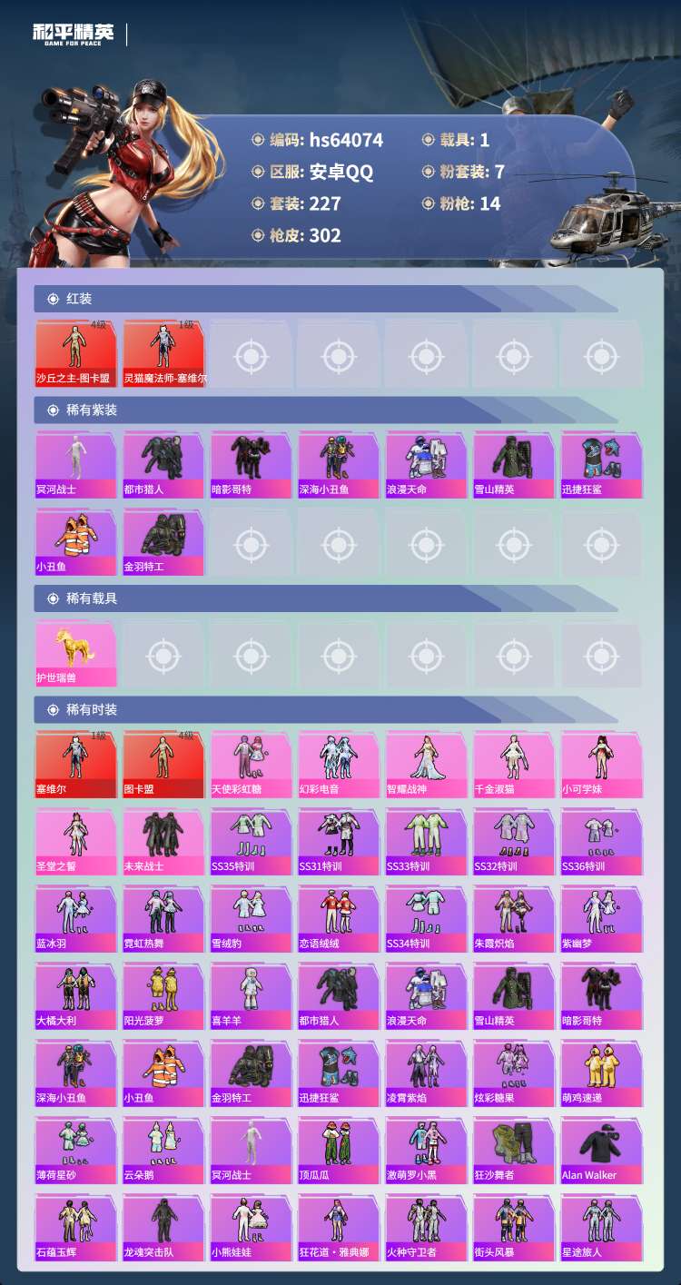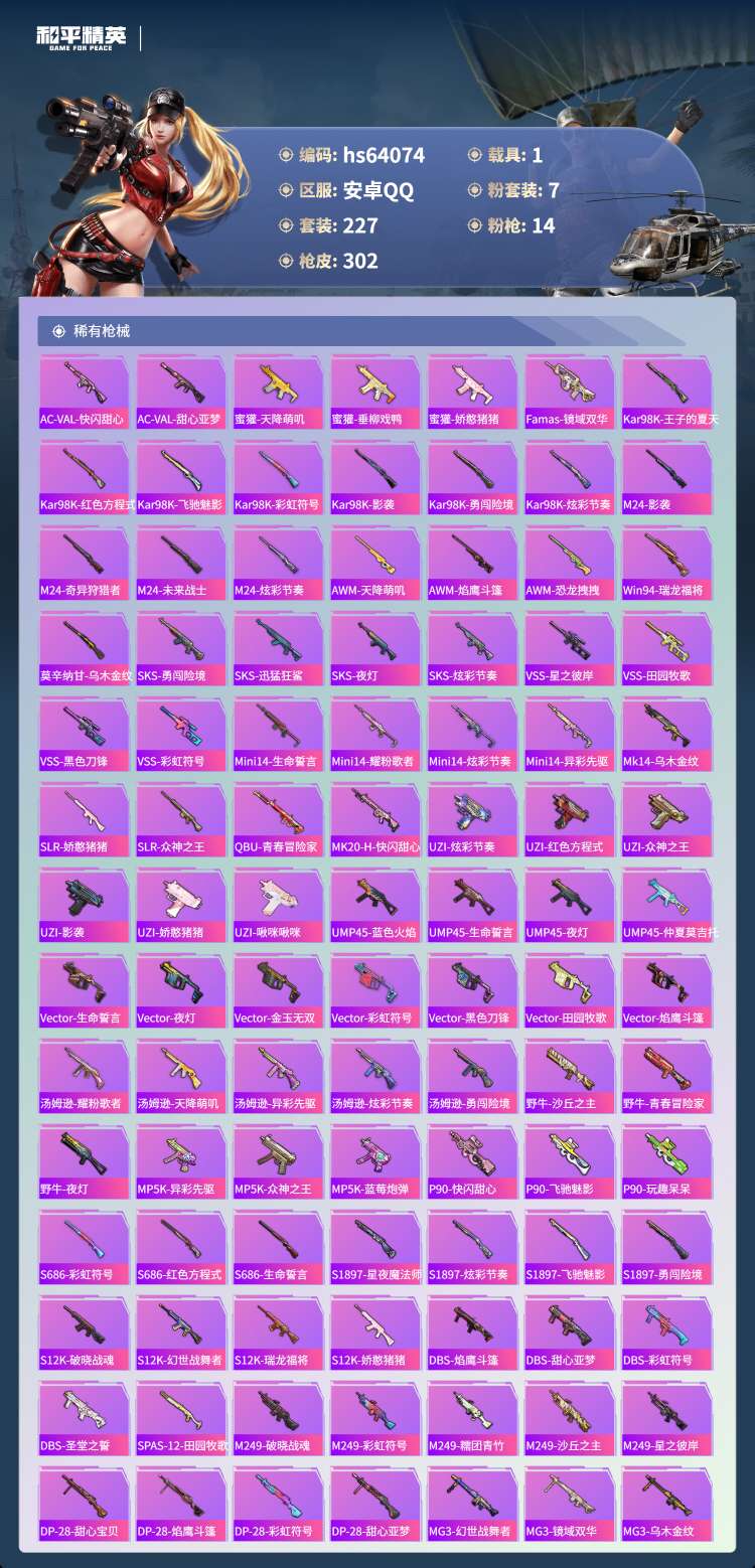 hs64074 安卓手Q-26王牌印记-2红装-7粉装-14特效枪-1载具-106374热力值-22