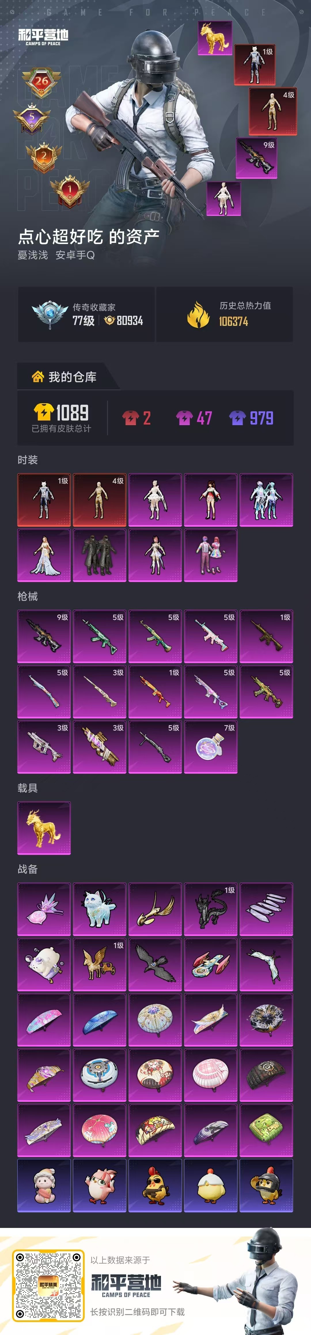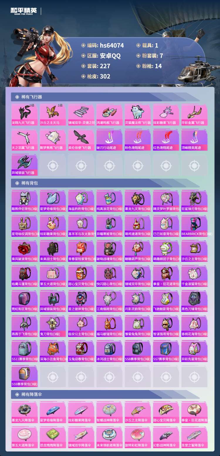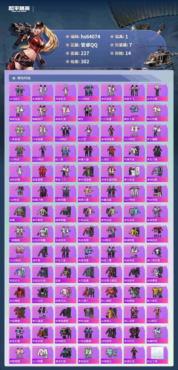 hs64074 安卓手Q-26王牌印记-2红装-7粉装-14特效枪-1载具-106374热力值-22
