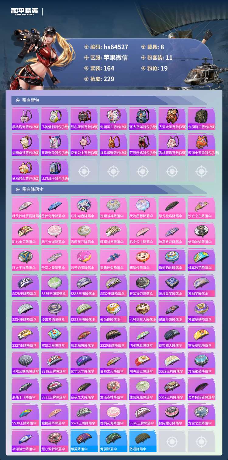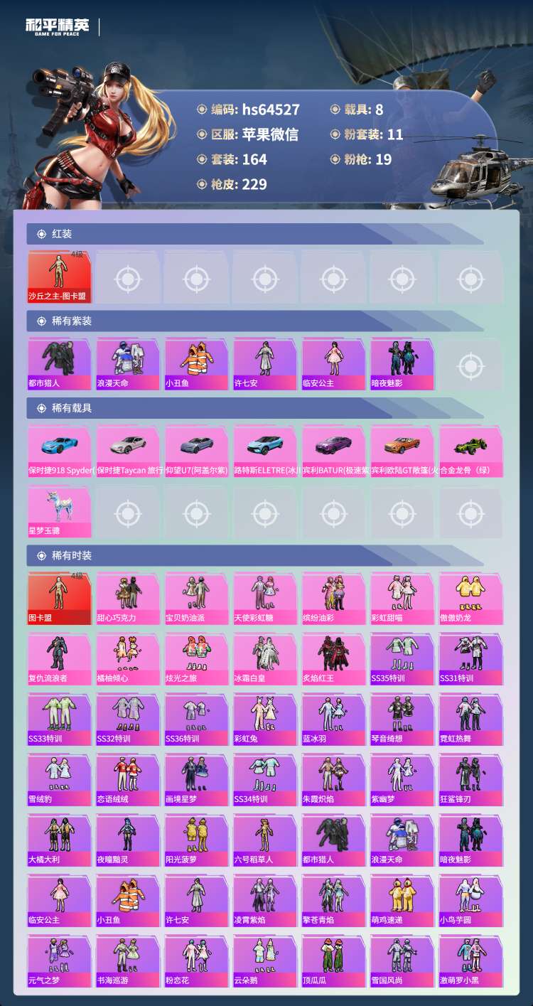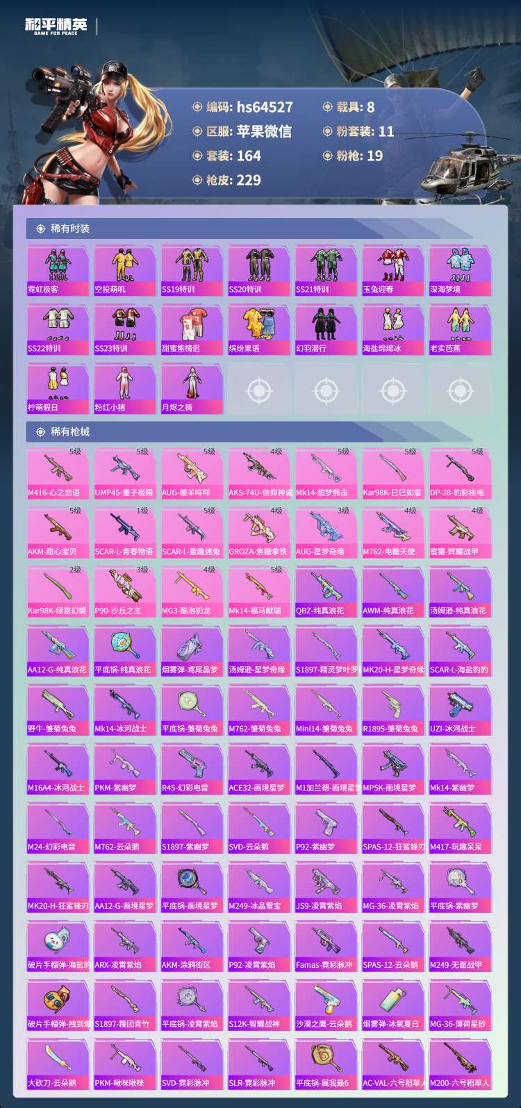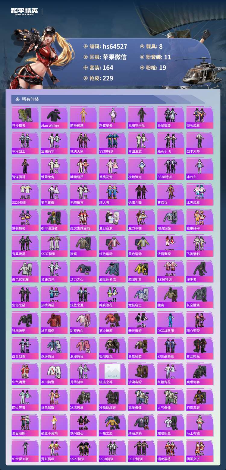 hs64527 苹果微-16王牌印记-1红装-11粉装-19特效枪-8载具-88458热力值-16