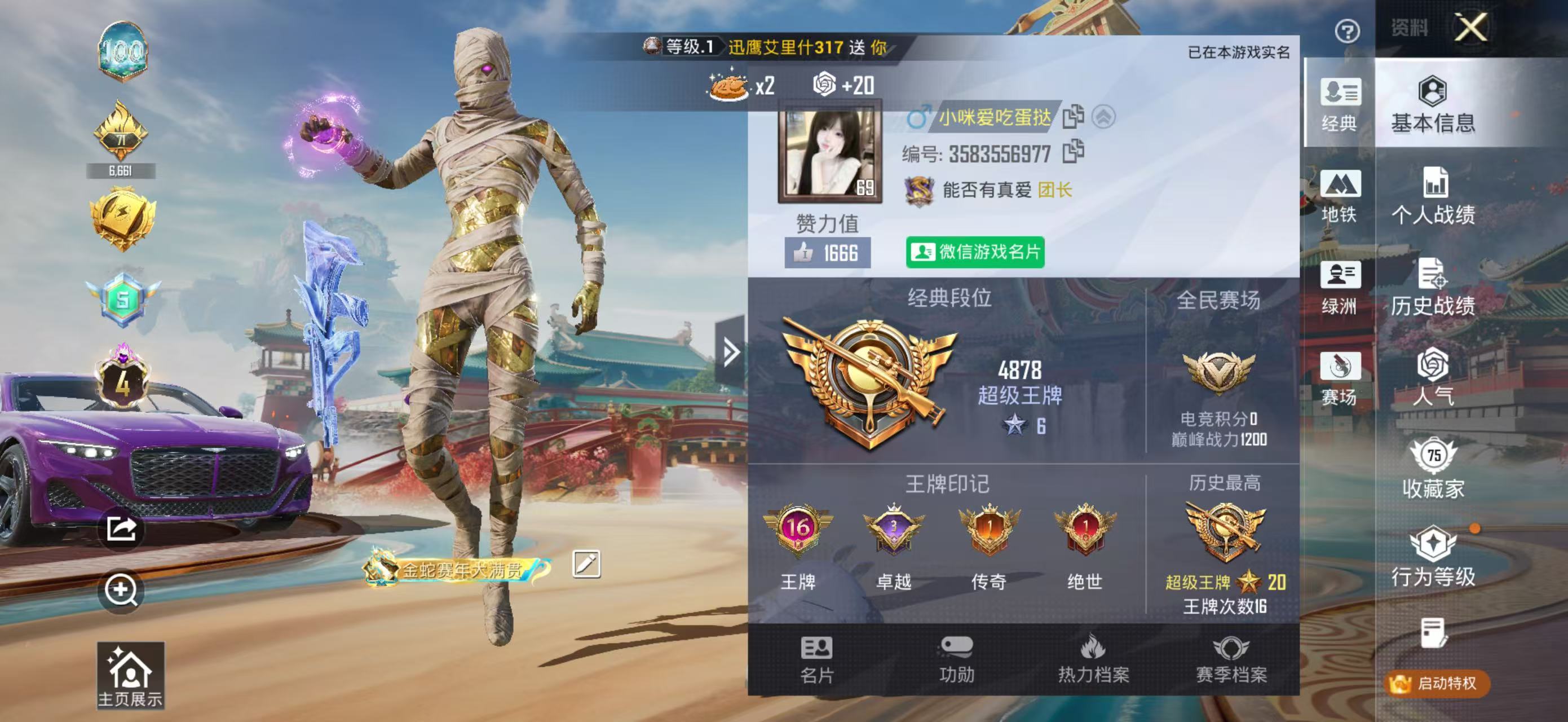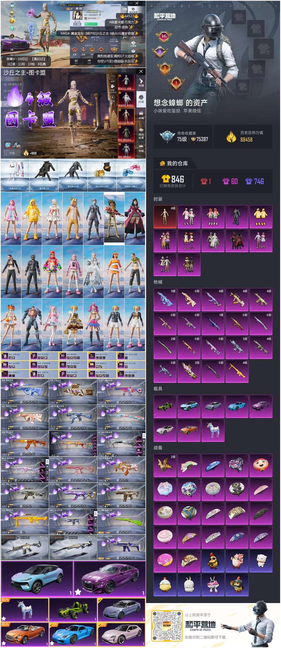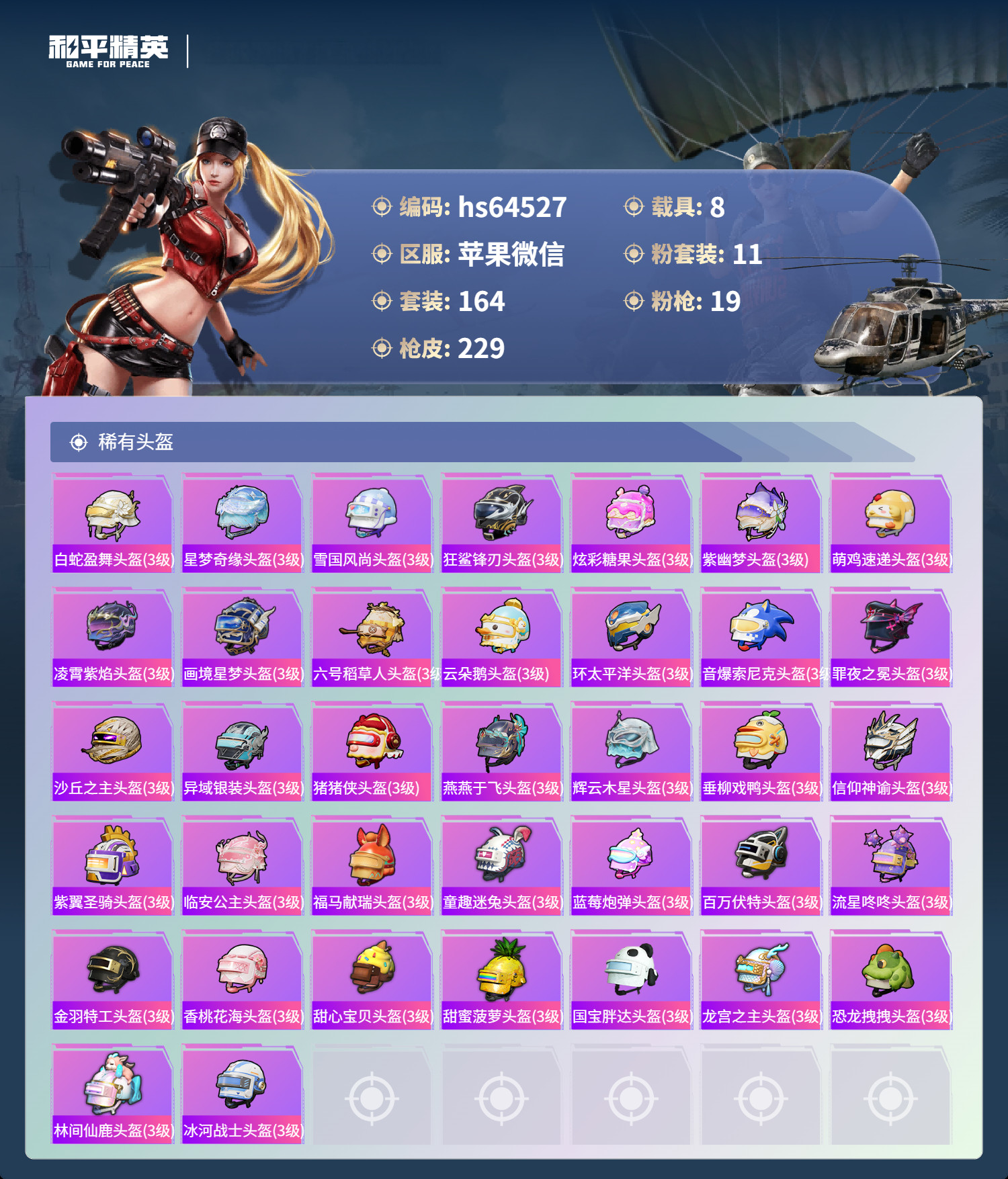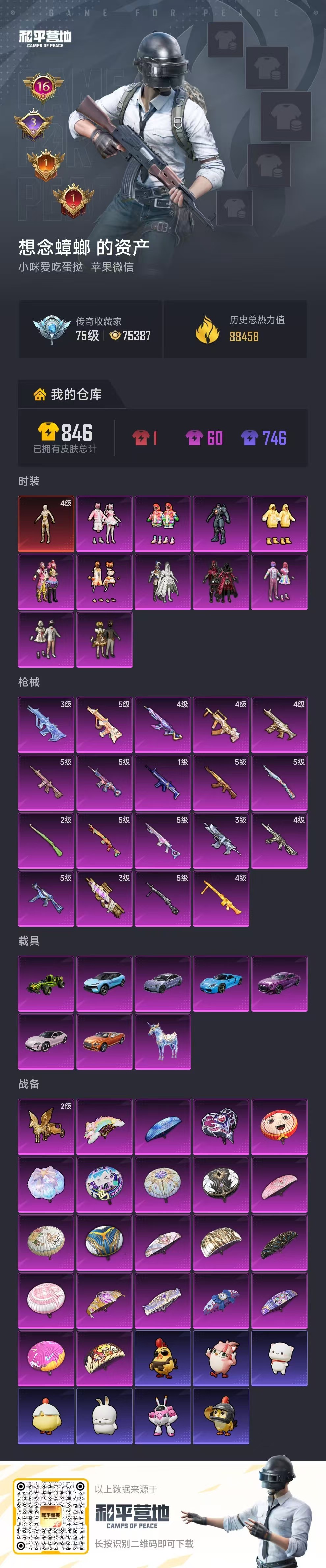 hs64527 苹果微-16王牌印记-1红装-11粉装-19特效枪-8载具-88458热力值-16