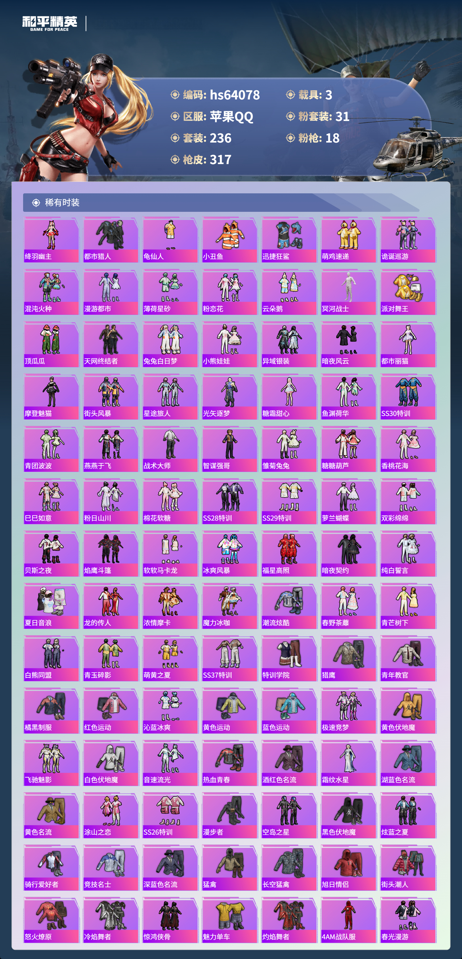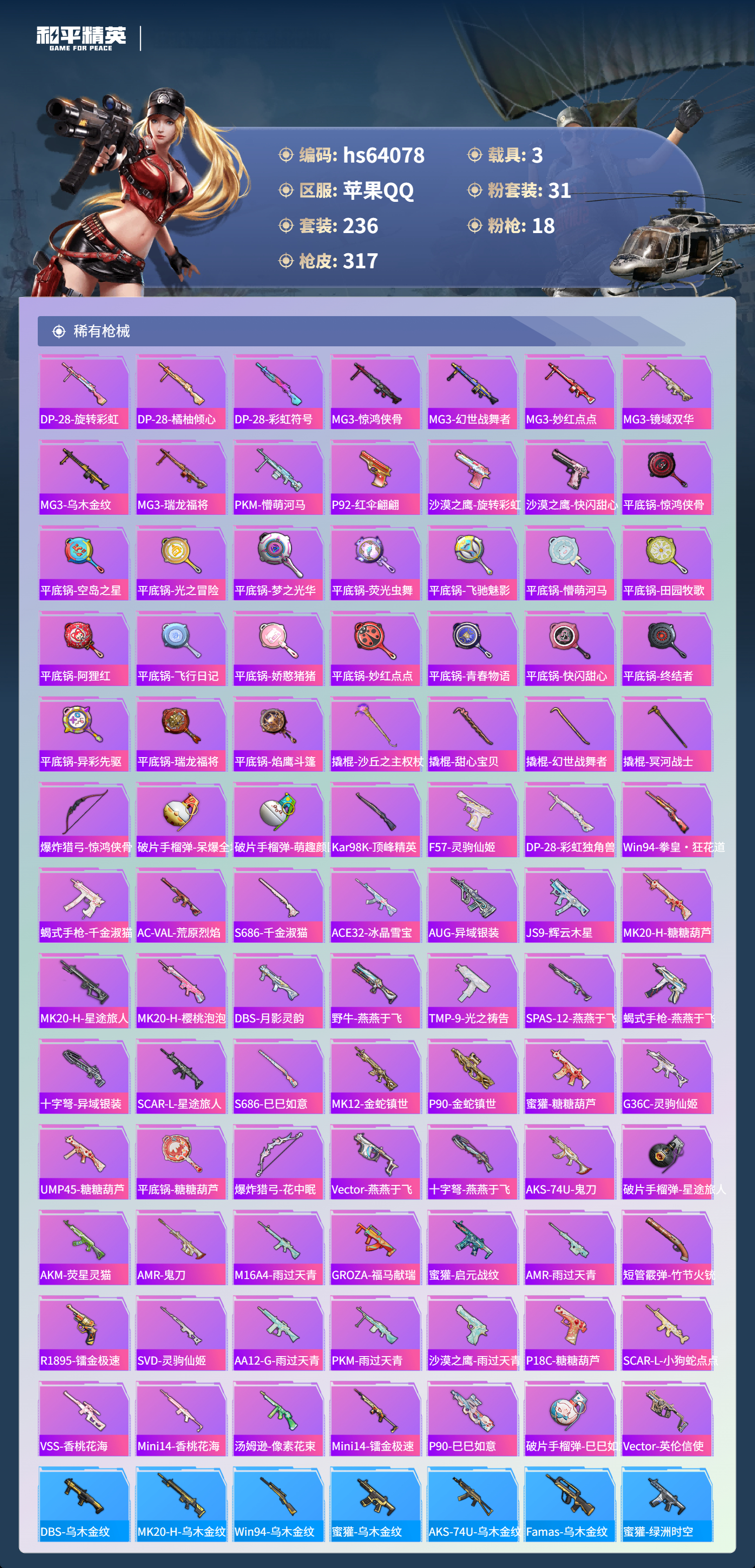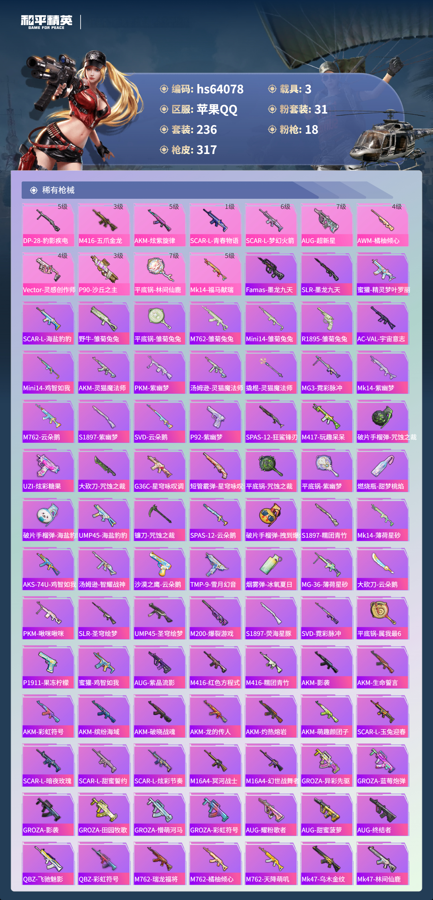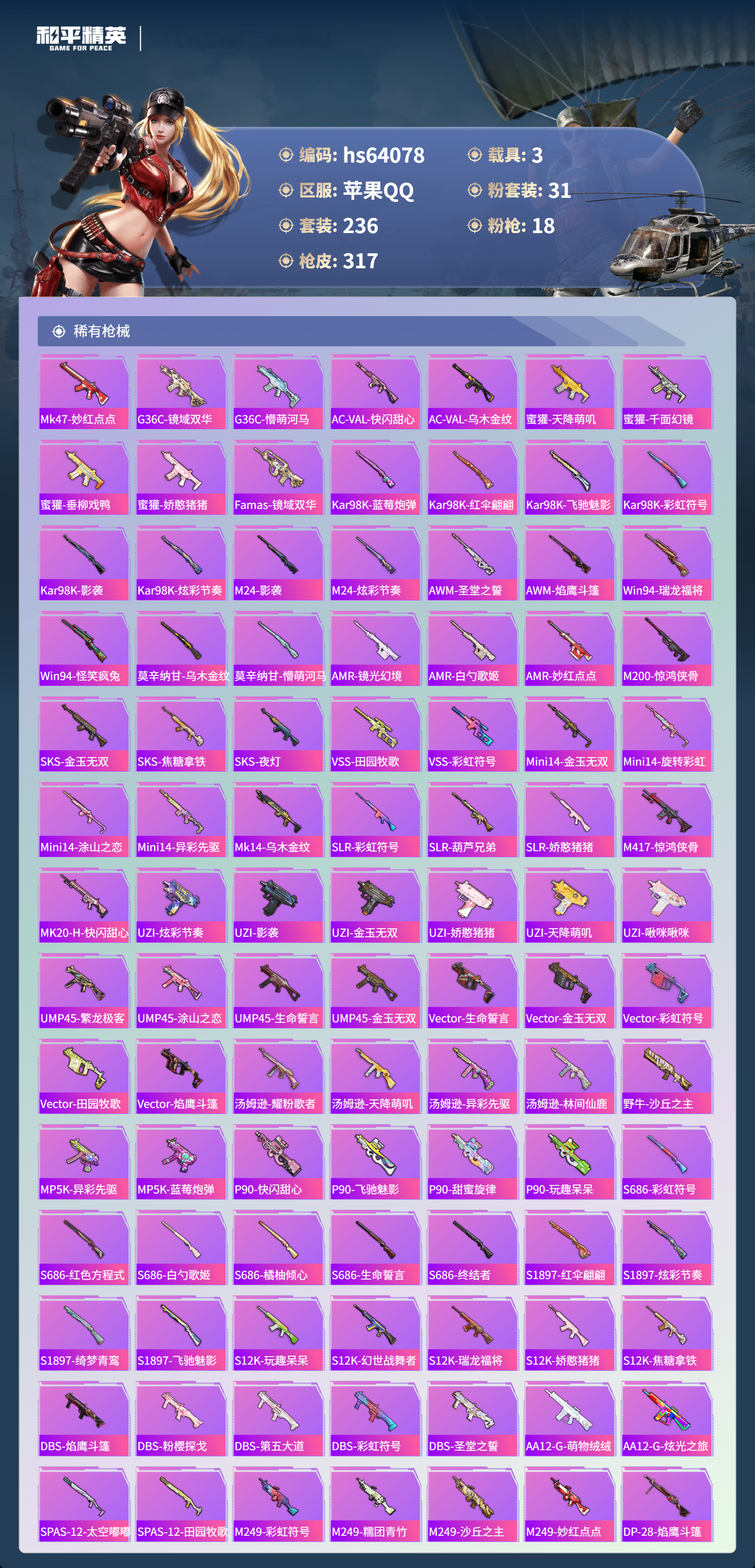 hs64078 苹果手Q-18王牌印记-3红装-31粉装-18特效枪-3载具-热力值-236套装-317枪皮-2卓越印记