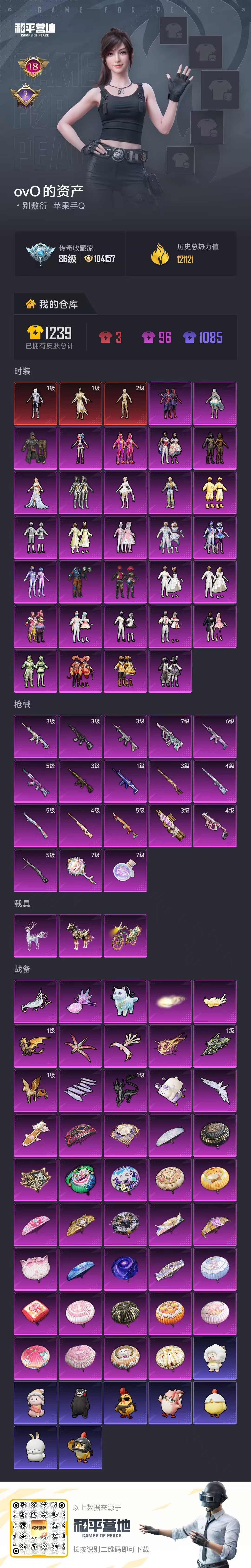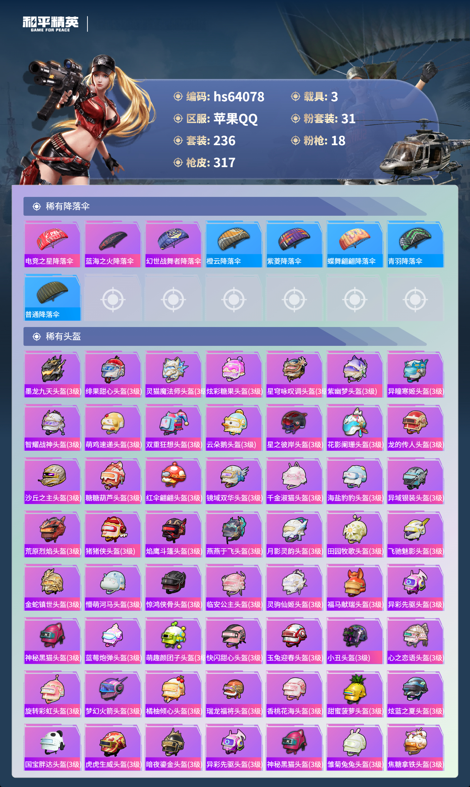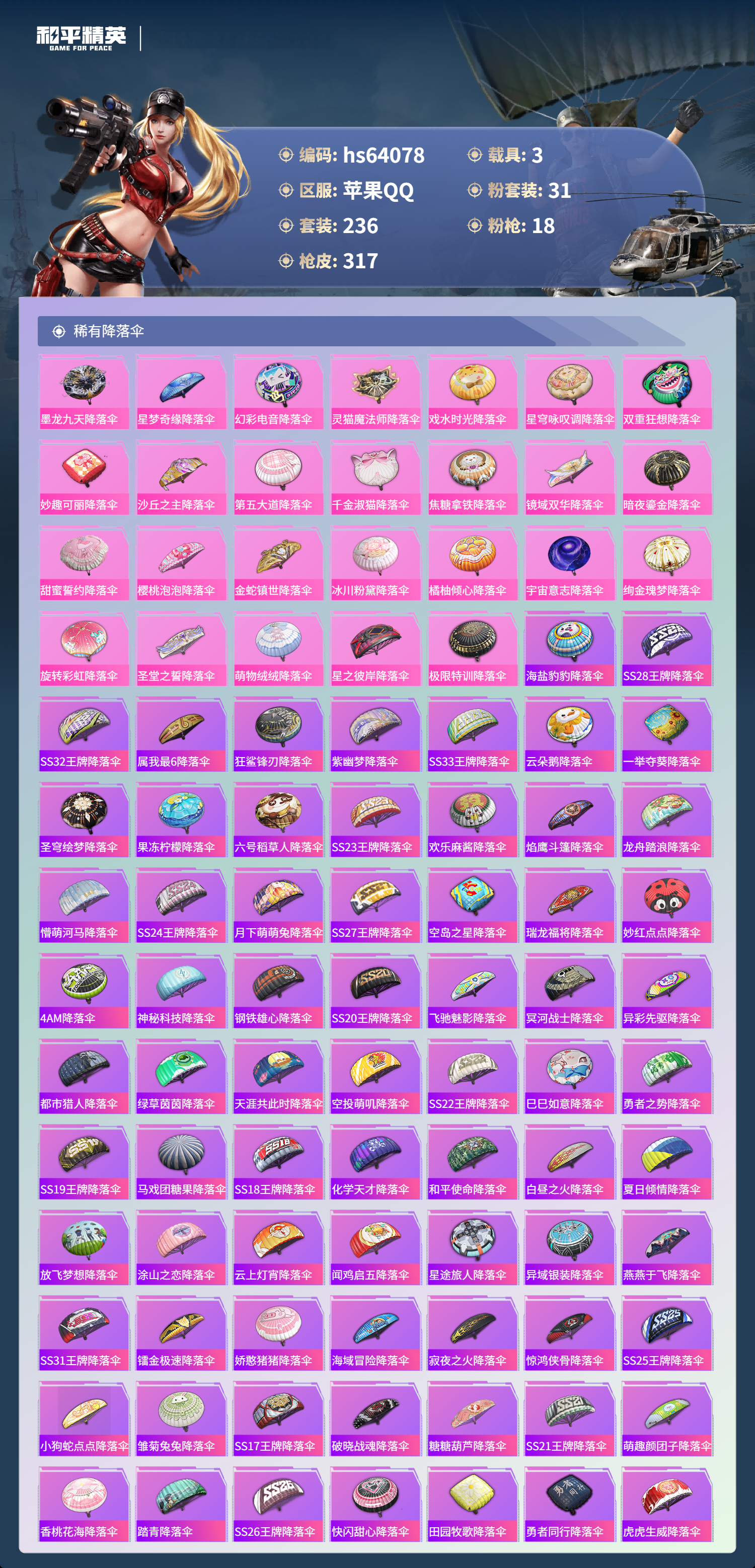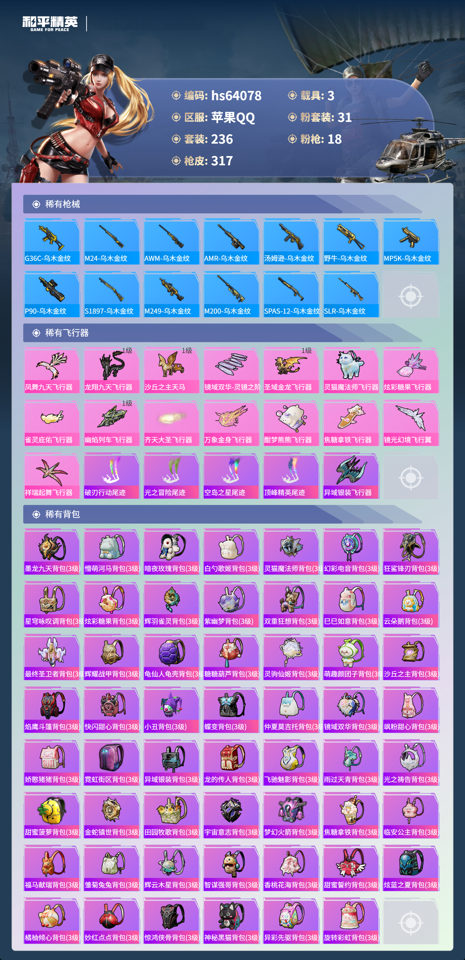 hs64078 苹果手Q-18王牌印记-3红装-31粉装-18特效枪-3载具-热力值-236套装-317枪皮-2卓越印记