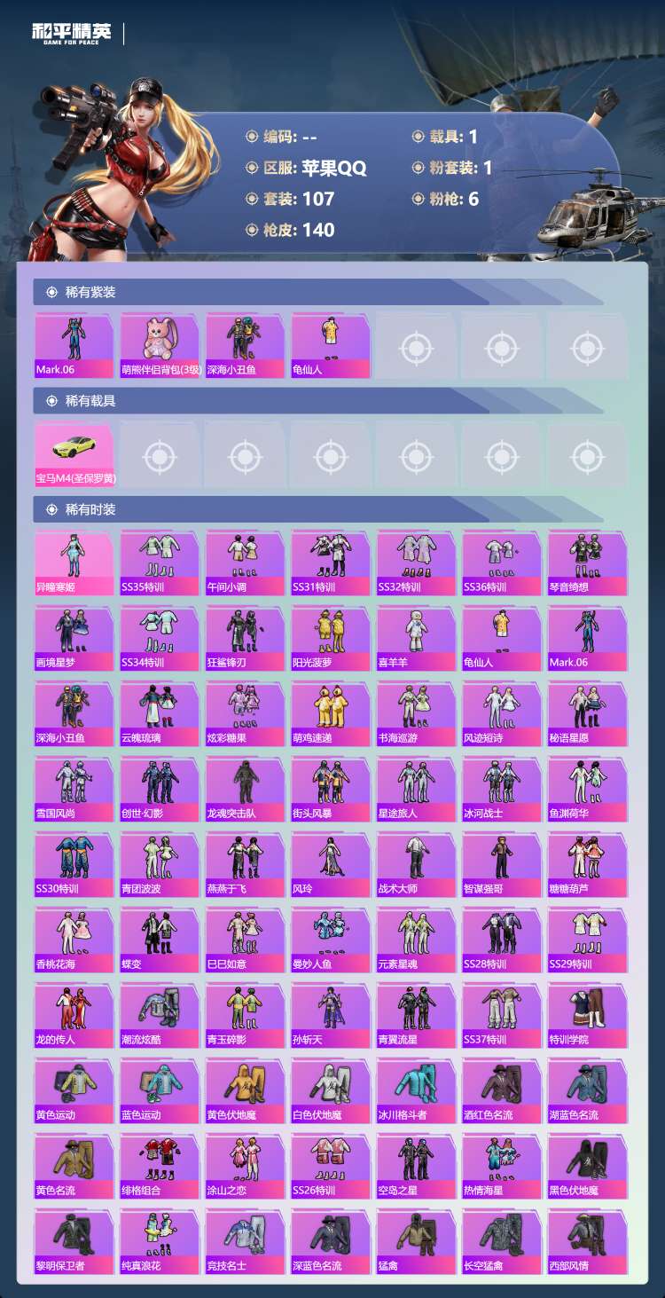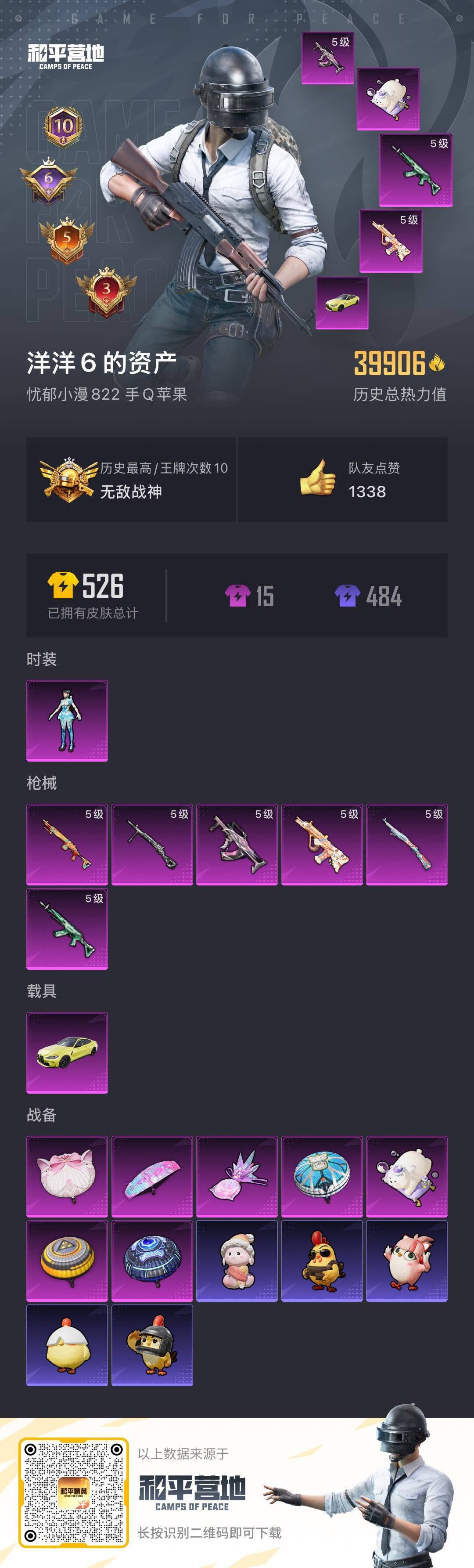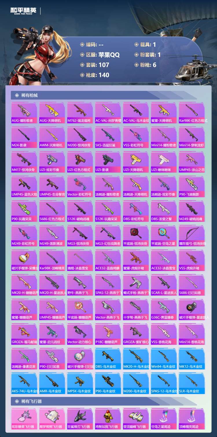 hs63977 苹果手Q-10王牌印记-有战神框-1粉装-6特效枪-1载具-39906热力值-107