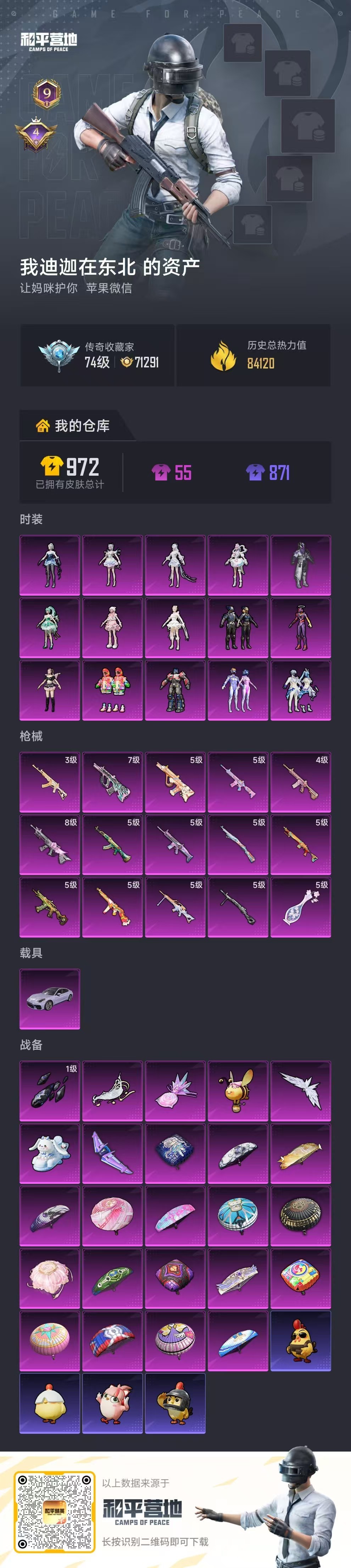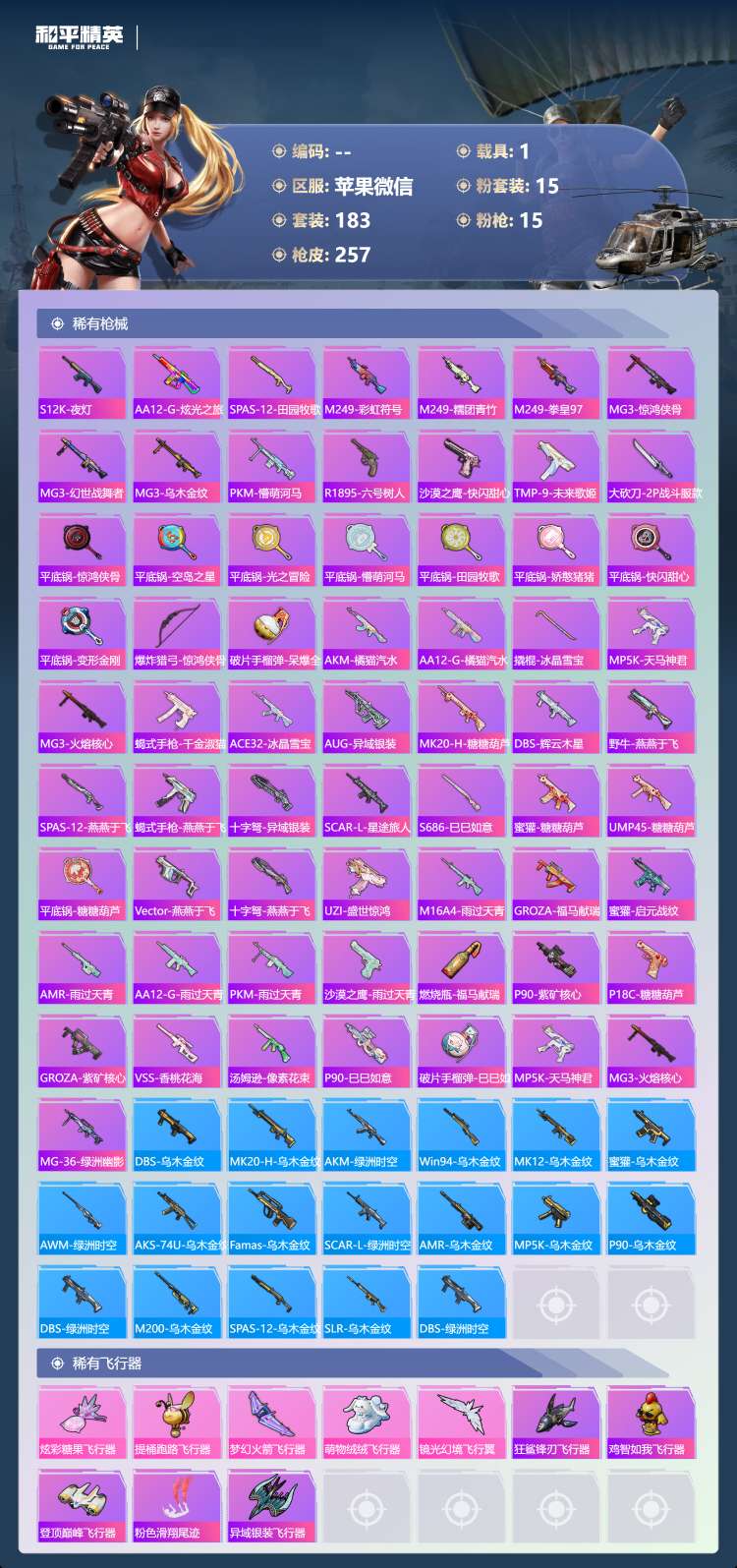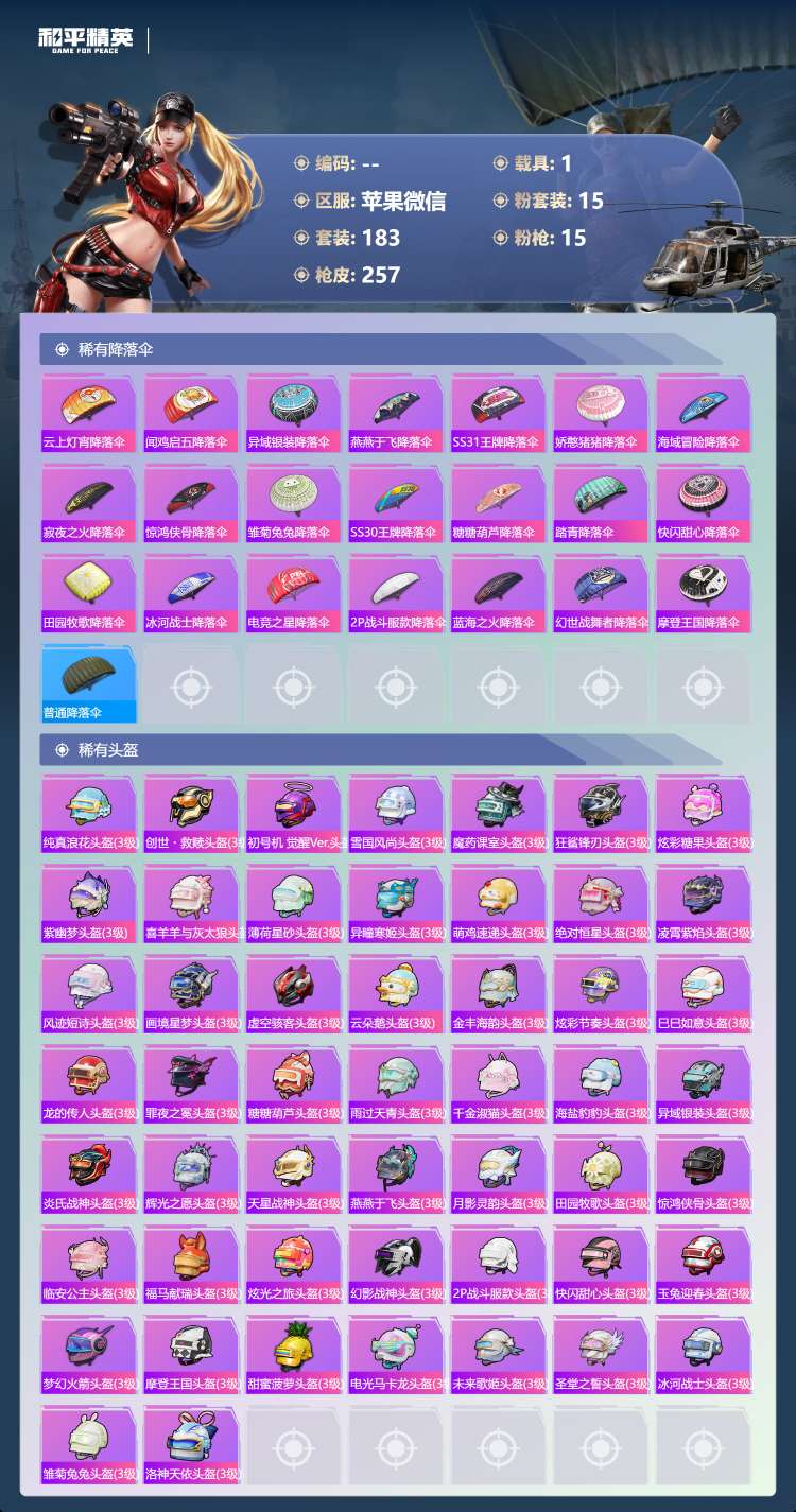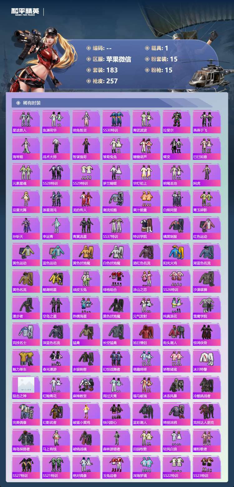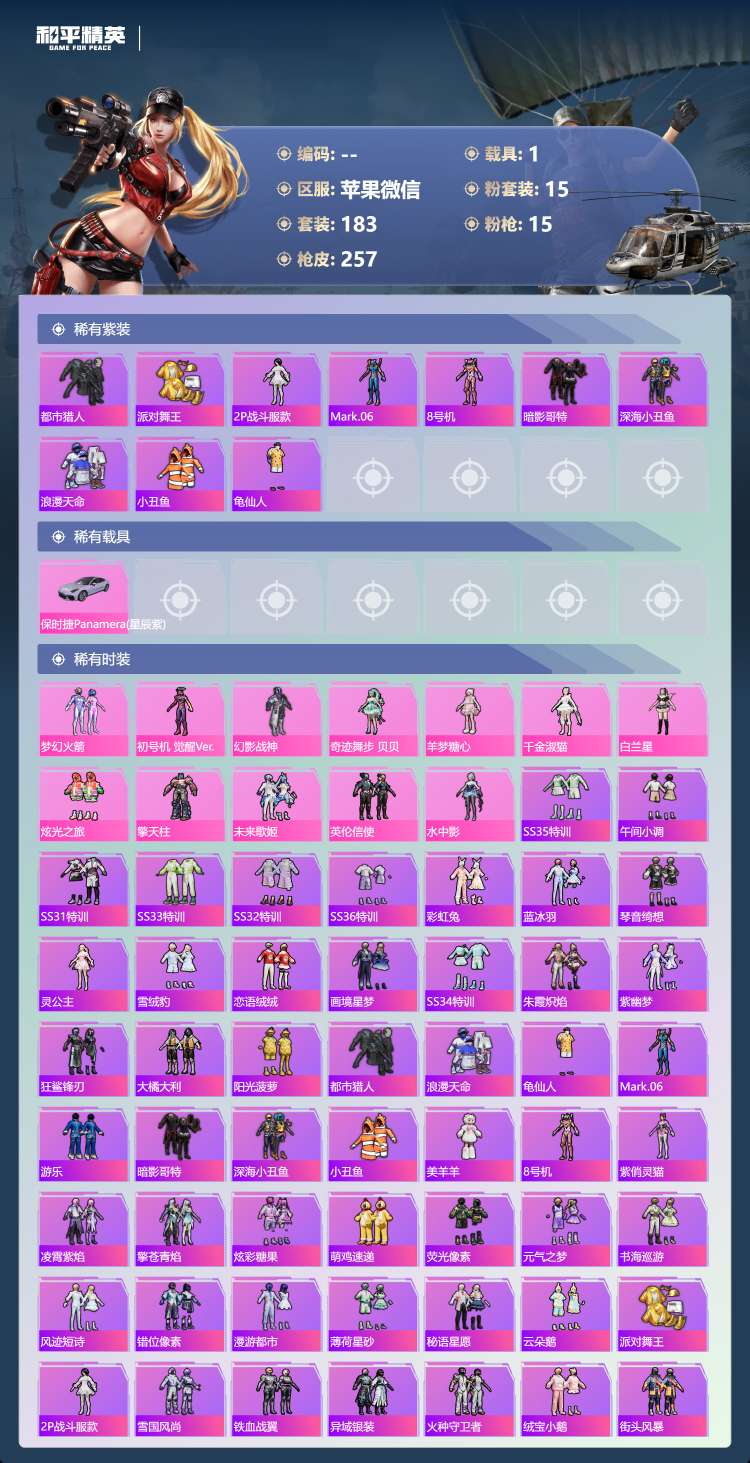 苹果微-9王牌印记-15粉装-15特效枪-1载具-84120热力值-183套装-257枪皮-4卓越