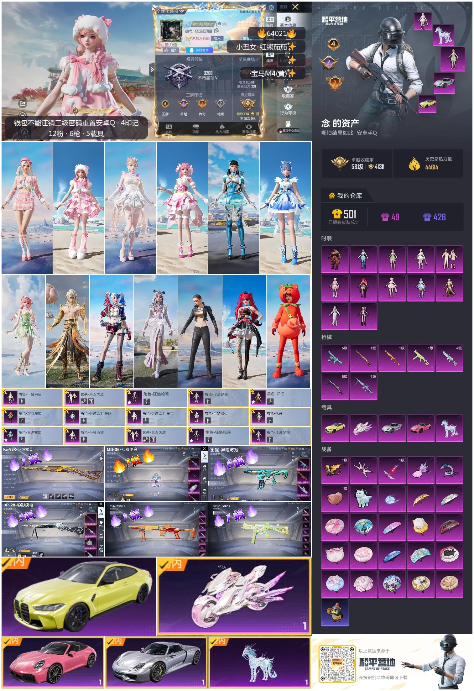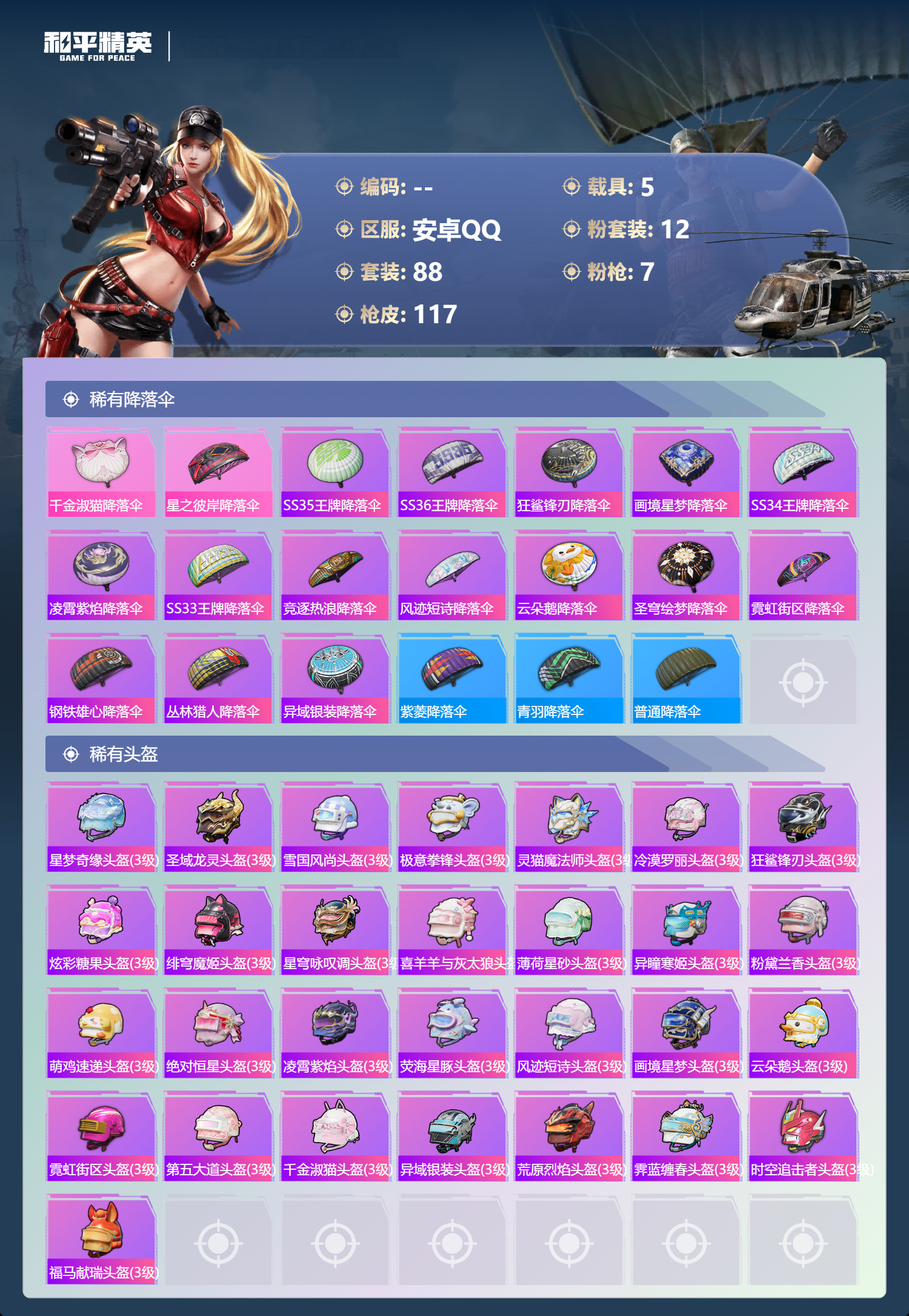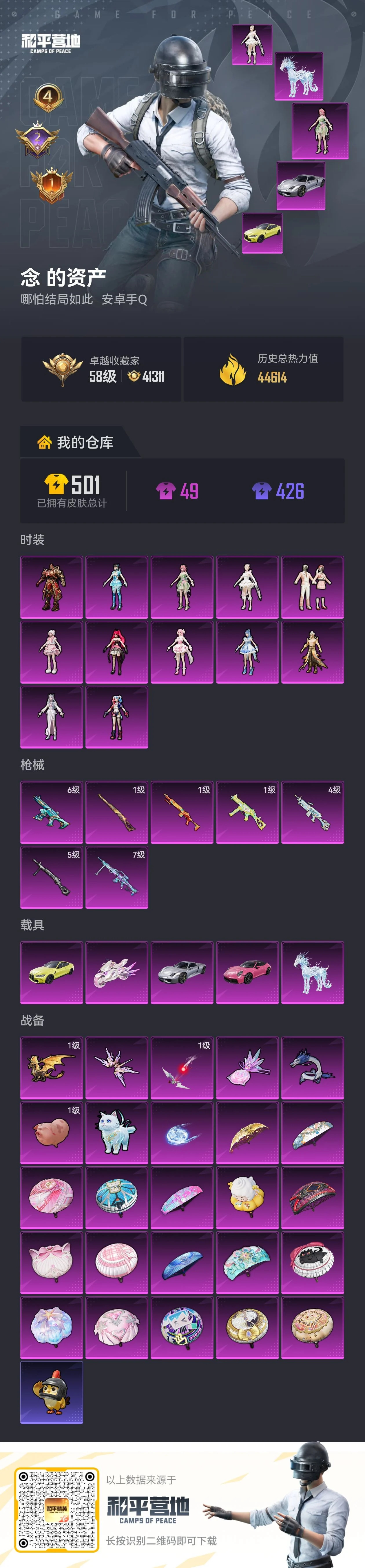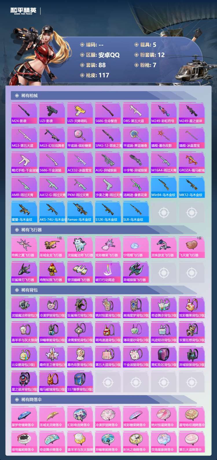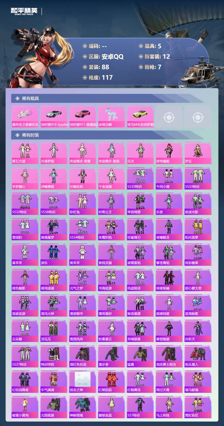 安卓手Q-4王牌印记-12粉装-7特效枪-5载具-44614热力值-88套装-117枪皮-2卓越印记