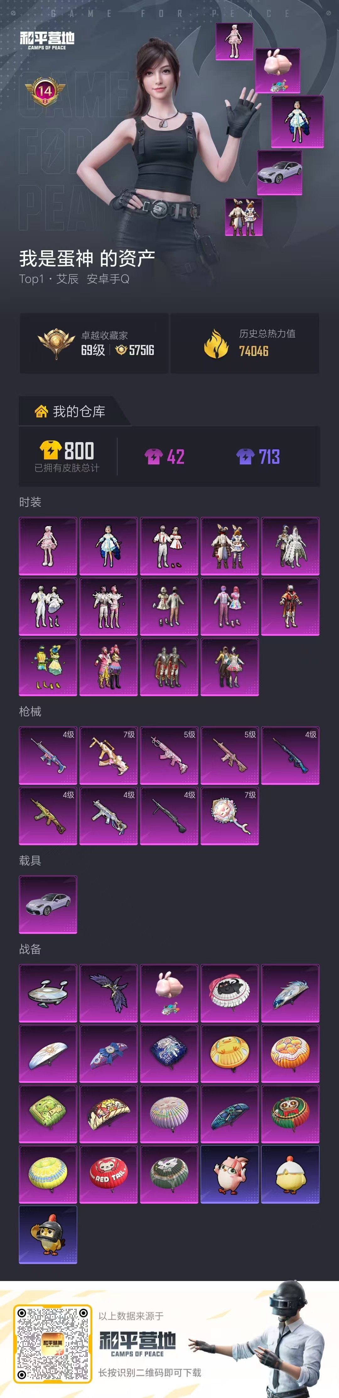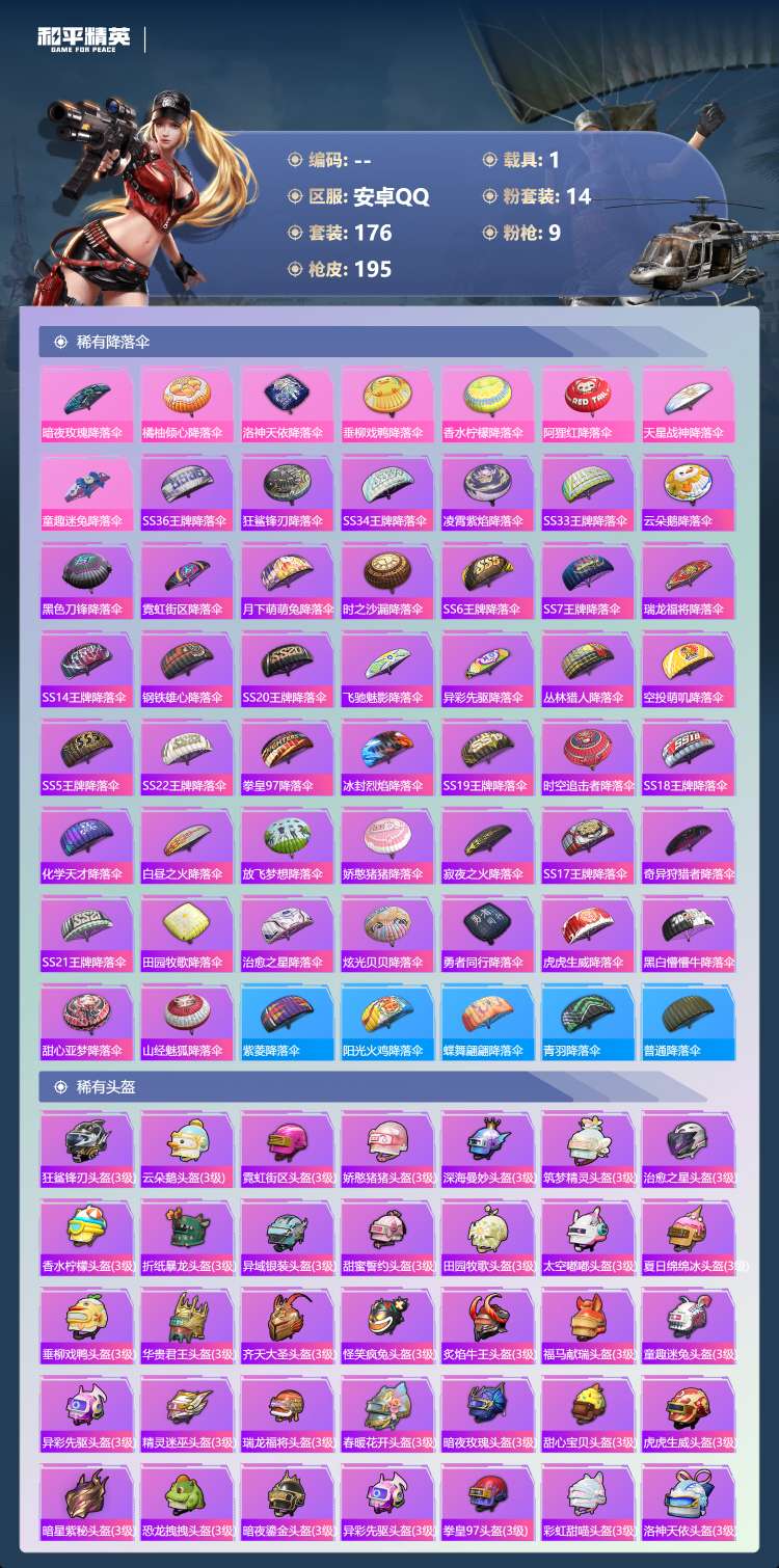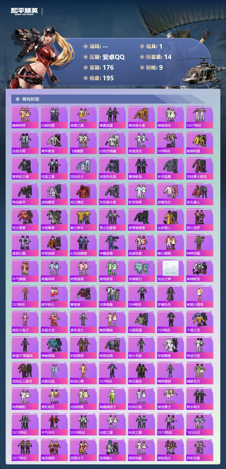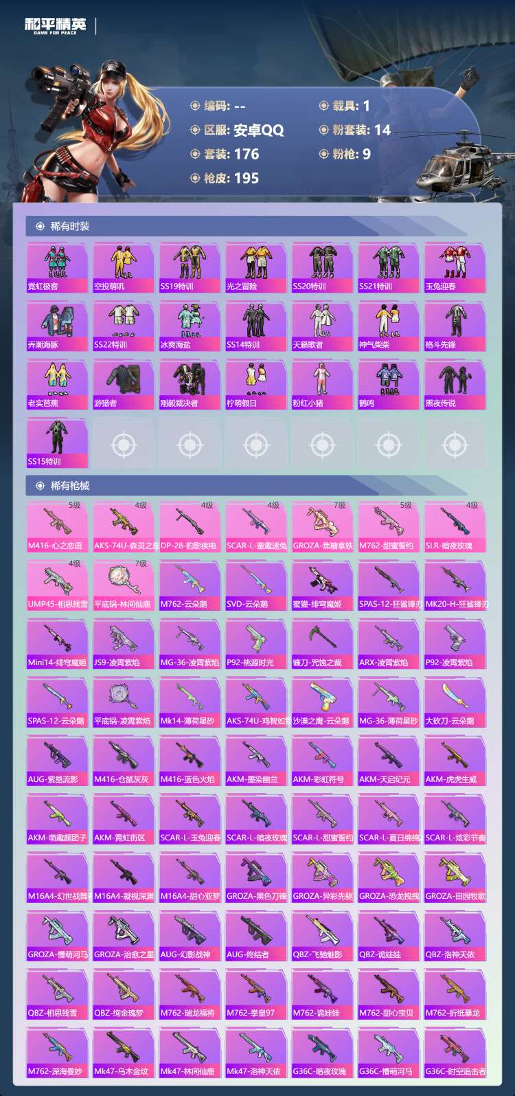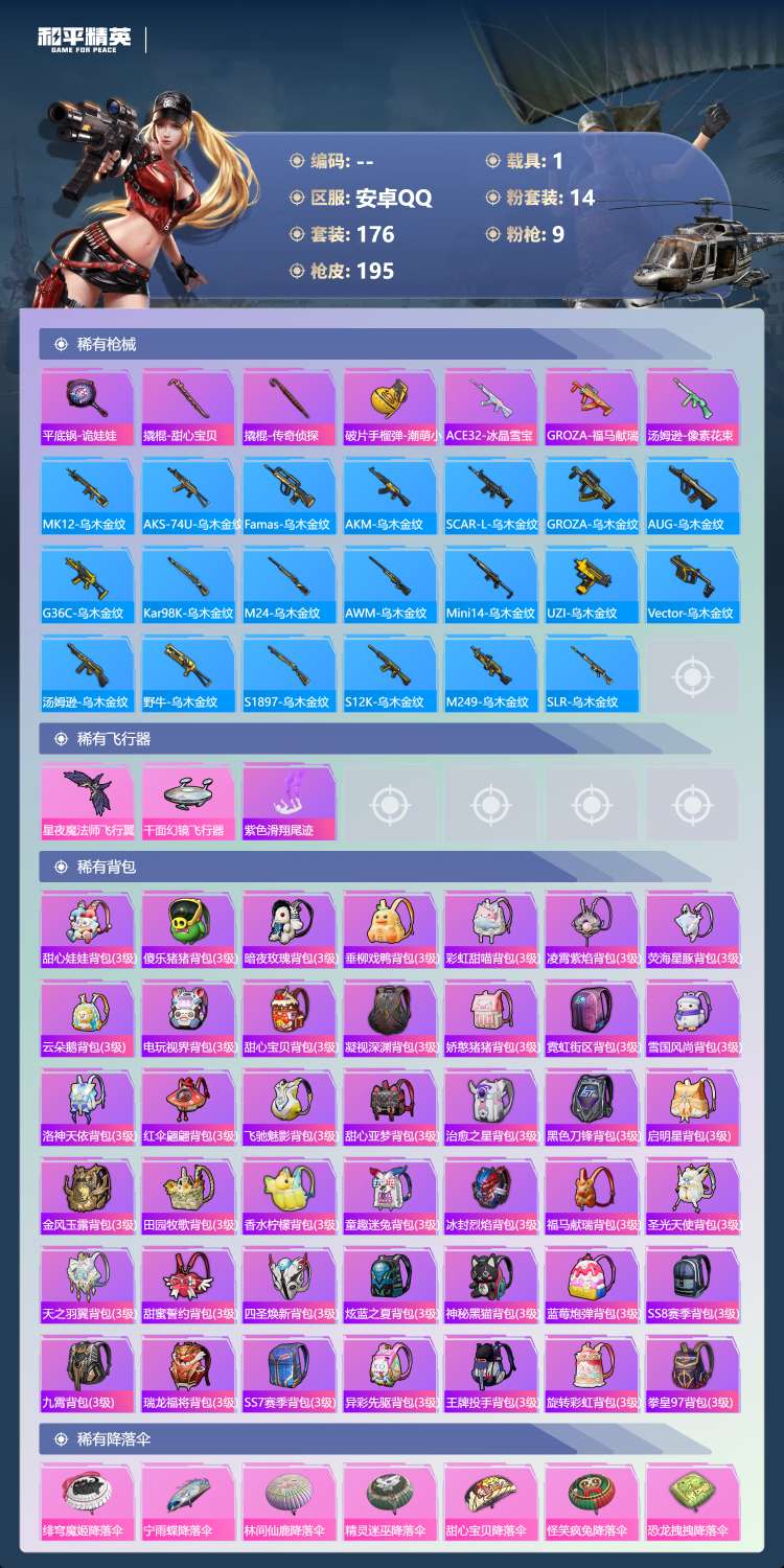 hs63972 安卓手Q-14王牌印记-14粉装-9特效枪-1载具-74046热力值-176套装-1