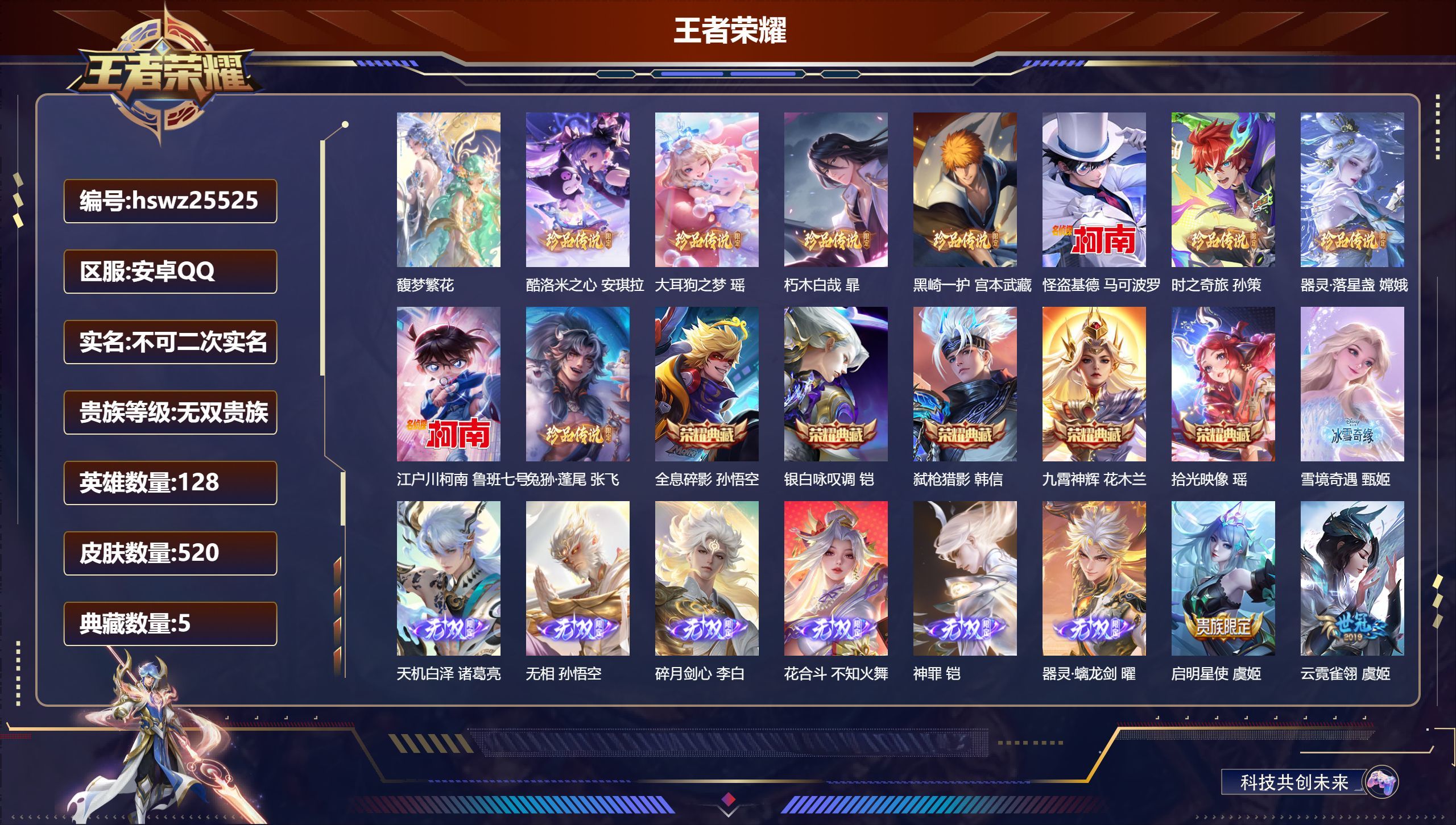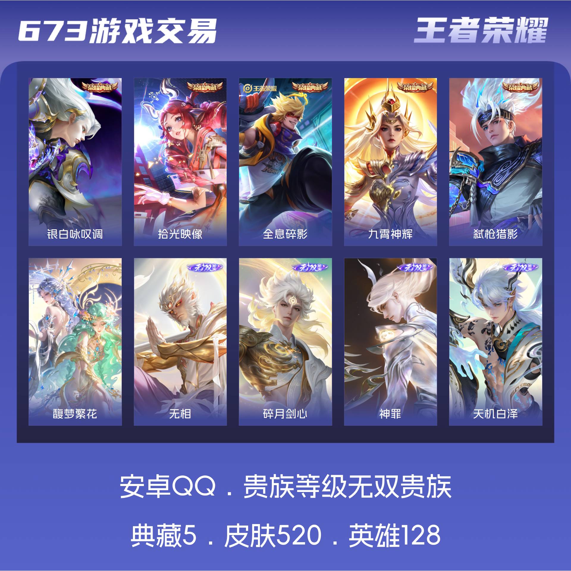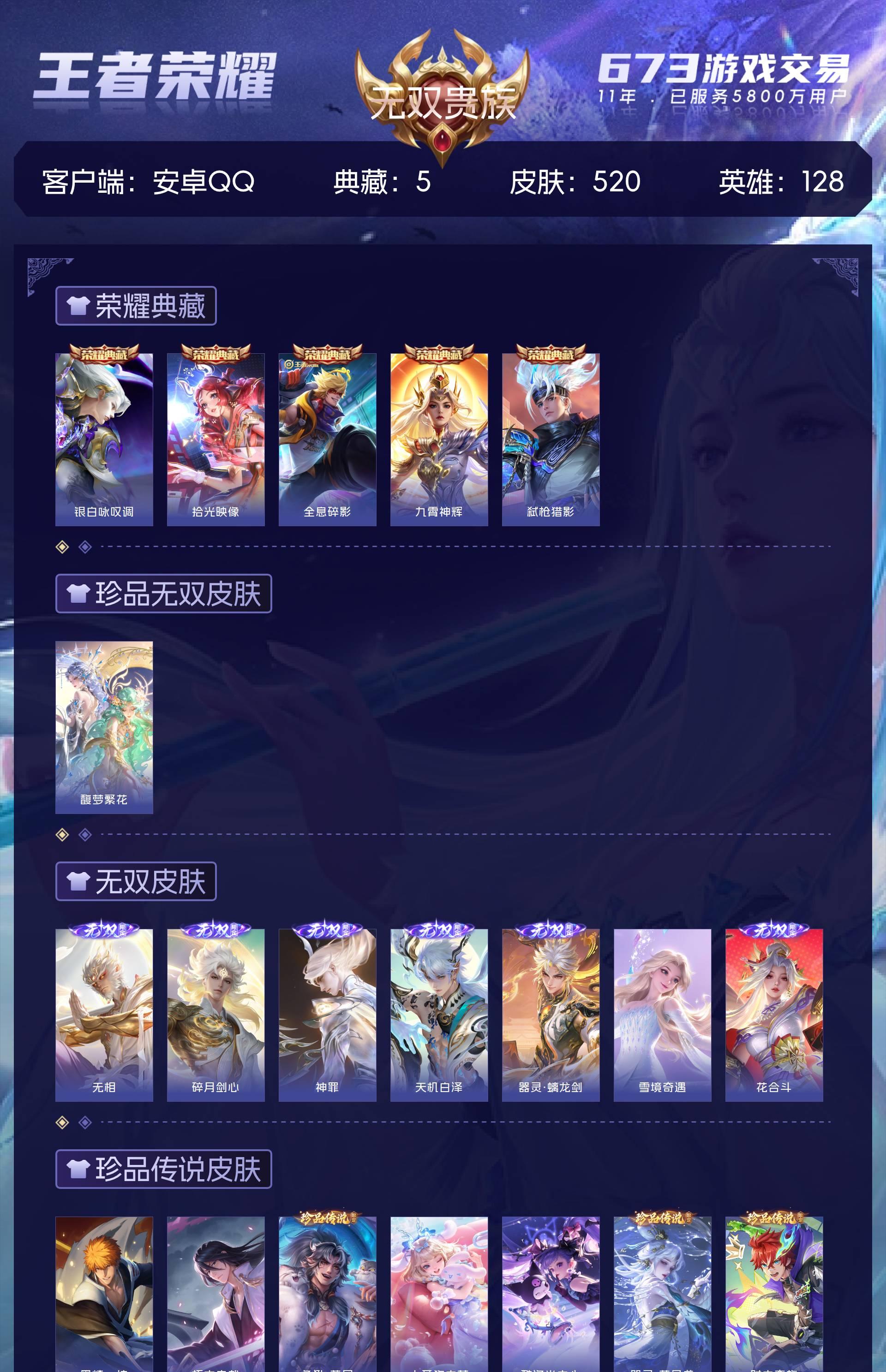 安卓QQ/至圣王者/520皮肤/128英雄/5典藏/1珍品无双/7无双/9珍品传说/77传说/162