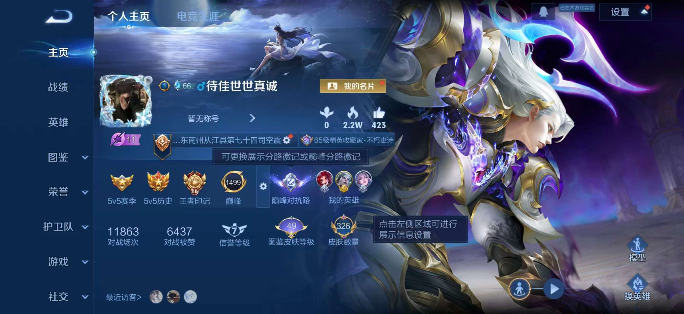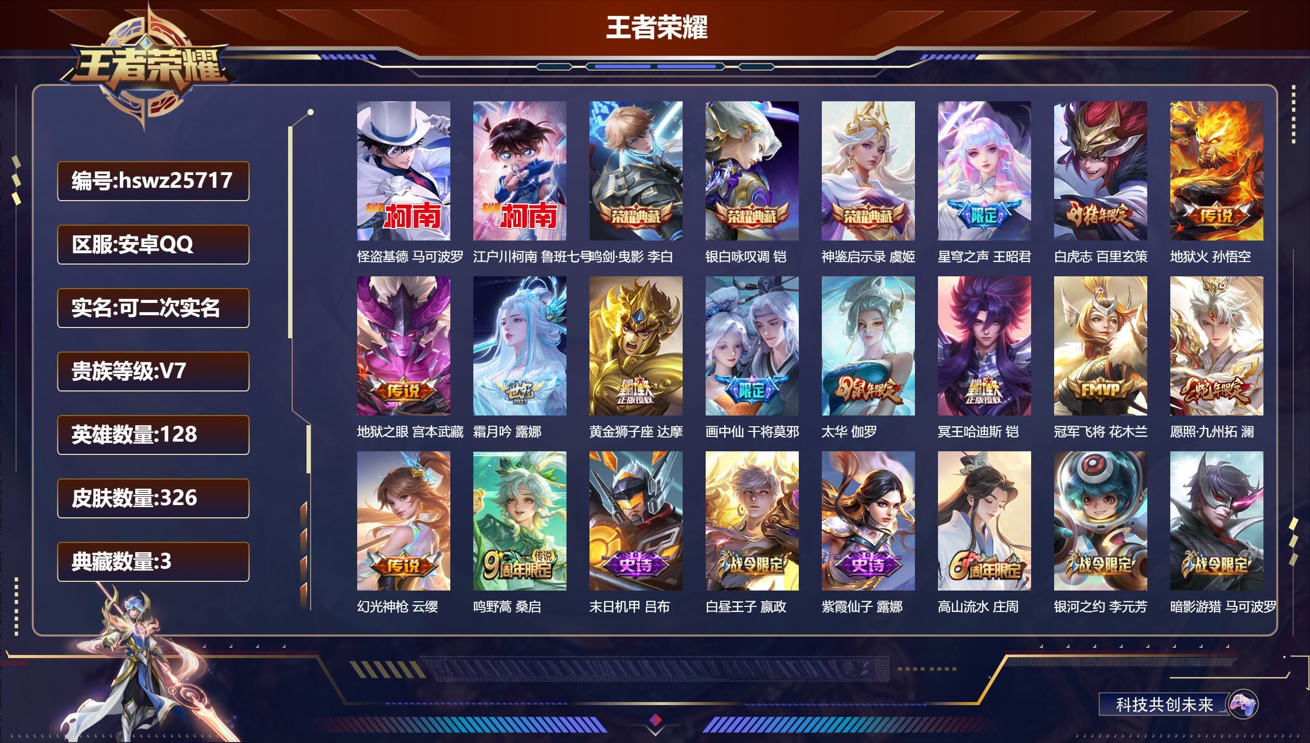 安卓QQ/非凡王者/326皮肤/128英雄/3典藏/0珍品无双/0无双/2珍品传说/13传说/98史