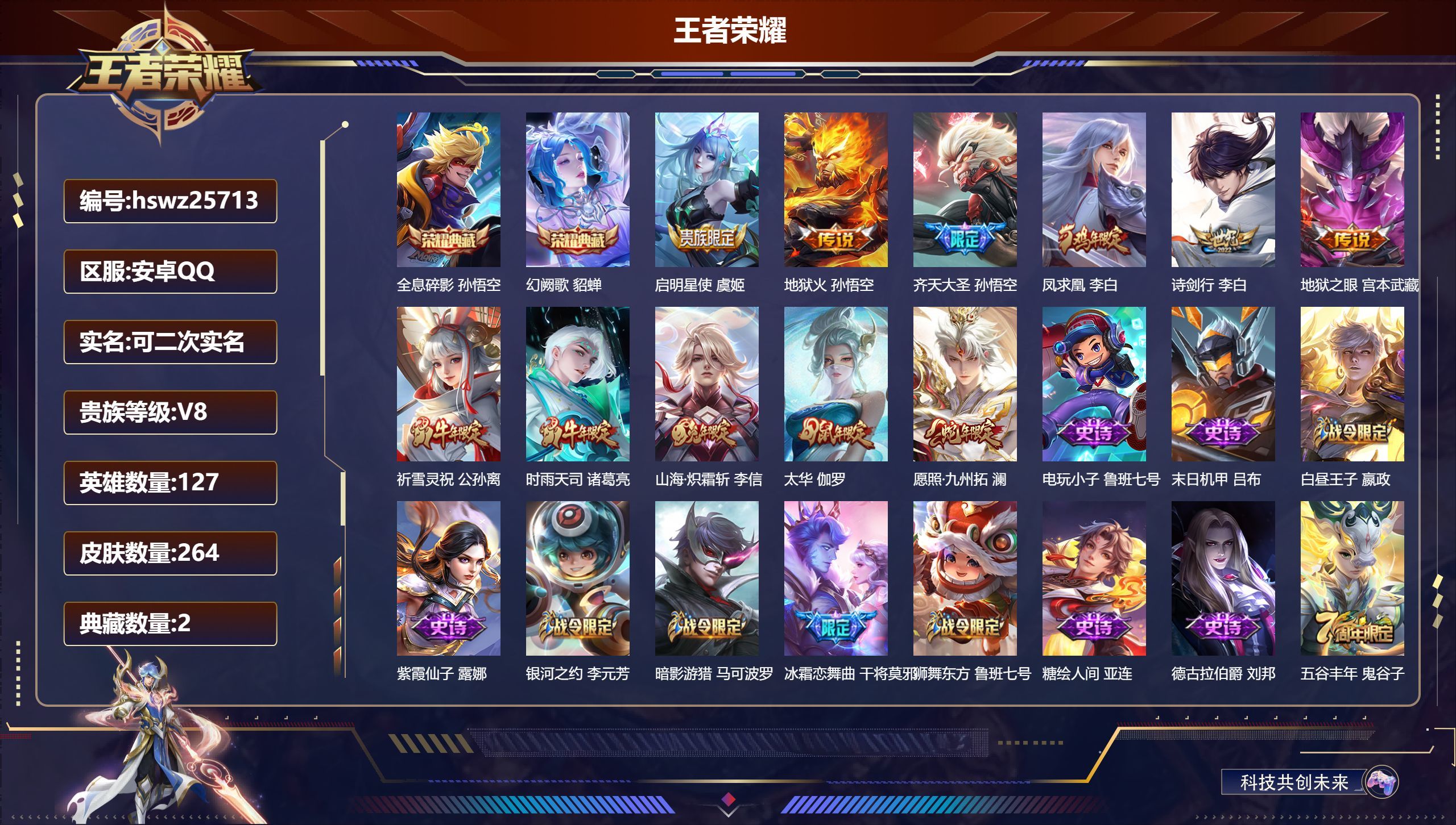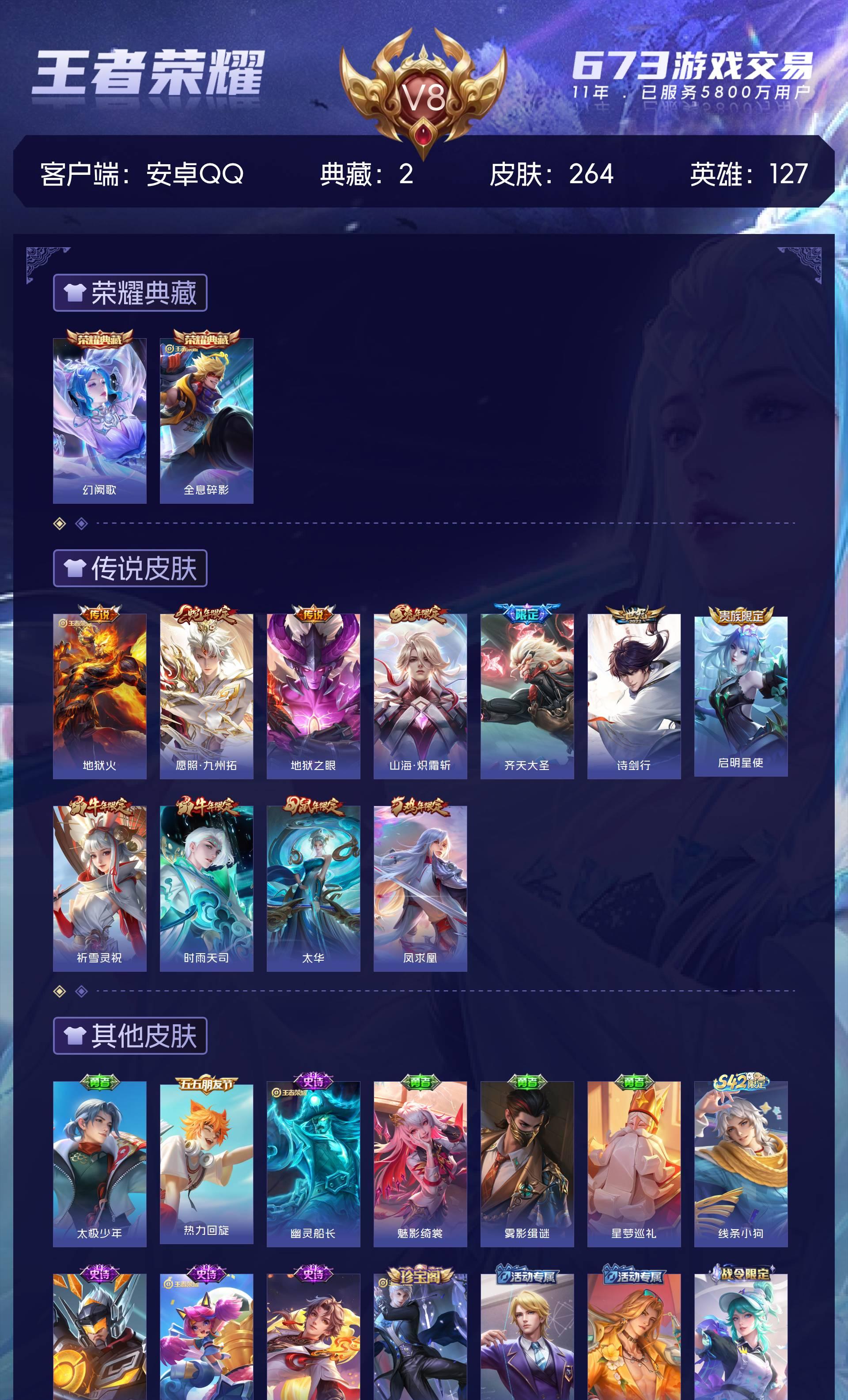 安卓QQ/永恒钻石/264皮肤/127英雄/2典藏/0珍品无双/0无双/0珍品传说/11传说/70史