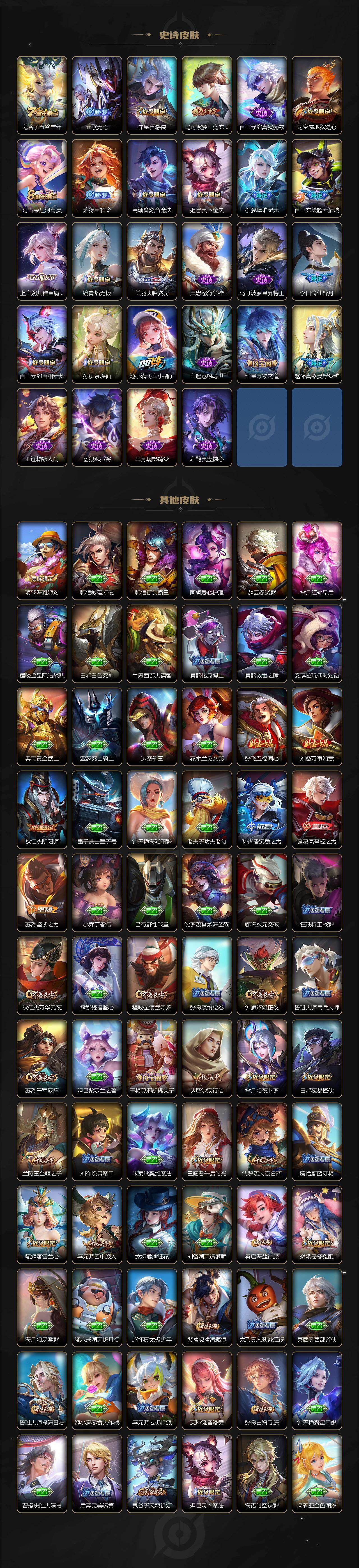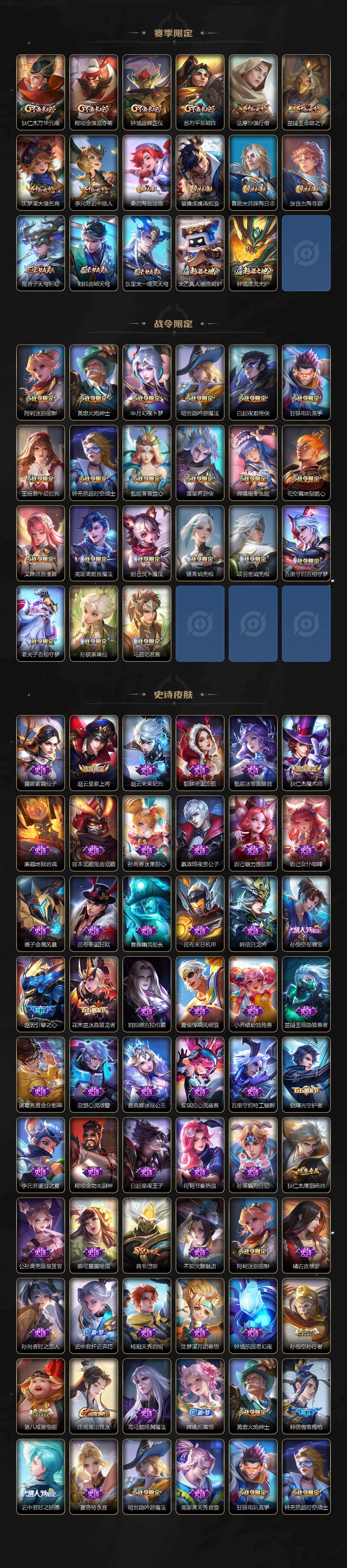 【传说皮肤】:司空震愿照山河定,女娲愿照千秋盛,妲己愿照众生和,澜愿照九州拓,蔡文姬愿照福禄聚,虞姬愿照岁时盈,云缨幻光神枪,裴擒虎祥瑞亨通,嬴政玄雷天君,桑启鸣野蒿,吕布怒海麟威,周瑜音你心动,虞姬启明星使,孙悟空零号赤焰,曜云鹰飞将,李信一念神魔,花木兰冠军飞将,貂蝉仲夏夜之梦