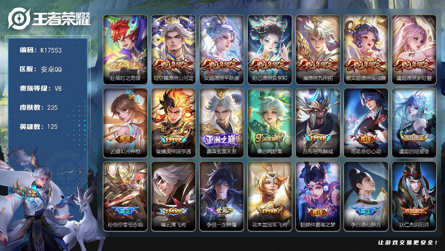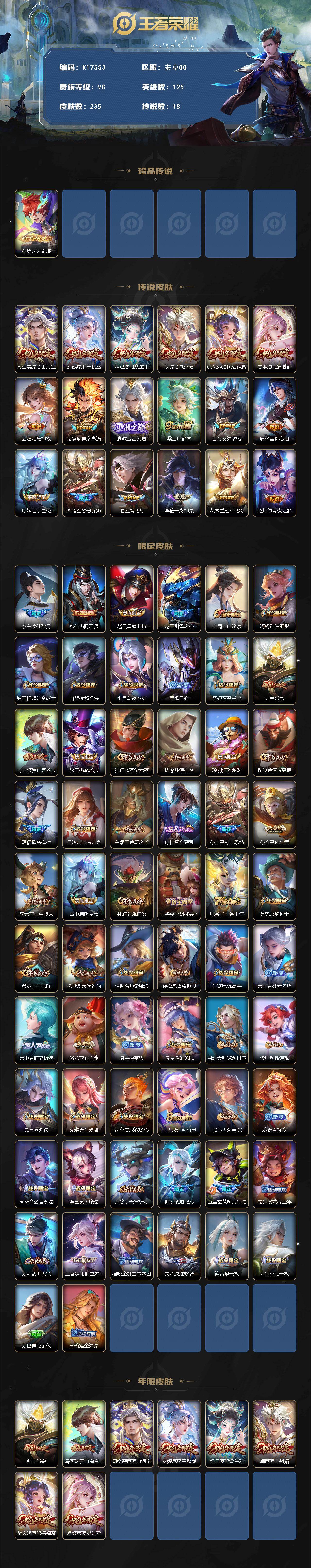 安卓Q-V8-至尊星耀IV段位-125英雄-235皮肤-1珍品传说-18传说-87史诗