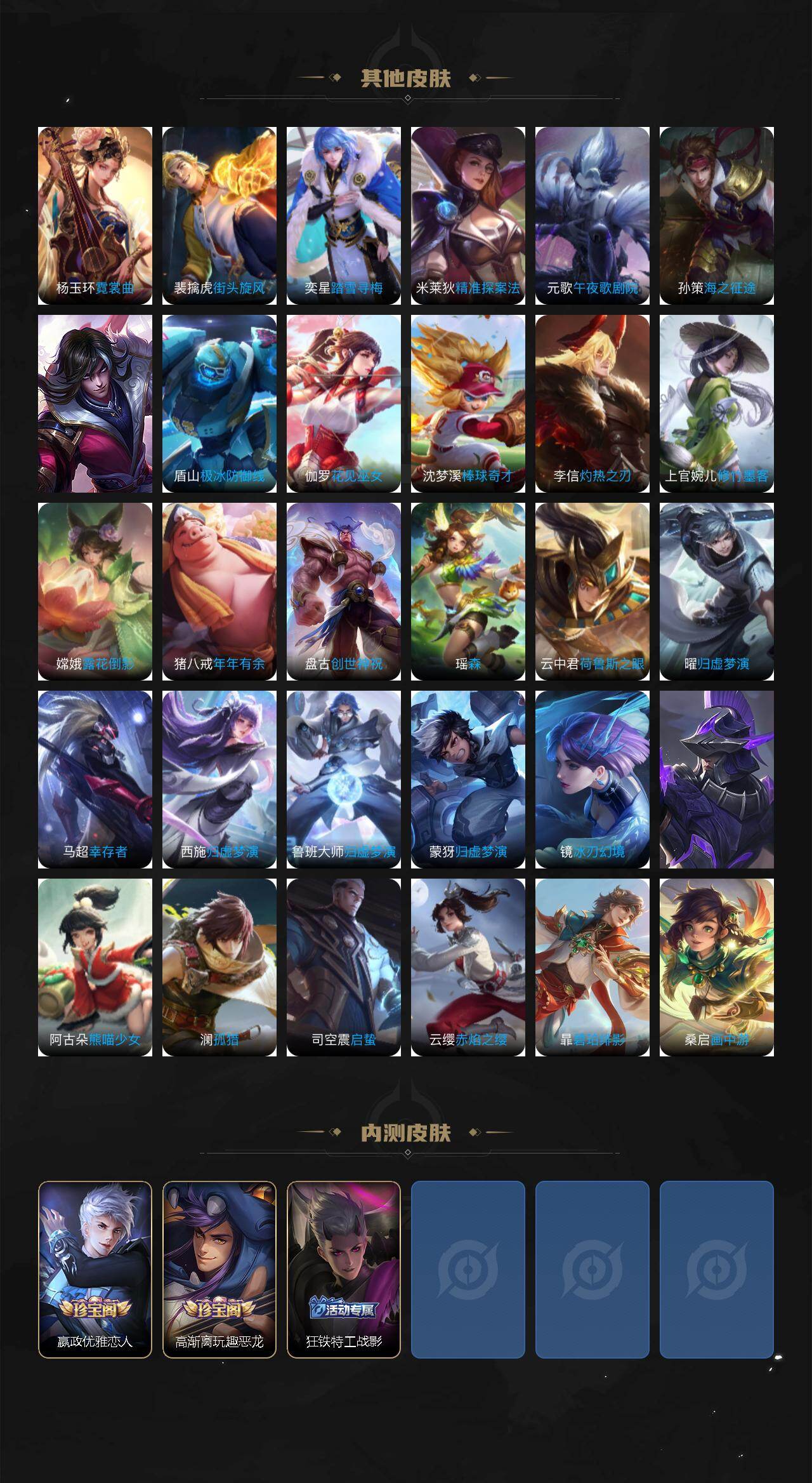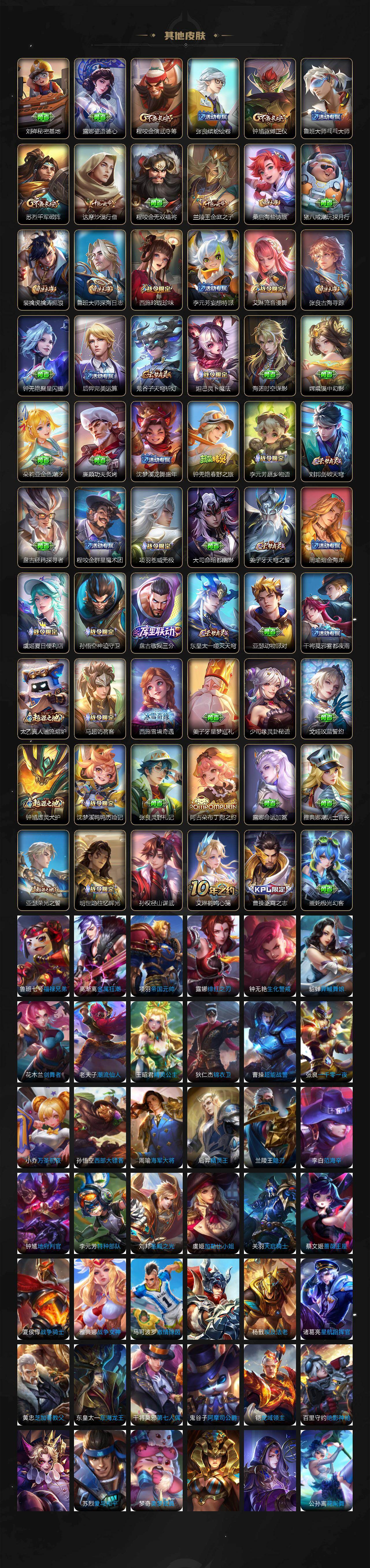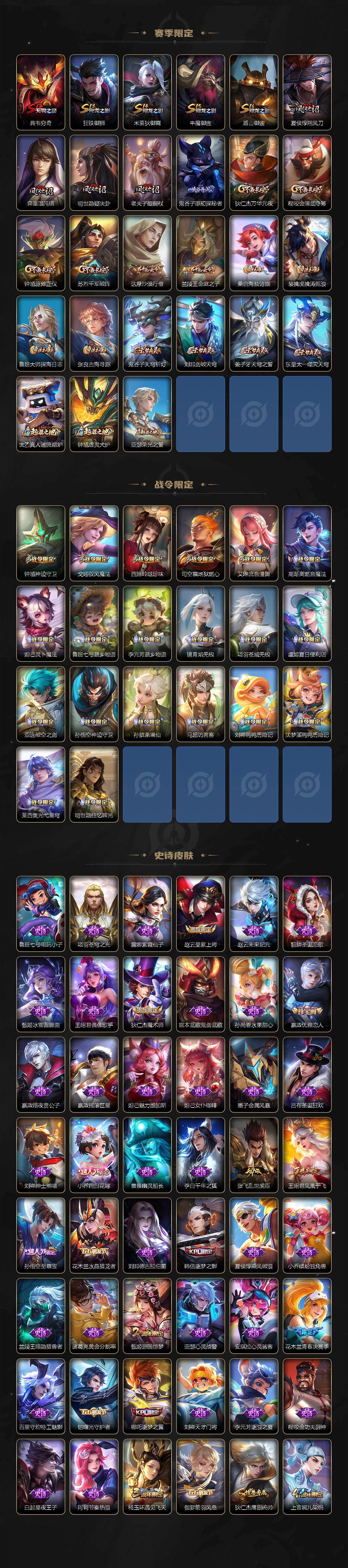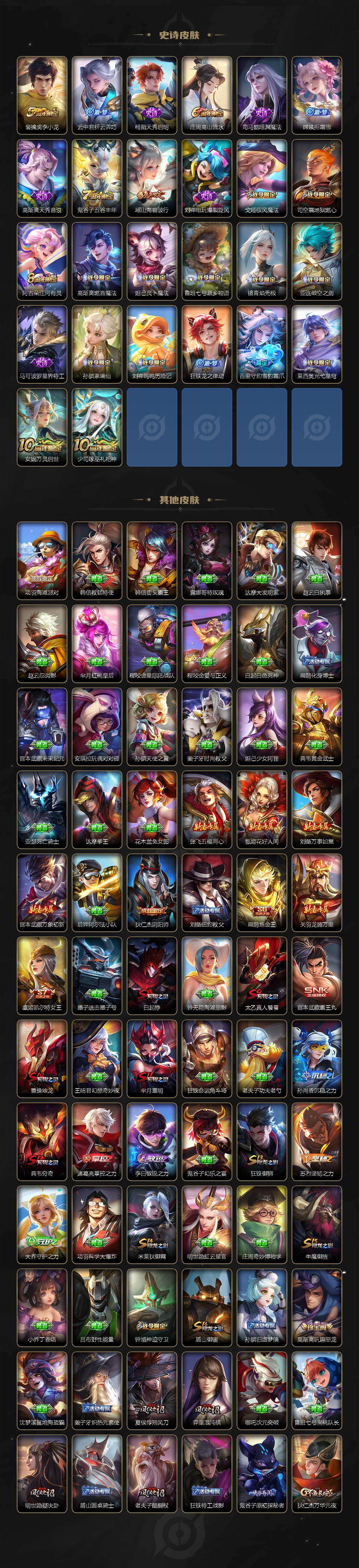 【限定皮肤】:白起狰,虞姬夏日便利店,姜子牙天穹之誓,狄仁杰阴阳师,小乔纯白花嫁,虞姬凯尔特女王,小乔山海琳琅生,赵云皇家上将,嬴政优雅恋人,庄周高山流水,高渐离玩趣恶龙,扁鹊炼金王,芈月重明