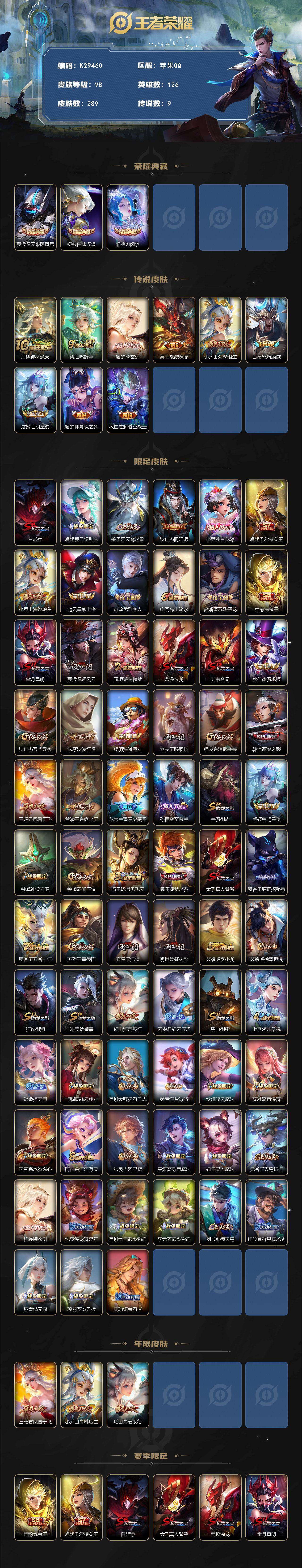 V8-最强王者段位-126英雄-289皮肤-3典藏皮肤-9传说-73史诗