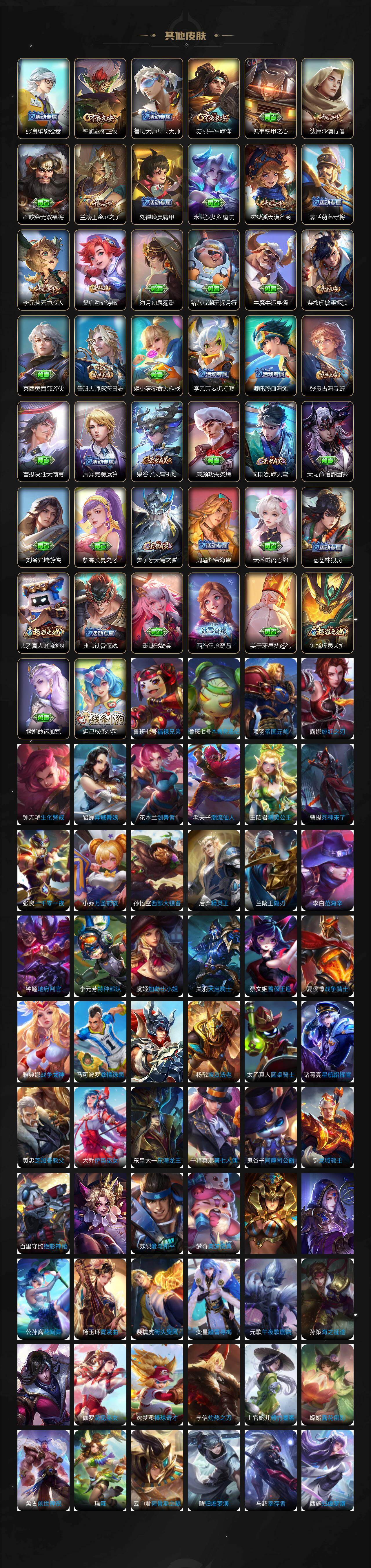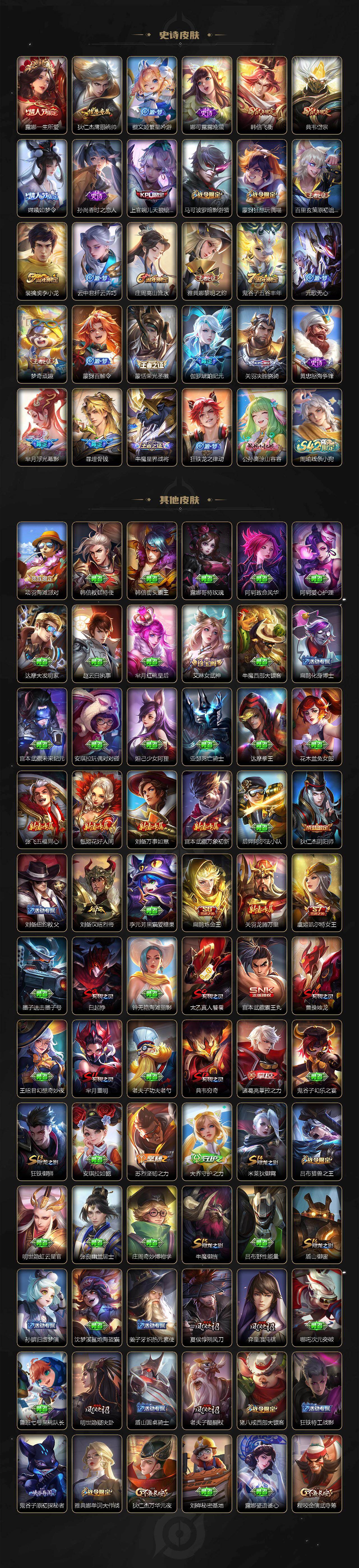【限定皮肤】:白起狰,暃埋骨钱,大乔绒语心约,姜子牙天穹之誓,狄仁杰阴阳师,虞姬凯尔特女王,赵云皇家上将,嬴政优雅恋人,嬴政白昼王子,庄周高山