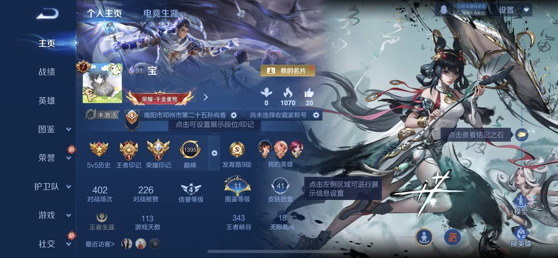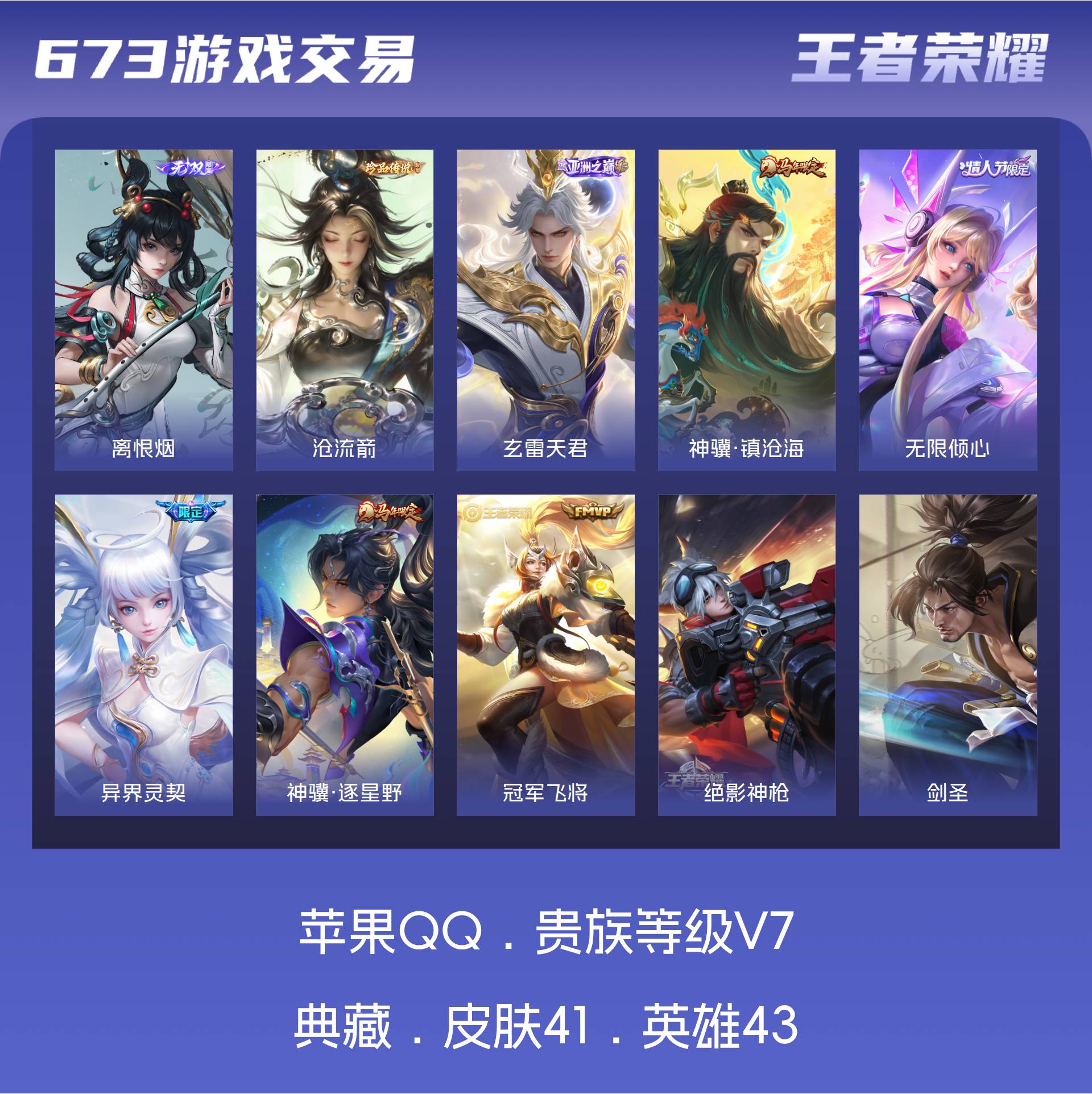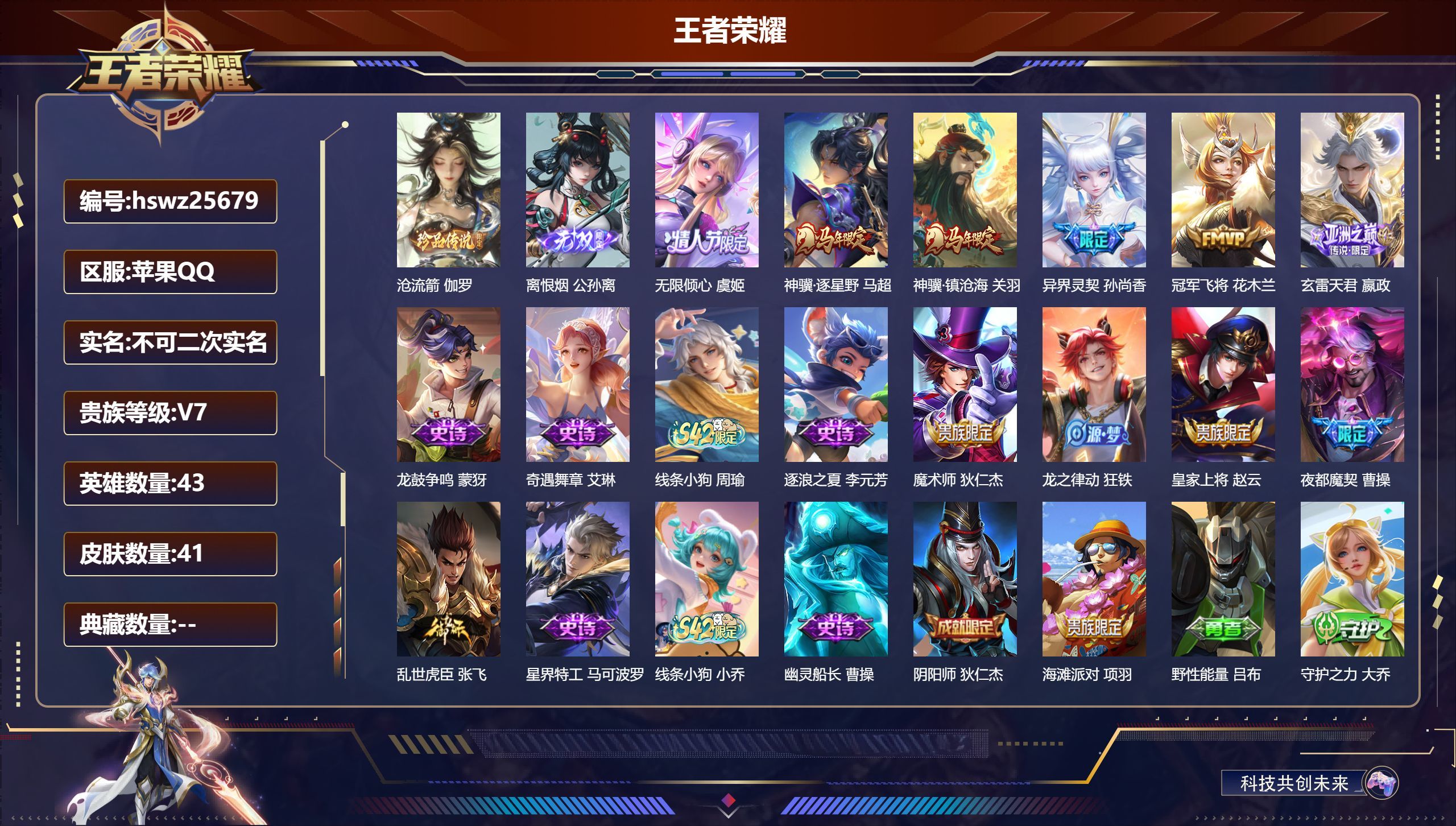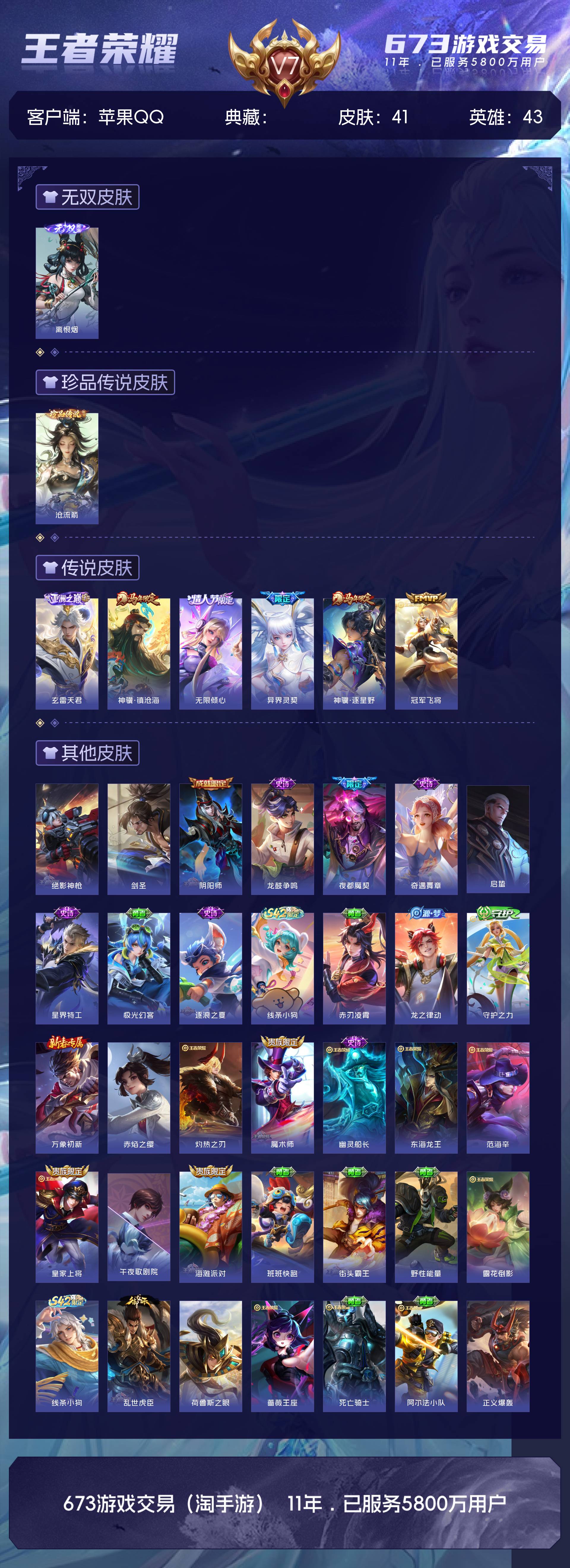 苹果QQ/荣耀王者/41皮肤/43英雄/0典藏/0珍品无双/1无双/1珍品传说/6传说/12史诗/4