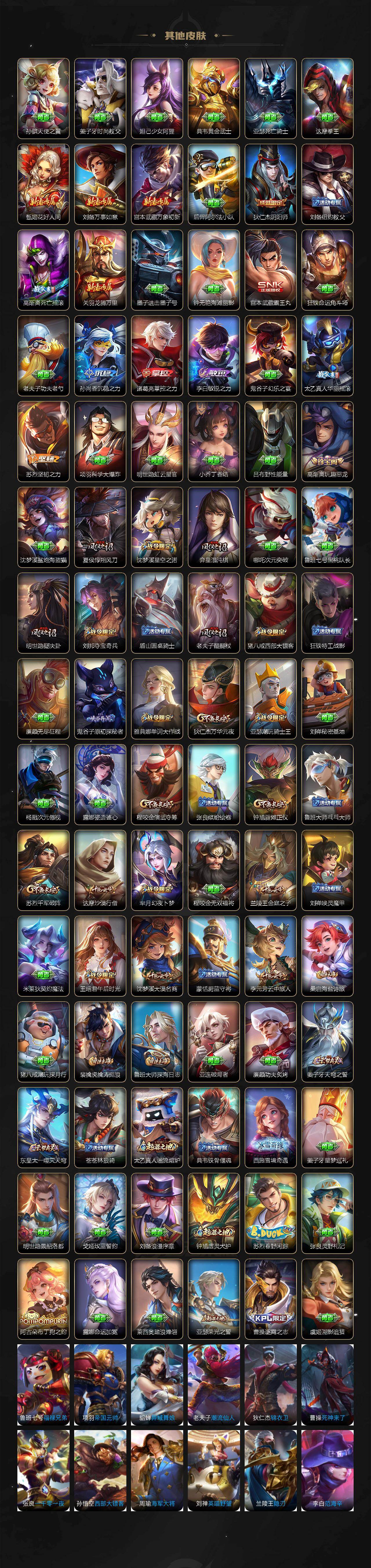 【限定皮肤】:姜子牙天穹之誓,狄仁杰阴阳师,赵云皇家上将,赵云龙胆,赵云百木心枪,嬴政优雅恋人,高渐离死亡摇滚,高渐离玩趣恶龙,阿轲迷踪丽影,芈月幻夜卜梦,元歌云间偶戏,元歌无心,夏侯惇朔风刀,马可