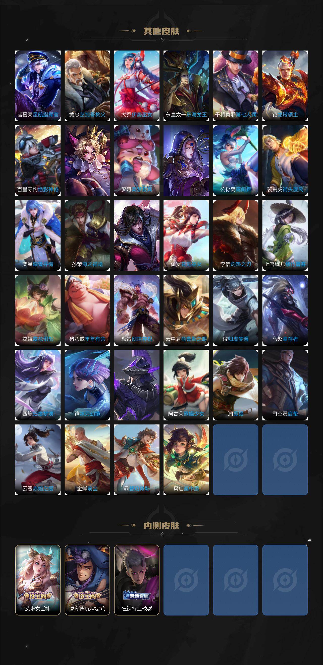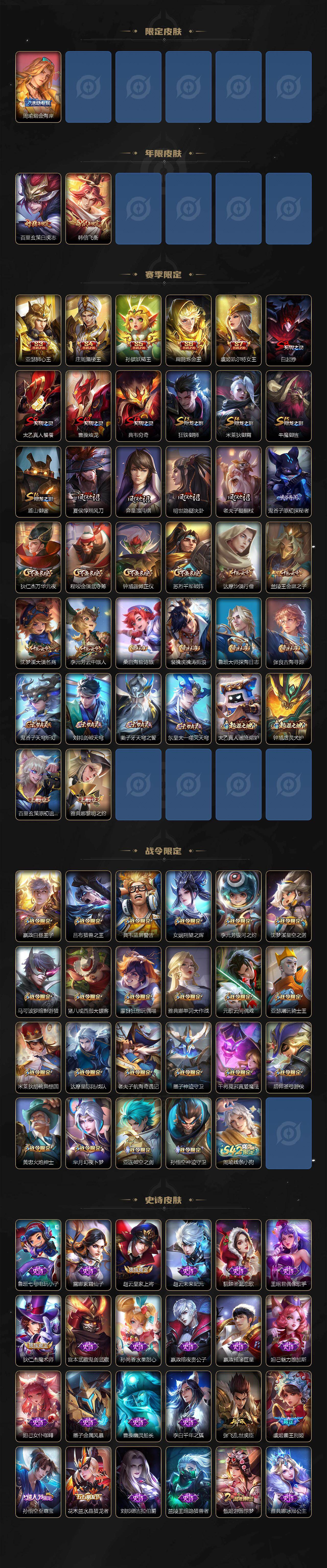 【限定皮肤】:白起狰,姜子牙天穹之誓,狄仁杰阴阳师,虞姬凯尔特女王,赵云皇家上将,墨子神迹守卫,嬴政白昼王子,庄周蜃楼王,庄周云端筑梦师,庄周高山流水,高渐离死亡摇滚,高渐离玩趣恶龙,孙膑妖精王,扁