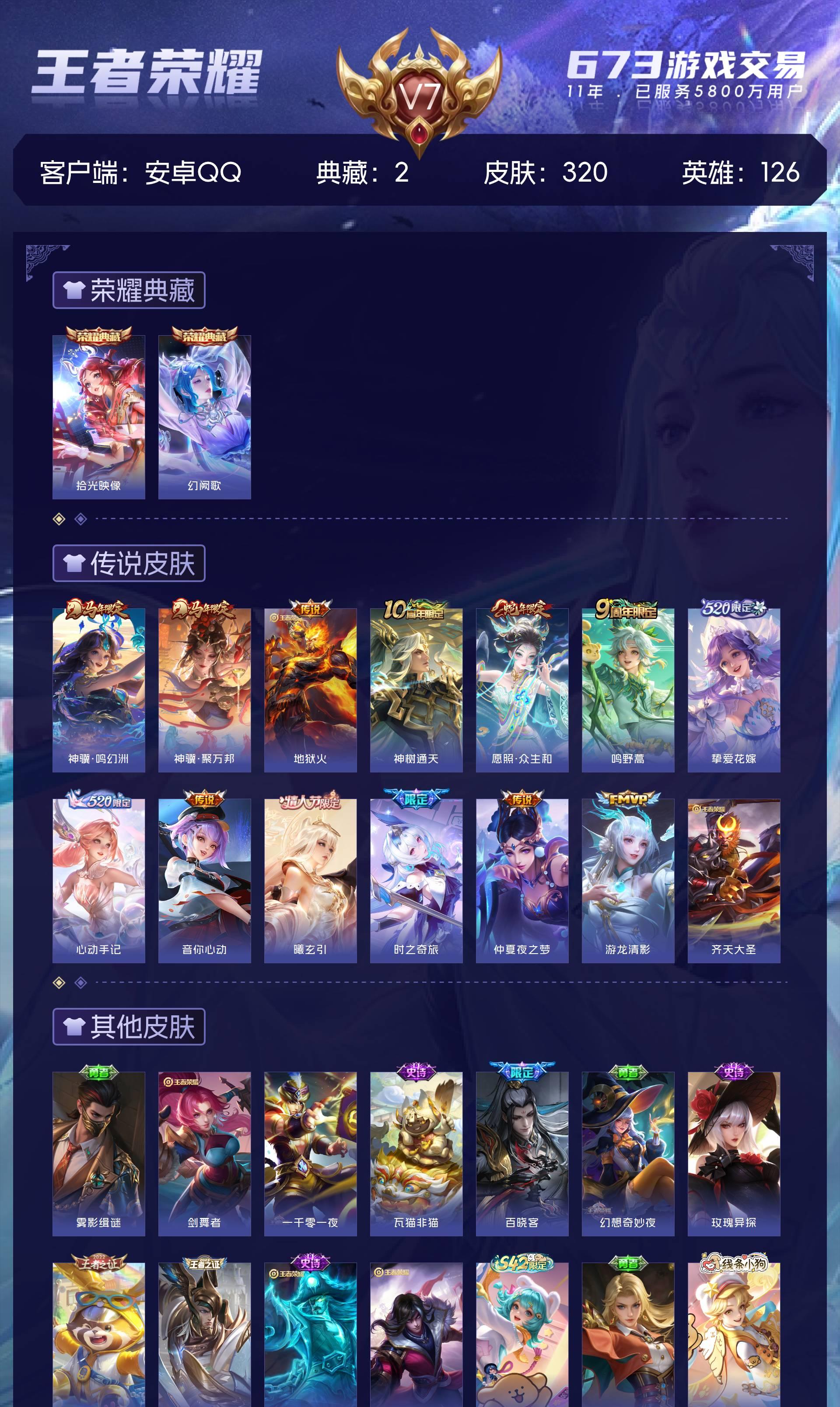 V7 皮肤320 英雄126 无双王者 荣耀典藏2 星传说1 传说14 其他皮肤311