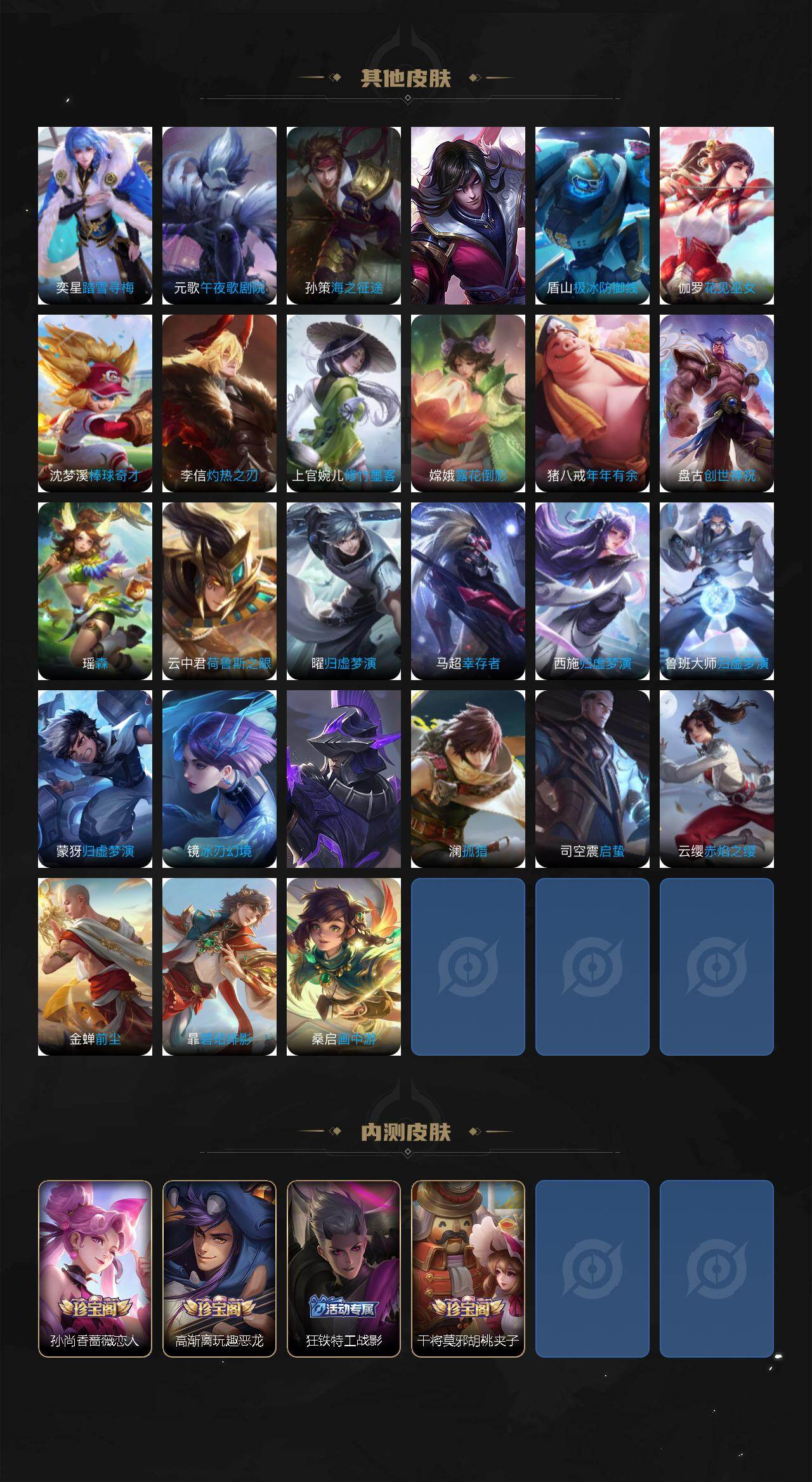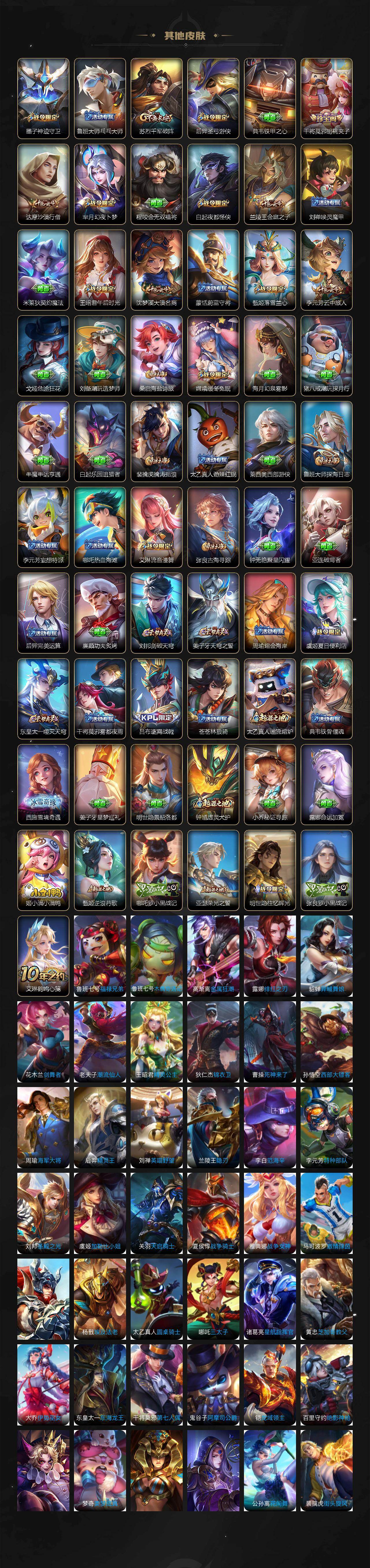 【限定皮肤】:虞姬夏日便利店,姜子牙天穹之誓,狄仁杰阴阳师,赵云皇家上将,墨子神迹守卫,嬴政白昼王子,孙尚香蔷薇恋人,孙尚香异界灵契,鲁班七号狮舞东方,庄周高山流水,高渐离玩趣恶龙,钟无艳超时空战士,白起夜都怪侠,芈月重明,芈