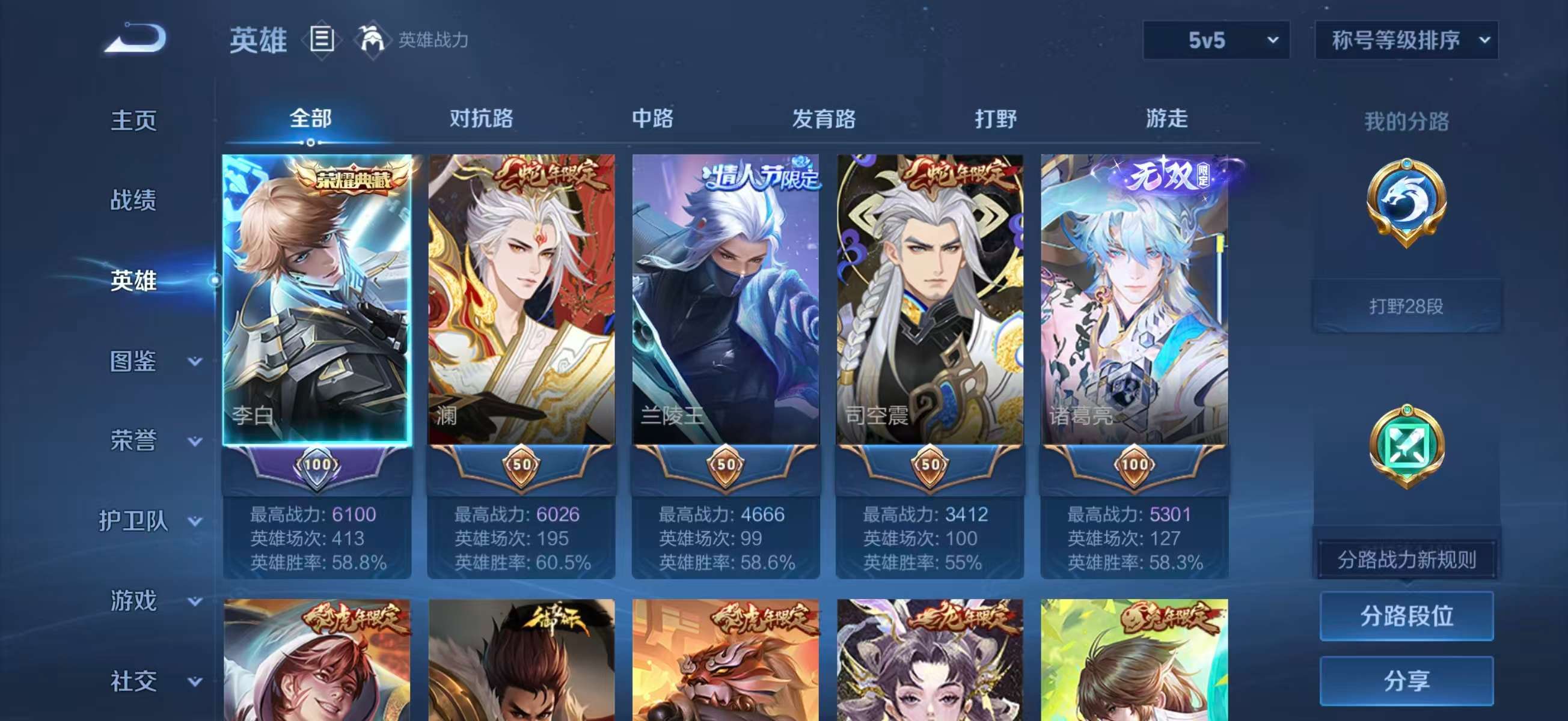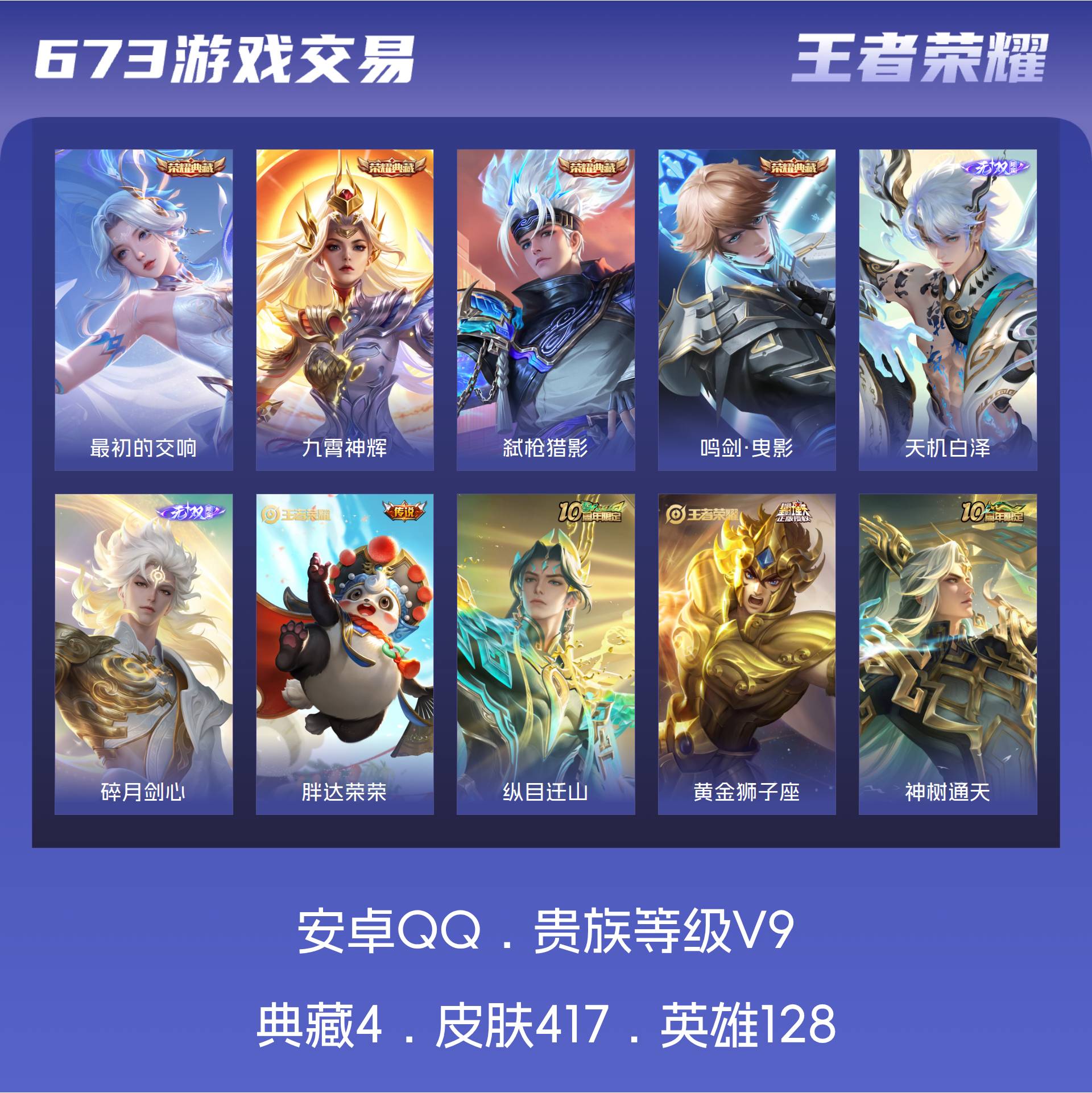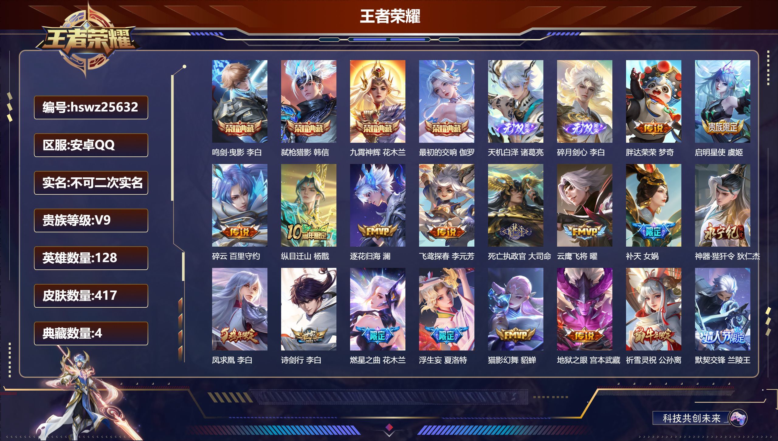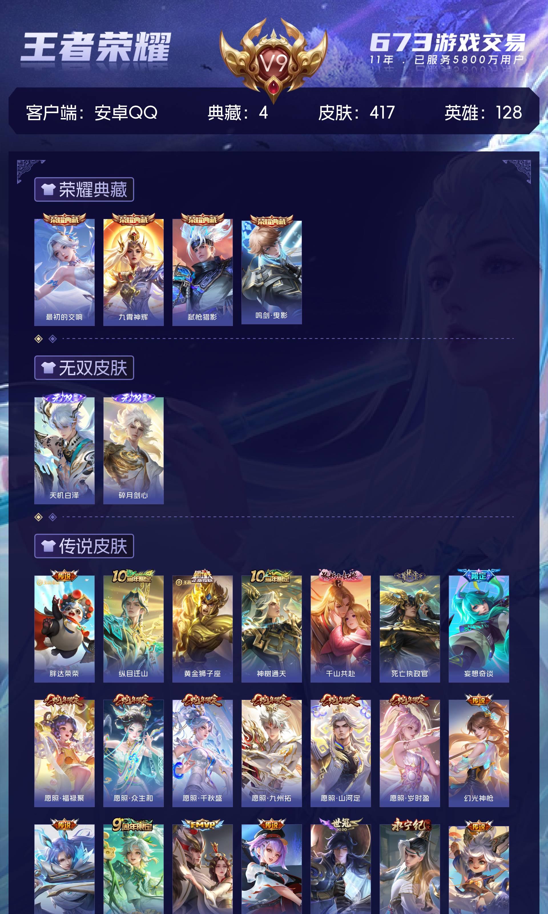 安卓QQ/最强王者/417皮肤/128英雄/4典藏/0珍品无双/2无双/0珍品传说/46传说/137