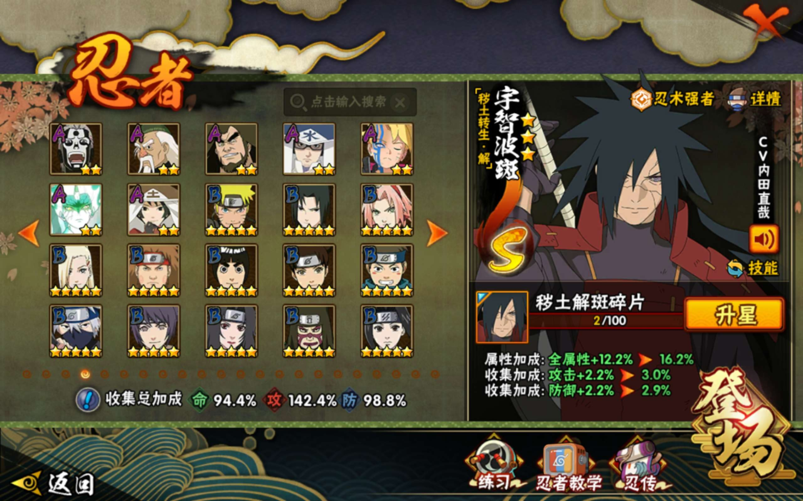 【S级忍者】旗木卡卡西「须佐能乎」(3星),自来也「传说中的三忍」(3星),宇智波斑「秽土转生·解」(3星),宇智波佐助「永恒万花筒」(3星),宇智波止水「须佐能乎」(3星),长门「秽土转