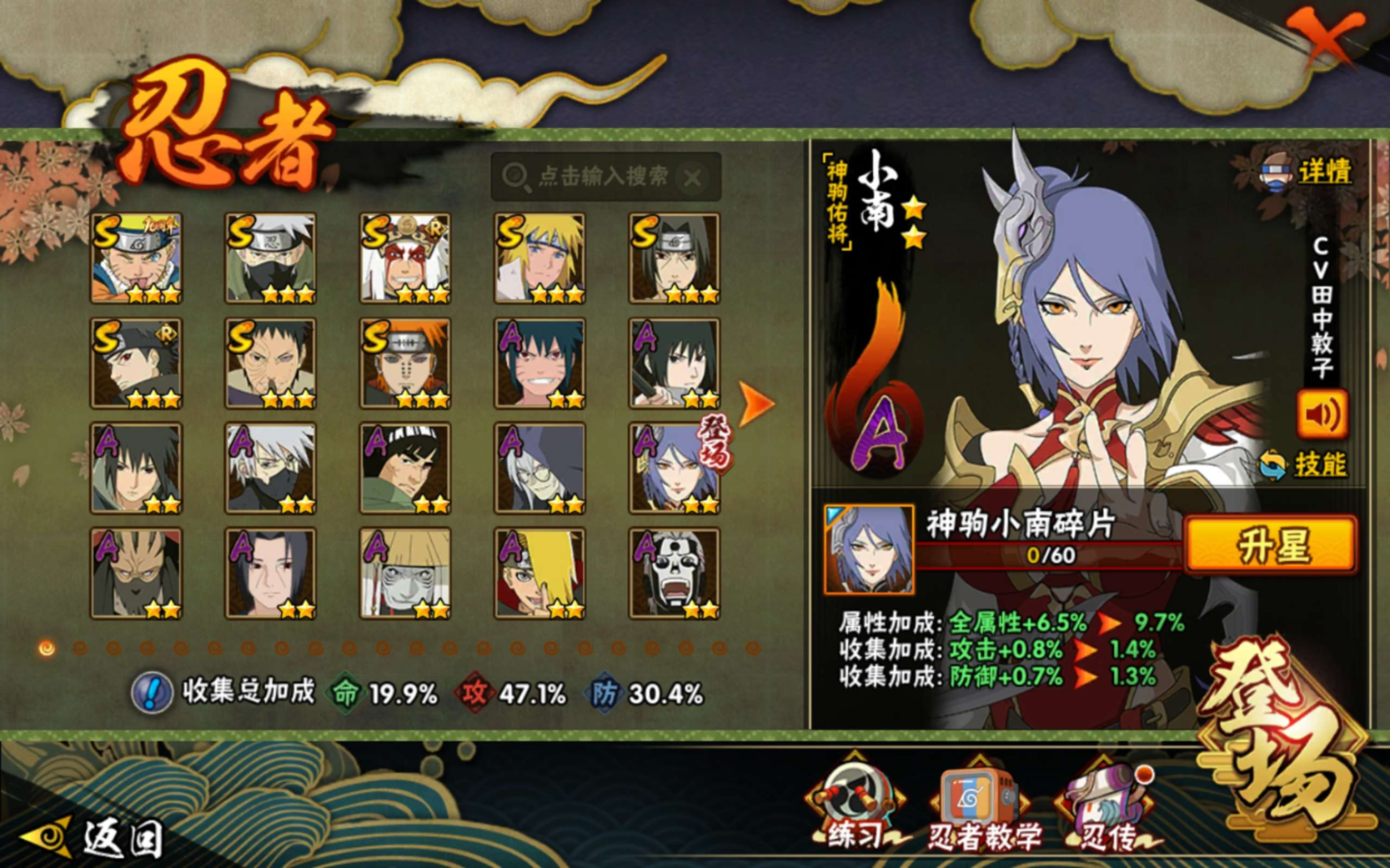 【S级忍者】宇智波带土「忍界大战」(3星),旗木卡卡西「须佐能乎」(3星),宇智波止水「须佐能乎」(3星),自来也「舞之豪杰」(3星),宇智波鼬「须佐能乎」(3星),漩涡鸣人·宇智波佐助(3星),佩恩「天道」(3星),波风水门(3星),
