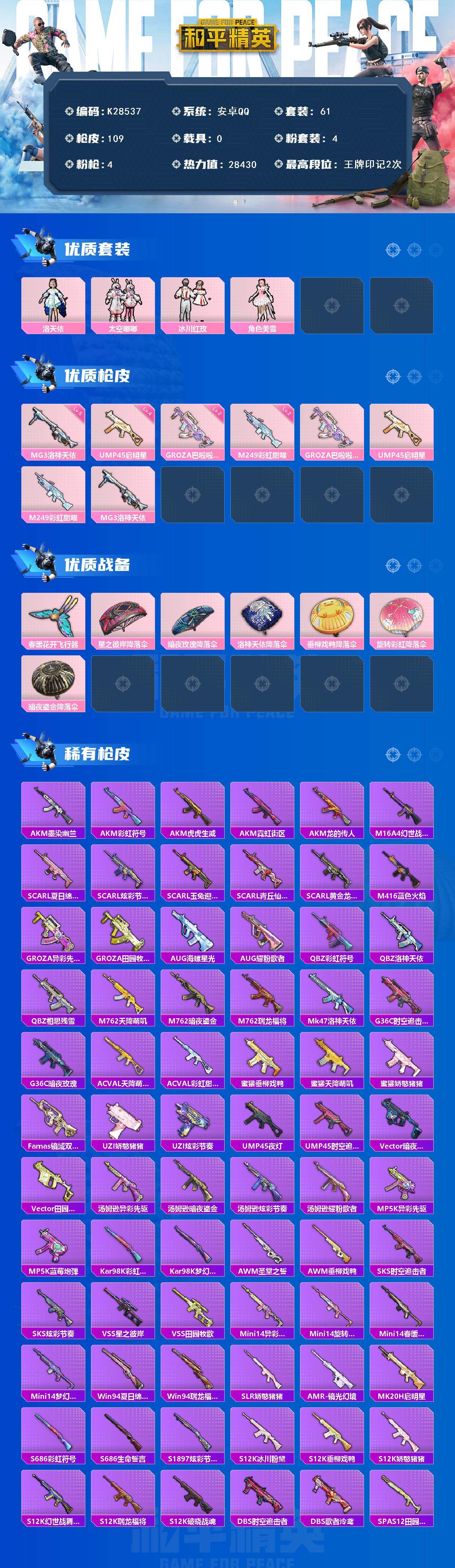 安卓 手Q-4粉装-4特效枪-0载具-1粉色飞行器-28430热力值-2王牌印记-61套装-109枪皮