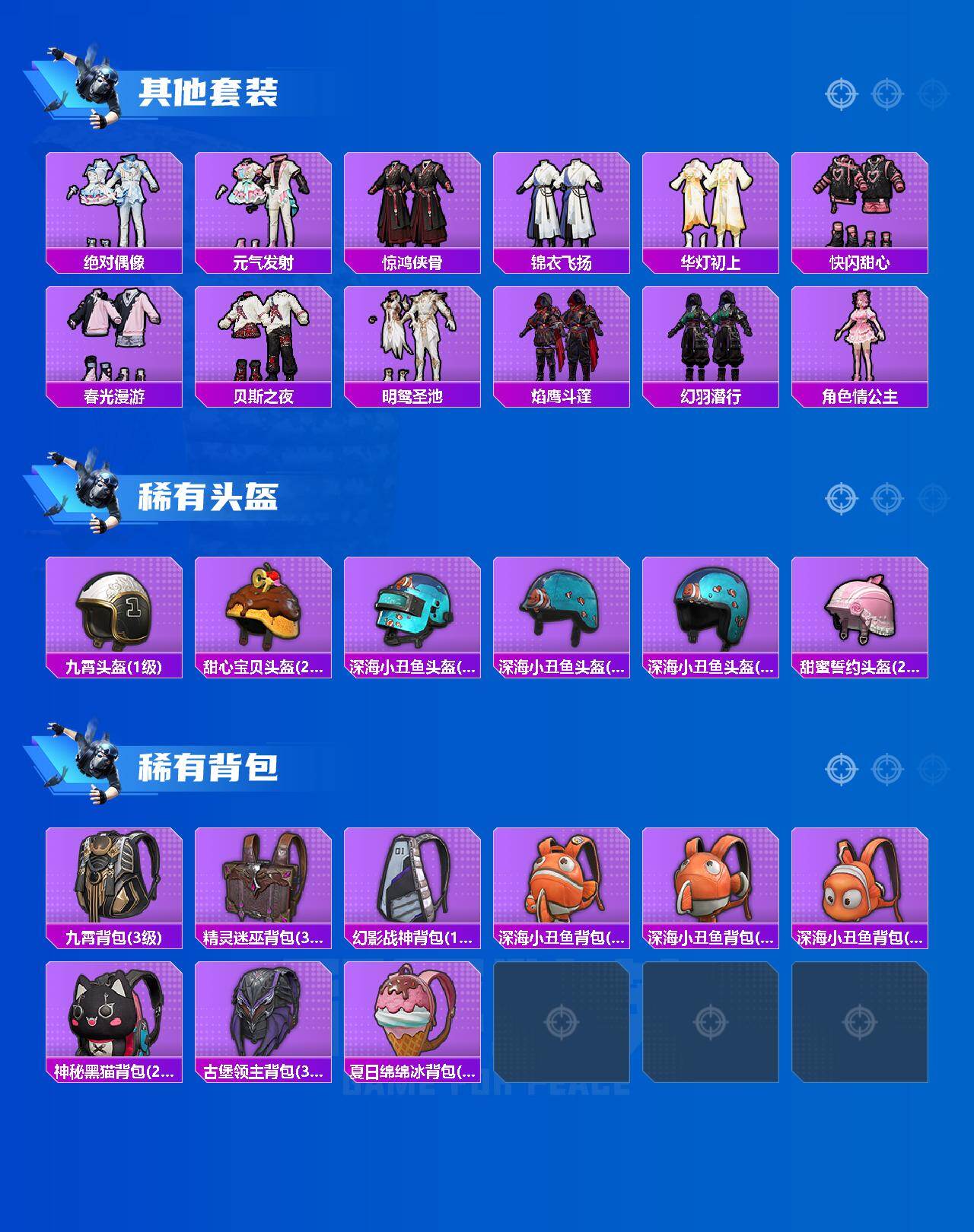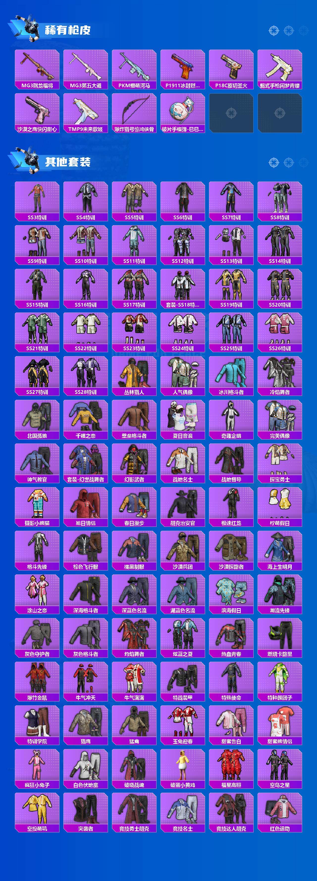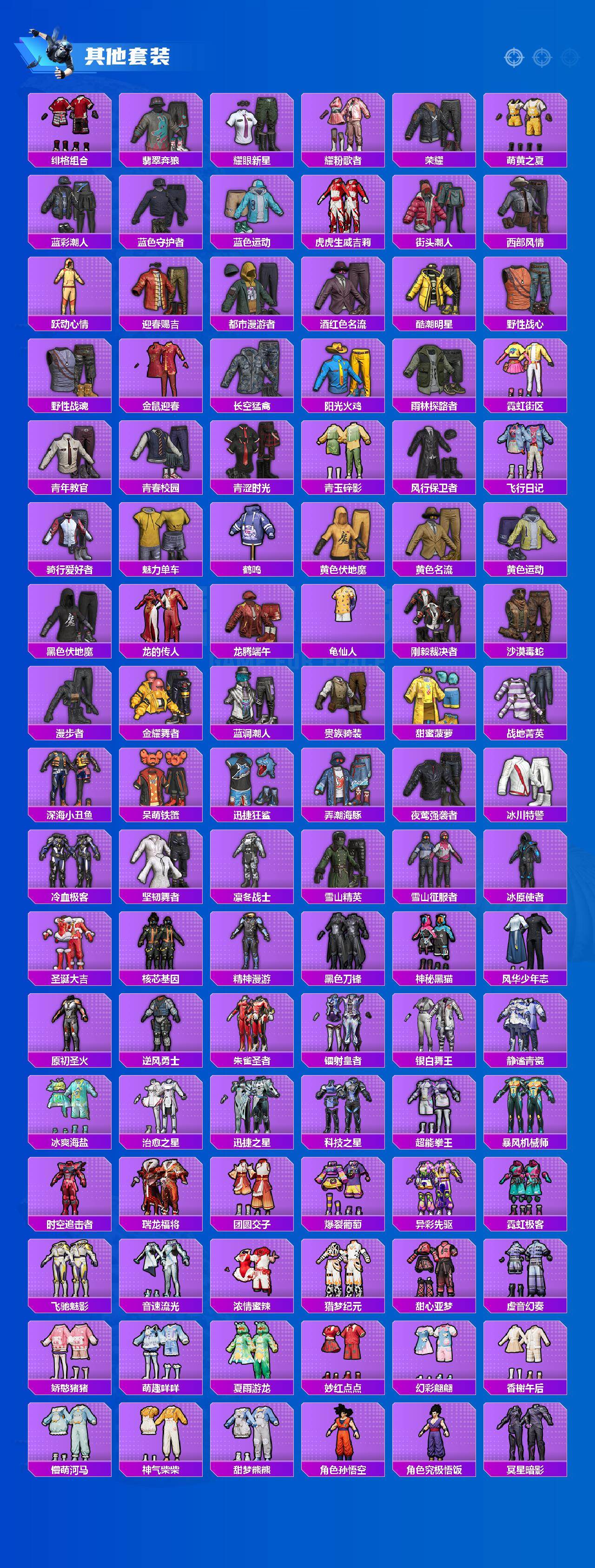 【粉色套装】:粉装-缤纷油彩,粉装-绚金战神,粉装-银刃赛罗,角色-复仇流浪者,粉装-天星战神,粉装-天幕蝎影,角色-圣堂之誓