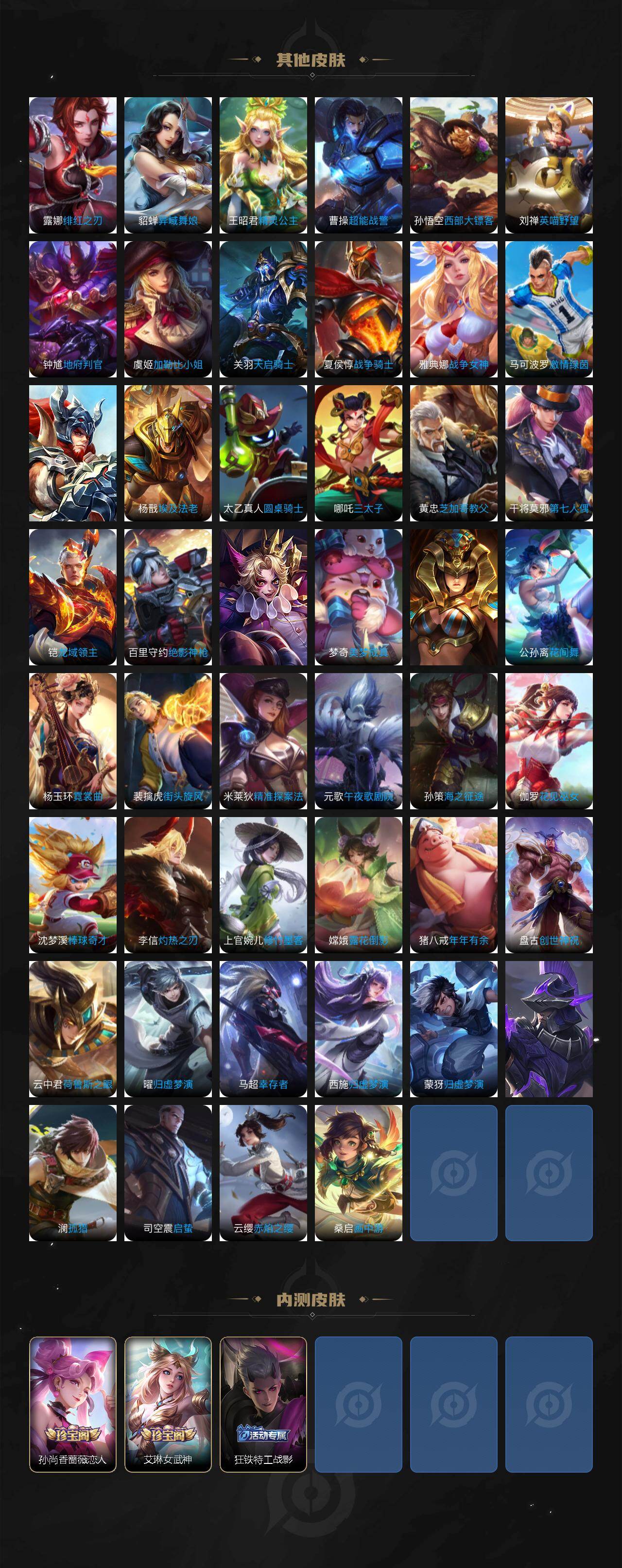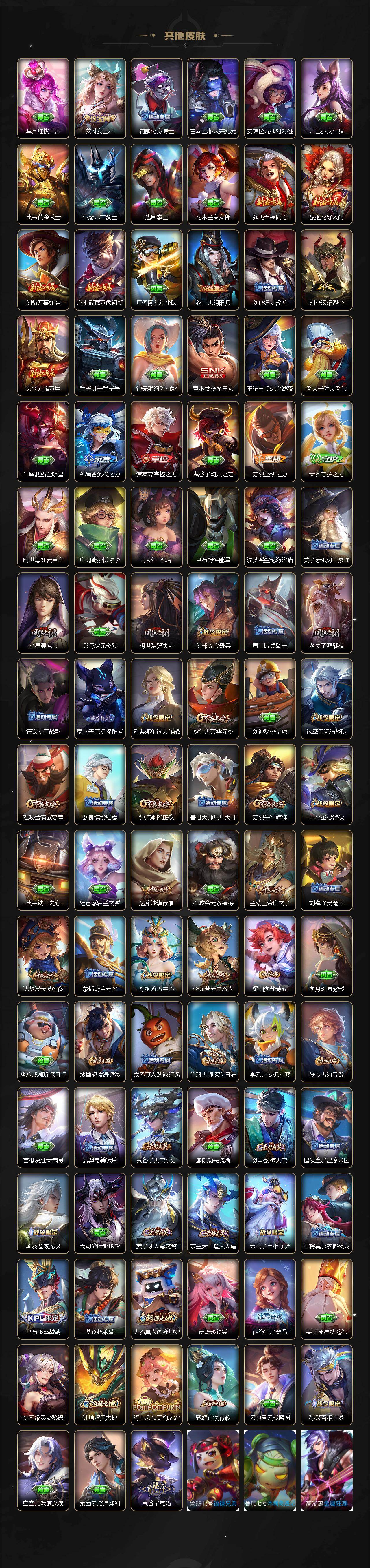 【传说皮肤】:桑启鸣野蒿,孙悟空齐天大圣,吕布怒海麟威,孙尚香音你闪耀,孙尚香异界灵契,虞姬启明星使,关羽武圣,曜云鹰飞将,李信一念神魔,诸葛