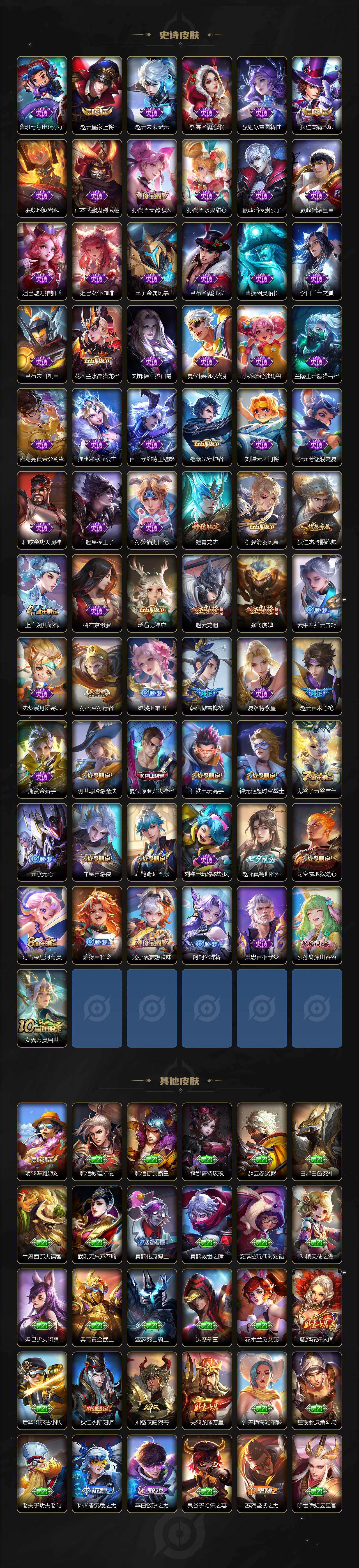 【传说皮肤】:后羿神树通天,澜愿照九州拓,桑启鸣野蒿,马超琥珀纪元,曜山海苍雷引,李信山海炽霜斩,马超无双飞将,铠绛天战甲,李信一念神魔,达摩黄金狮子座,宫本武藏地狱之眼