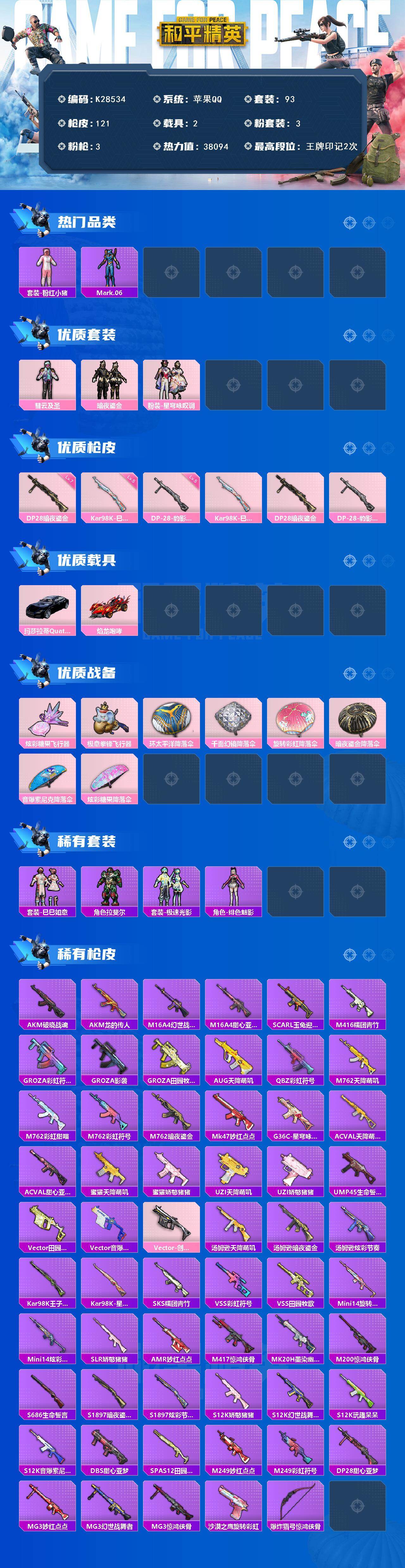 苹果 手Q-3粉装-3特效枪-2载具-2粉色飞行器-38094热力值-2王牌印记-93套装-121枪皮