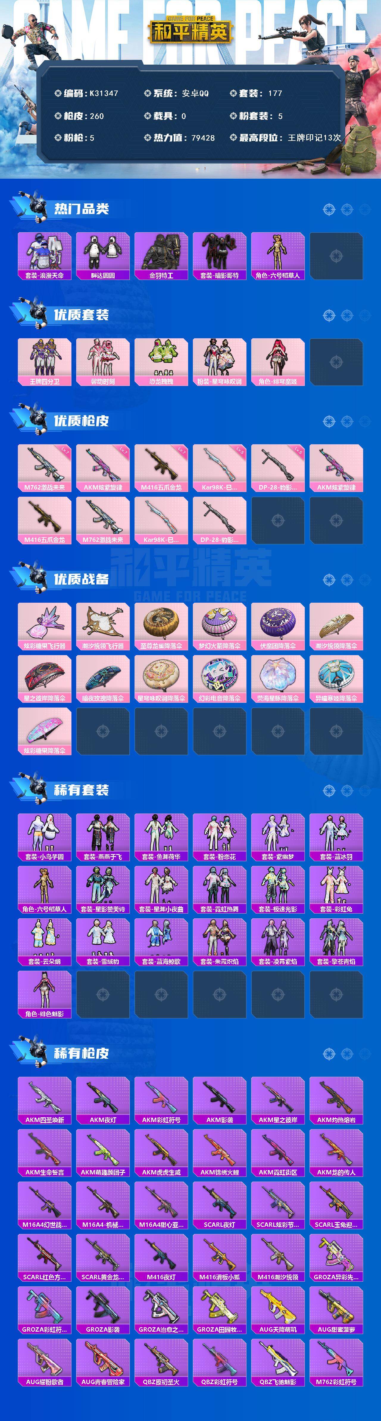安卓 手Q-5粉装-5特效枪-0载具-2粉色飞行器-79428热力值-13王牌印记-177套装-260枪皮