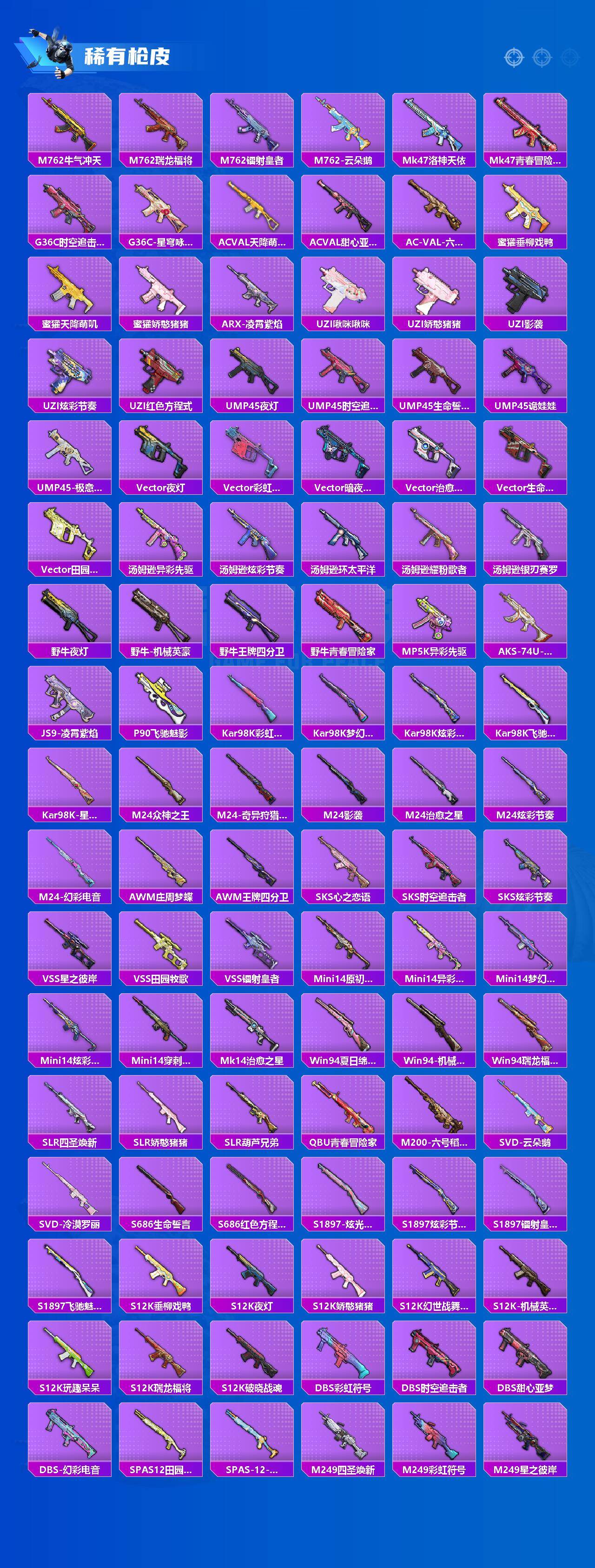 【粉色枪皮等级】:AKM-炫紫旋律(七级),M416-五爪金龙(七级),M762-激战未来(七级),Kar98K-巳巳如意(五级),DP-28-豹影疾电(五级)