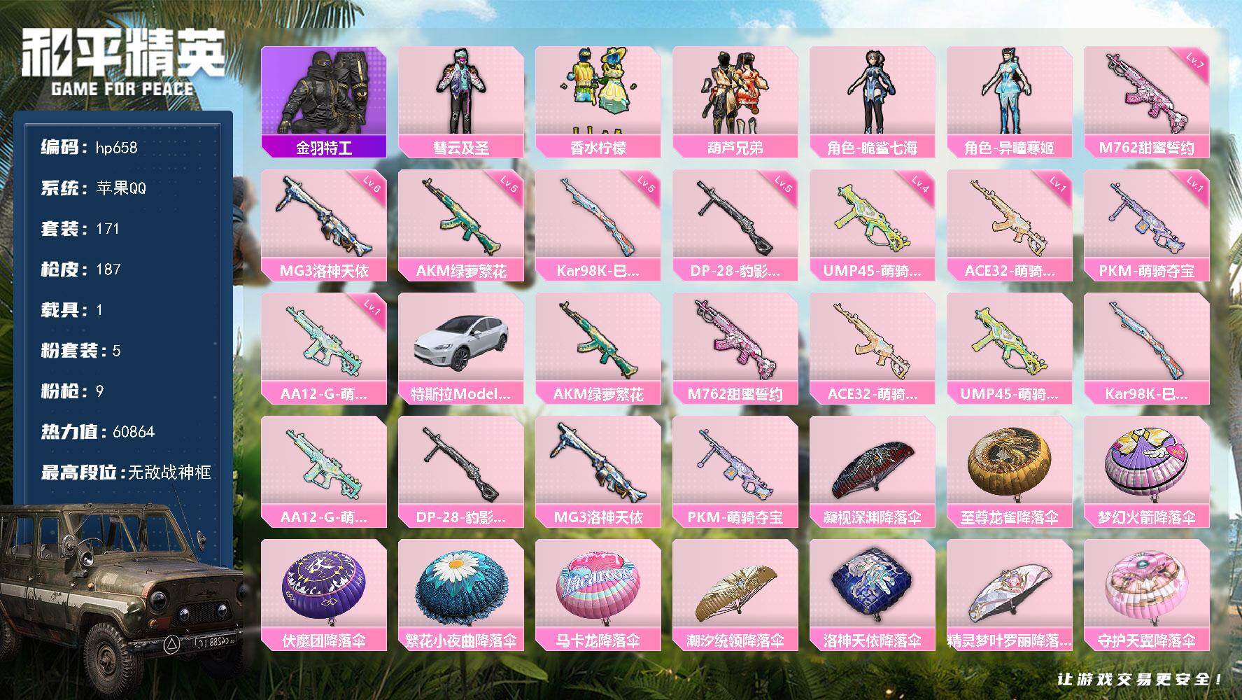 苹果 手Q-无敌战神框-5粉装-9特效枪-1载具-0粉色飞行
