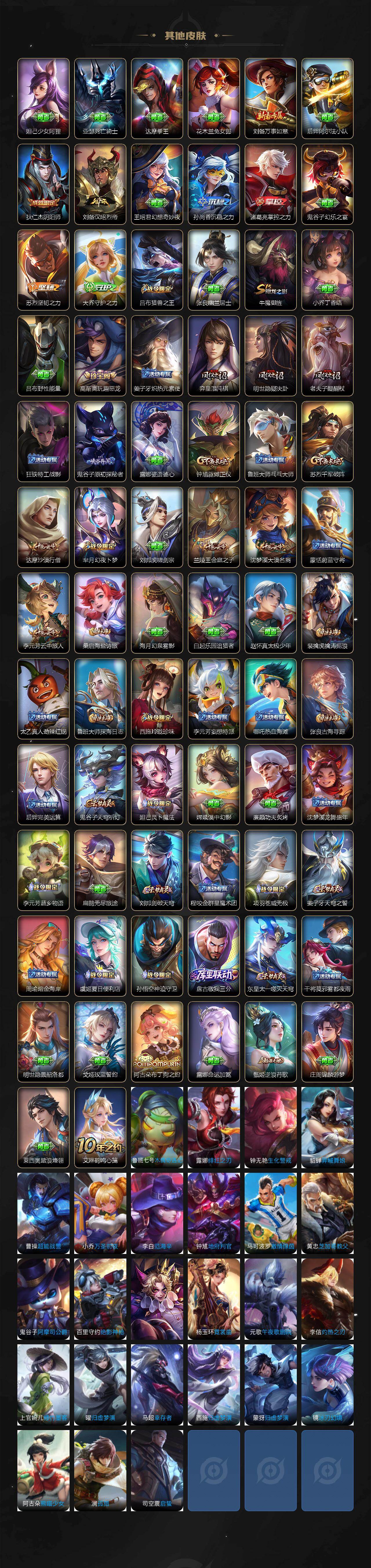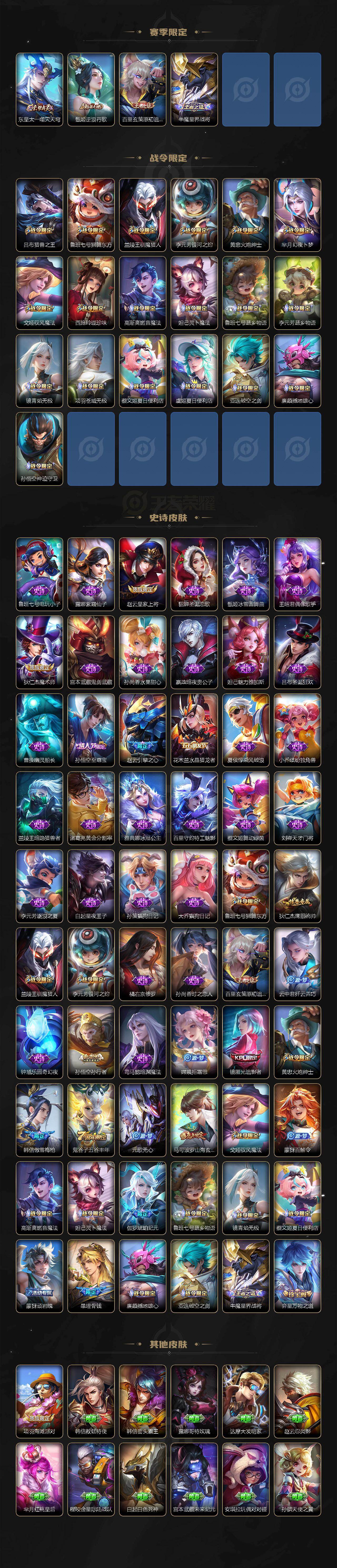 【限定皮肤】:暃埋骨钱,蒙犽顽岩魄,蔡文姬夏日便利店,虞姬夏日便利店,姜子牙天穹之誓,狄仁杰阴阳师,赵云皇家上将,赵云引擎之心,鲁班七号狮舞东方,高渐离玩趣恶龙,芈月幻夜卜梦,吕布猎兽之王,元歌无心,马可波罗山海玄木吟,狄仁杰魔术师,达摩沙漠行僧,项羽海