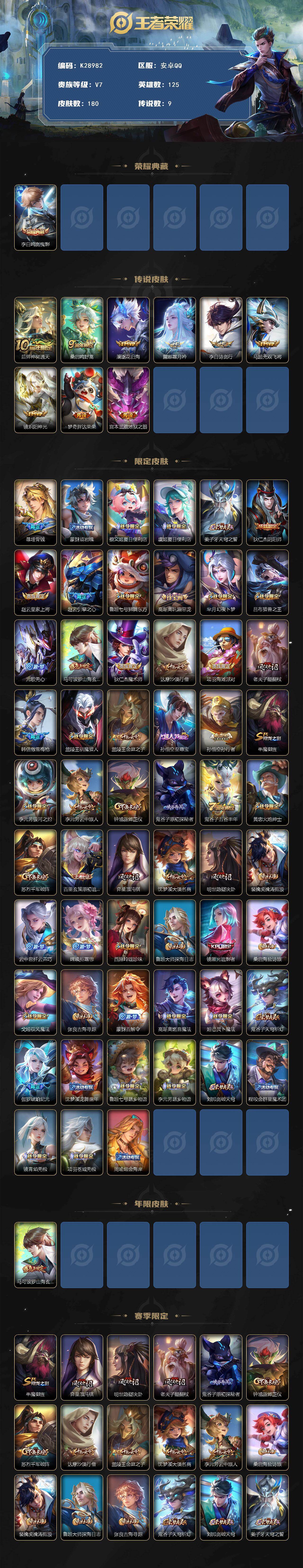 安卓Q-V7-永恒钻石I段位-125英雄-180皮肤-1典藏皮肤-9传说-59史