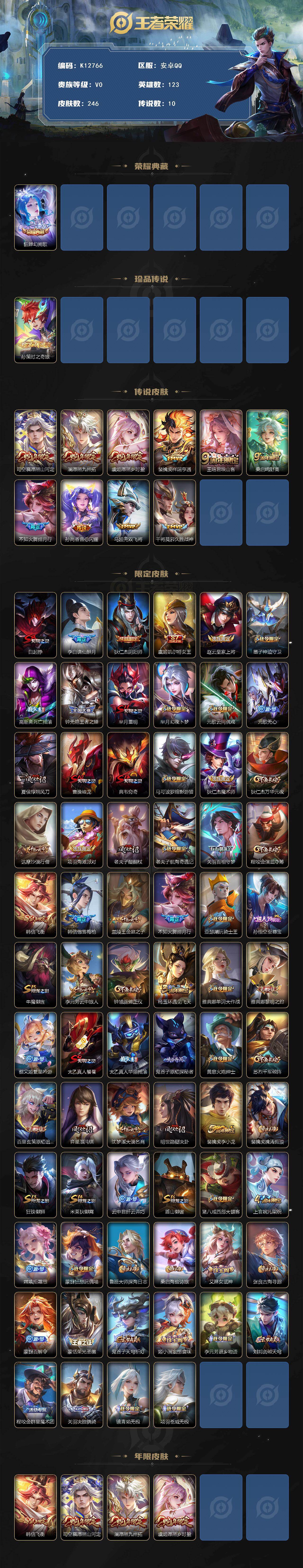 安卓Q-V0-最强王者段位-123英雄-246皮肤-1典藏皮肤-1珍品传说-10传说-72史诗