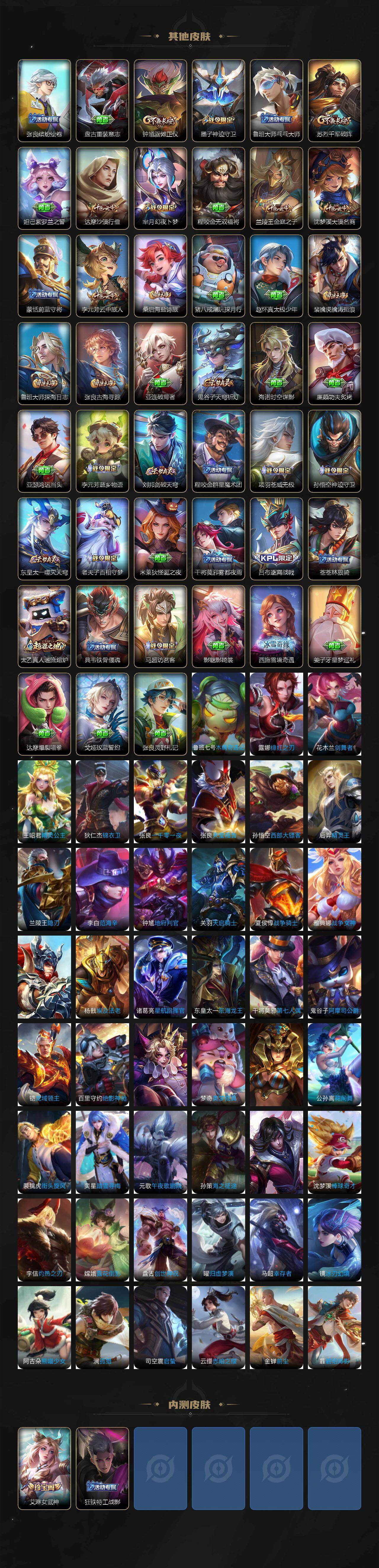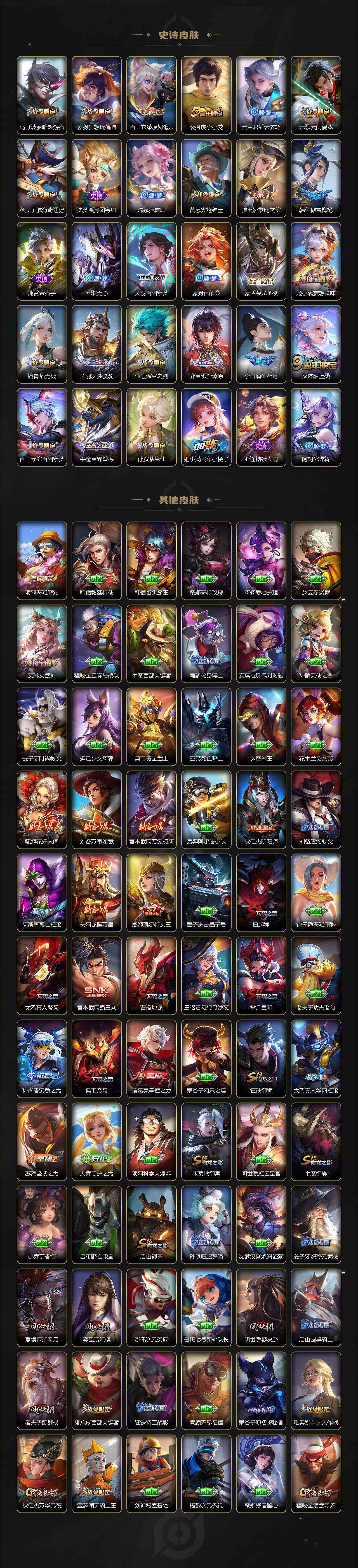 【限定皮肤】:白起狰,李白谪仙醉月,狄仁杰阴阳师,虞姬凯尔特女王,赵云皇家上将,墨子神迹守卫,高渐离死亡摇滚,钟无艳王者之锤,芈月重明,芈月幻夜卜梦,元歌云间偶