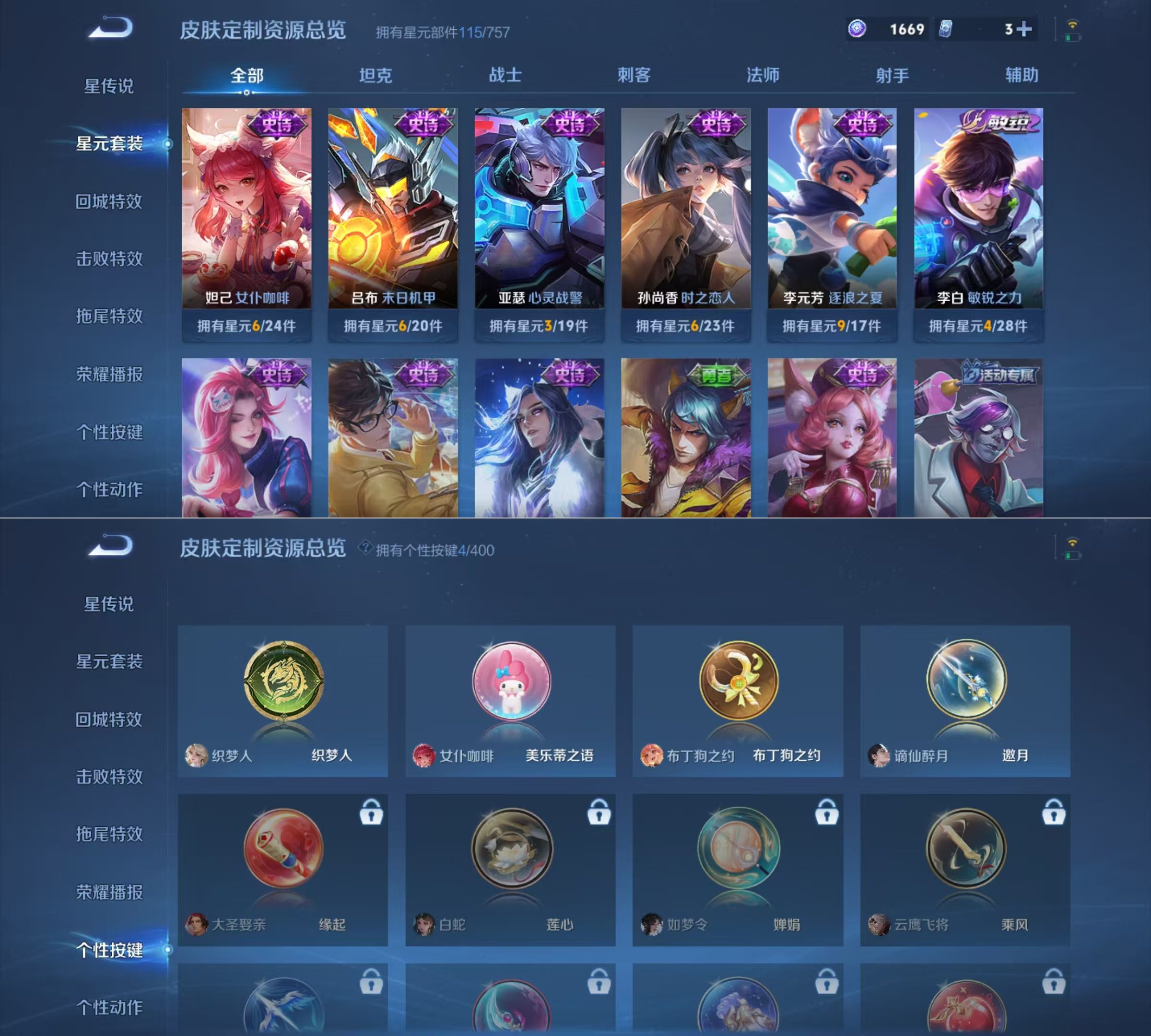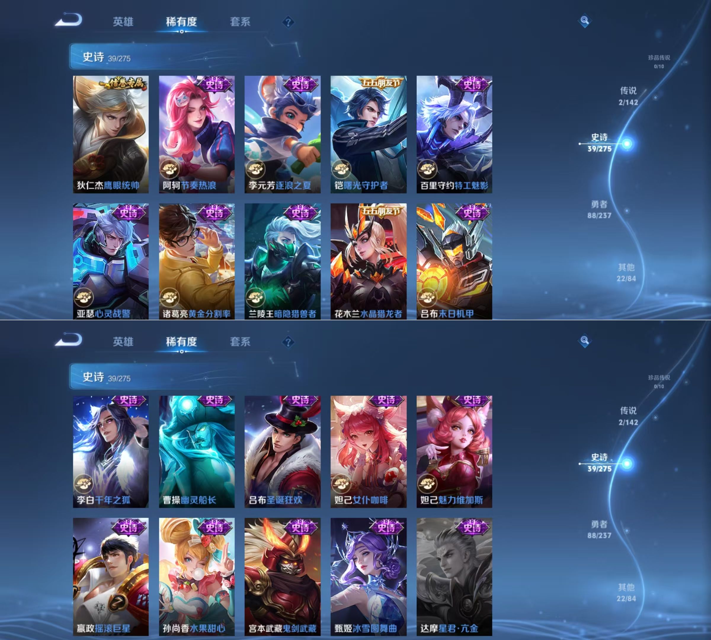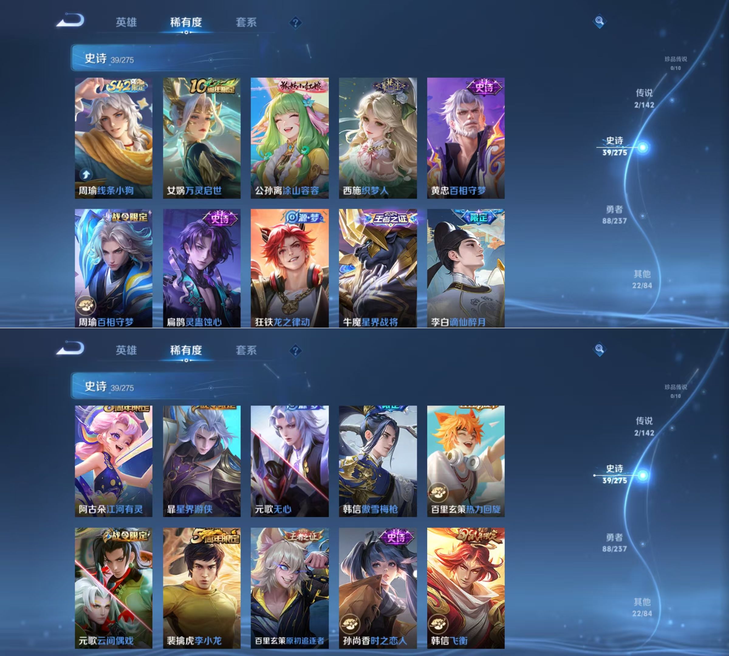 【史诗皮肤】 克喵 灵蛊蚀心 龙之律动 织梦人 百相守梦 星界战将 踏浪烽翎 布丁狗之约 飞衡 傲雪梅枪 涂山容容 死霸装 谪仙醉月 热血海滩 西部游侠 灵野札记 春野闲踪 虚灵犬护 谧流熔炉 劲辣红锅 线条小狗 万灵启世 威尼斯狂欢 罗小黑战记 王牌新星 聚星闪耀 玫蓝誓约 江河有灵 命运加冕 铁骨偃魂 百相守梦 苍林狼骑 完美运算 逆浪荇歌 星界游侠 热力回旋 幽灵船长 女仆