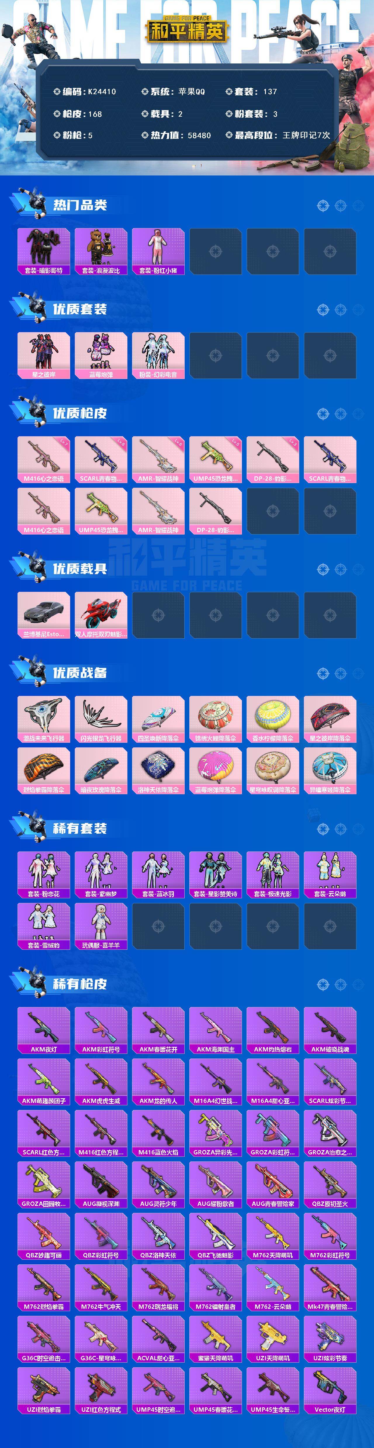苹果 手Q-3粉装-5特效枪-2载具-2粉色飞行器-58480热力值-7王牌印记-137套装-168枪皮