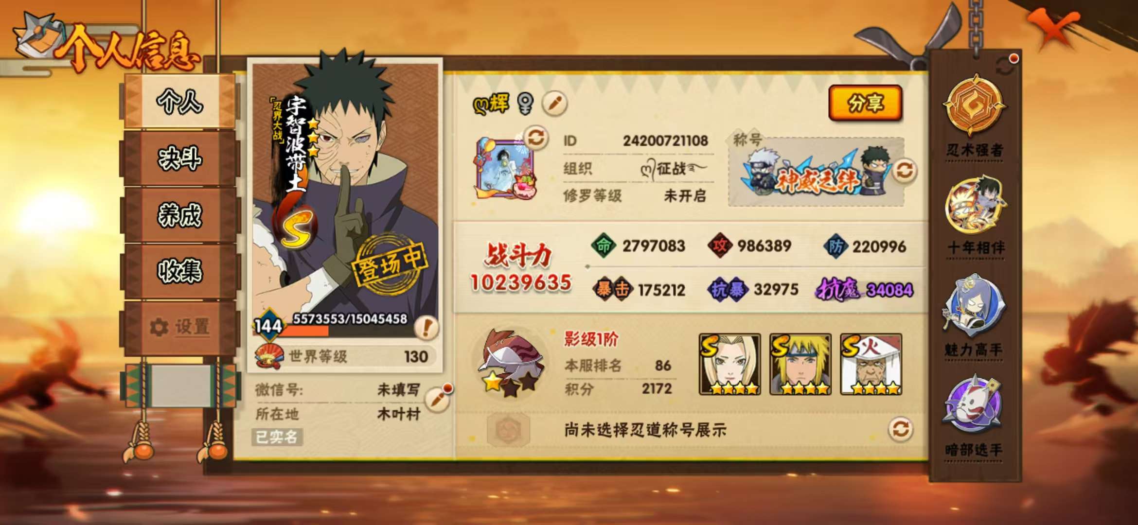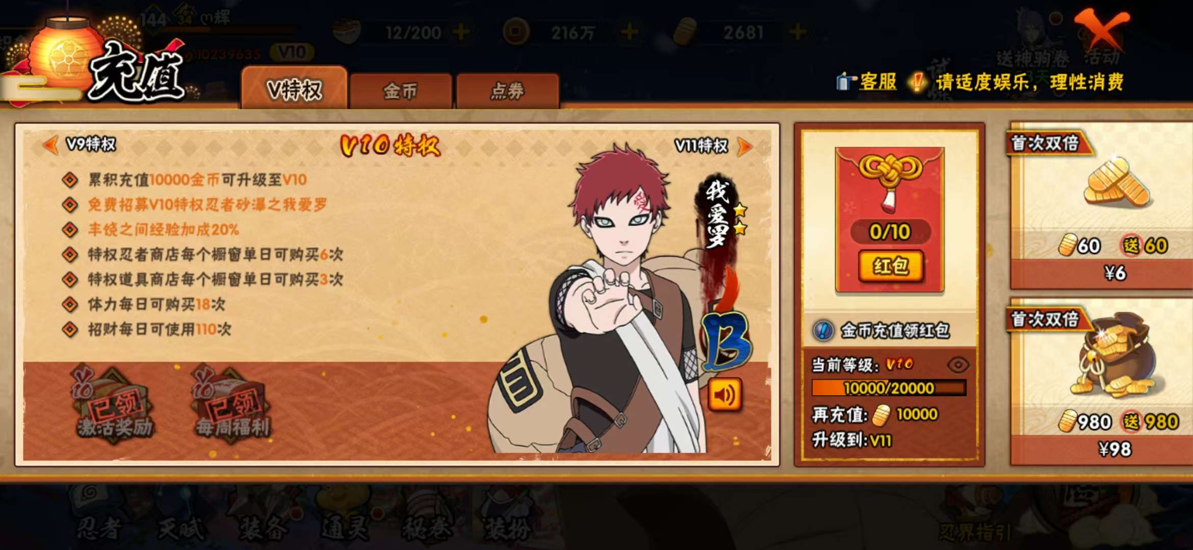 火影v10充了1k,加和平充了500,加玩了那么久,1000多万战力!