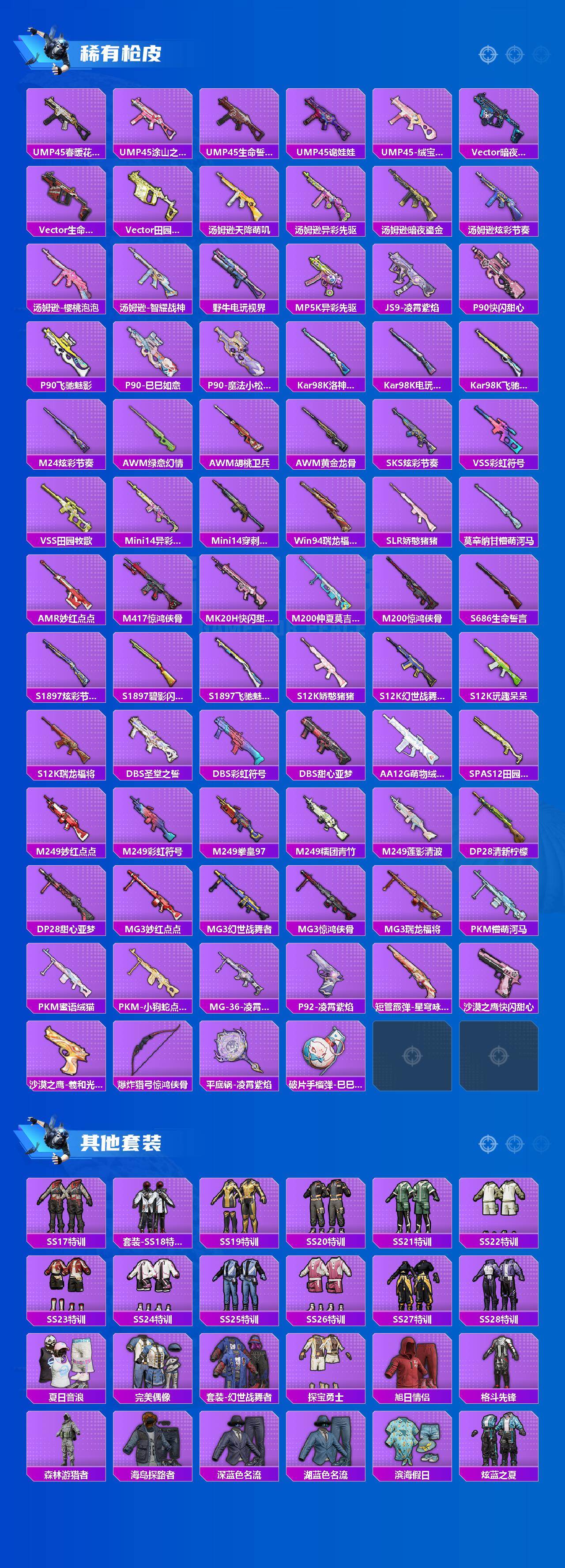 【粉色枪皮等级】:SCAR-L-锦绣绵绵(五级),M416-五爪金龙(七级),M416-风花雪月(七级),GROZA-镜光银凌(五级),Kar98K-巳巳如意(五级),SLR-暗夜玫瑰(三级),AMR-智耀战神(四级)