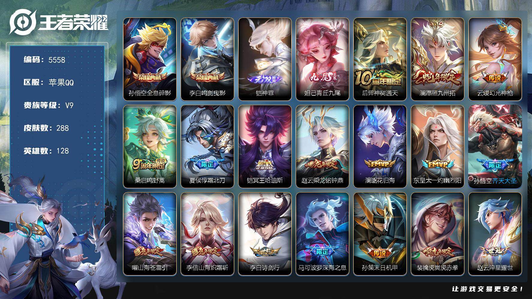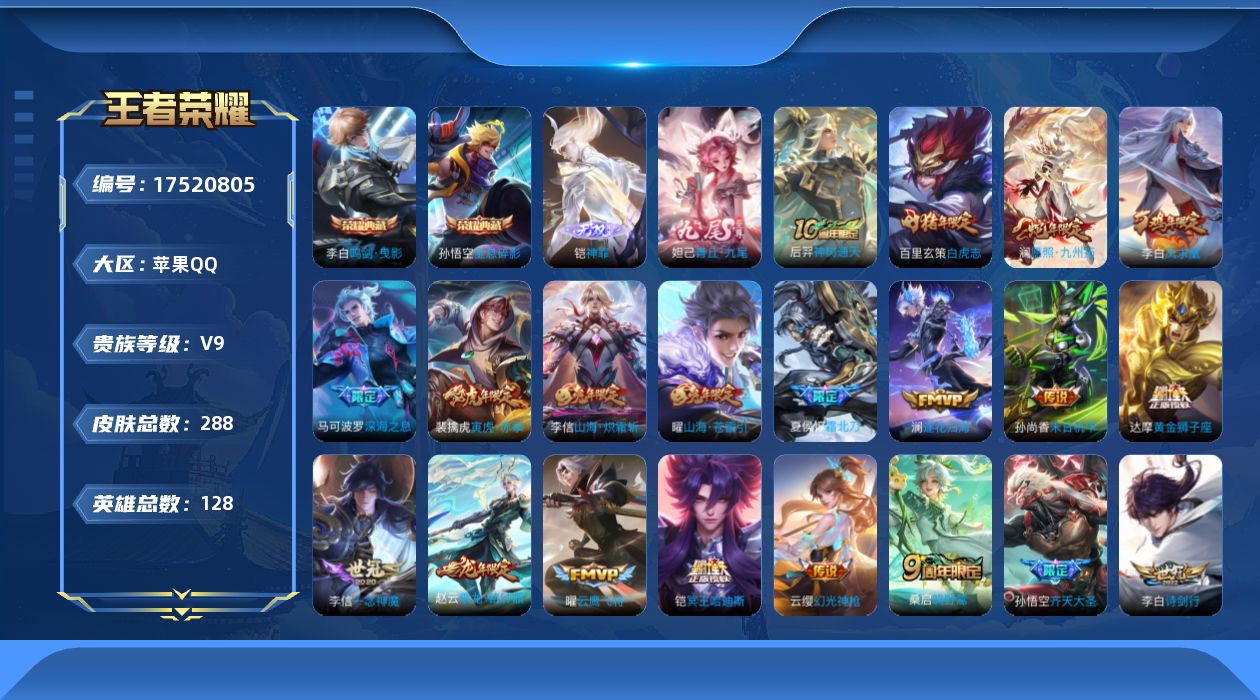 366-[17520805]贵族9-贵族积分102109-288皮2典藏27传说2无双 苹果手Q115区 营地ID1868187029最强王者【无双皮肤】:神罪,青丘·九尾【荣耀典藏】:鸣剑·曳影,全息碎影【优质限定皮肤】:白虎志,凤求凰,至尊宝,山海·炽霜斩,山海·苍雷引,神威【传说皮肤】:灼幽烈阳,逐花归海,黄金狮子座,深海之息,神树通天,幻光神枪,愿照·九州拓,鸣野蒿,霜北刀,冥王哈迪斯,末日机甲,乘龙·铭钟鼎,白虎志,云鹰飞将,一念神魔,凤求凰,启明星使,诗剑行,黄金射手座,淬星耀世,末