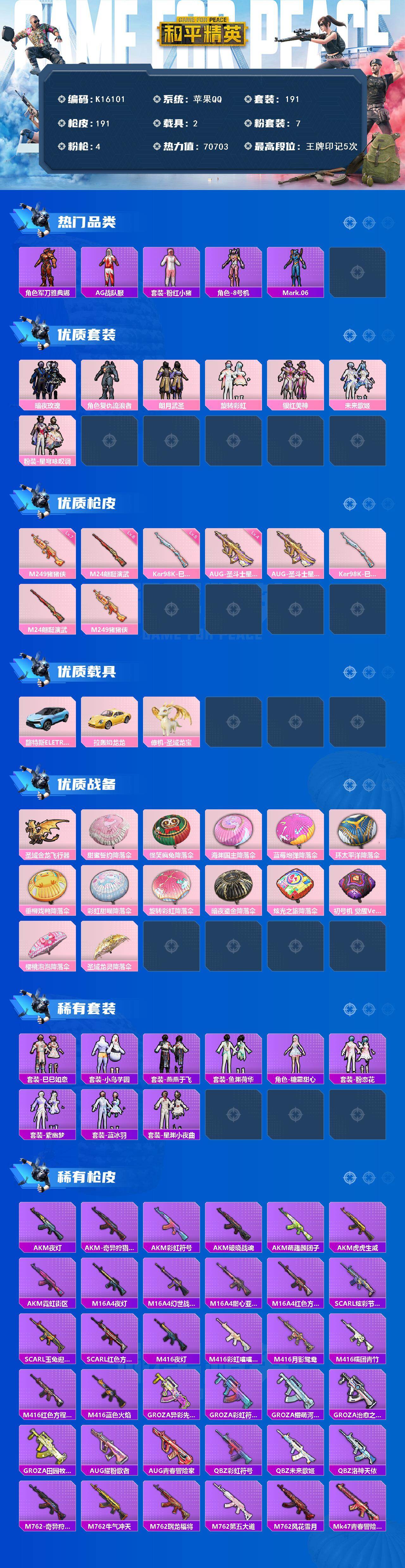 苹果 手Q-7粉装-4特效枪-2载具-1粉色飞行器-70703热力值-5王牌印记-191套装-191枪皮