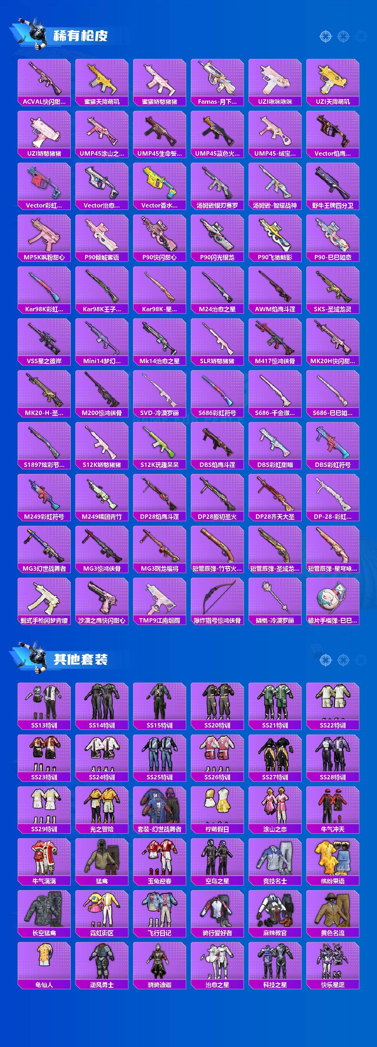 【粉色枪皮等级】:AKM-绿萝繁花(五级),SCAR-L-锦绣绵绵(五级),M416-电玩时刻(五级),GROZA-镜光银凌(五级),AUG-暖羊咩咩(五级),Famas-初号机 觉醒Ver.(六级),AKS-74U-星穹咏叹调(五级),P90-金丰海韵(七级),Kar98K-