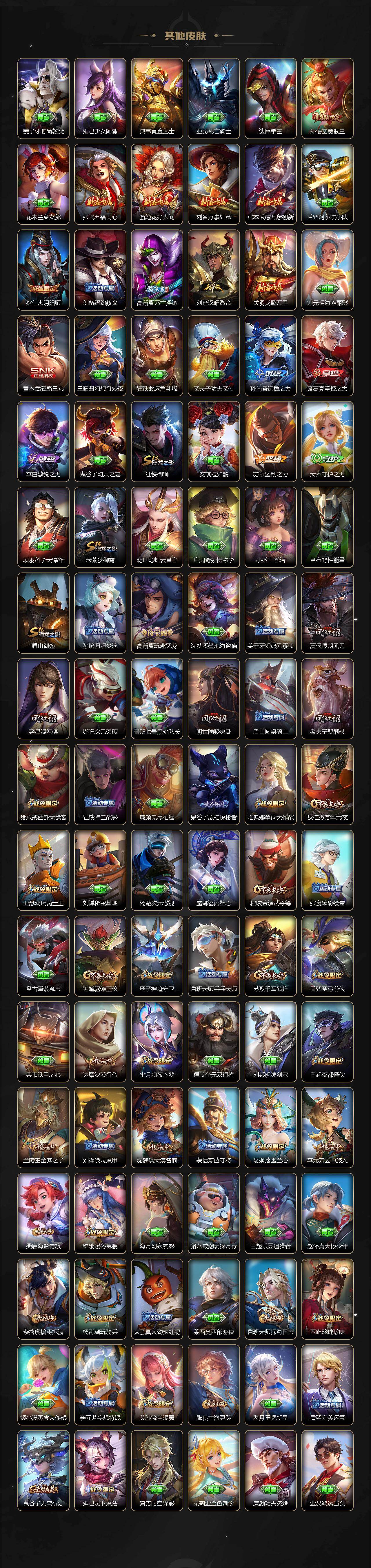 【传说皮肤】:后羿神树通天,云缨幻光神枪,孙悟空齐天大圣,马超无双飞将,孙策末日机甲,王昭君乞巧织情,周瑜音你心动,铠绛天战甲,镜炽阳神光,虞姬启明星使,李信一念神魔,干将莫邪久胜战神,达摩黄金狮子座,后羿黄金射手座,孙尚香末日机甲,宫本武藏地狱之眼