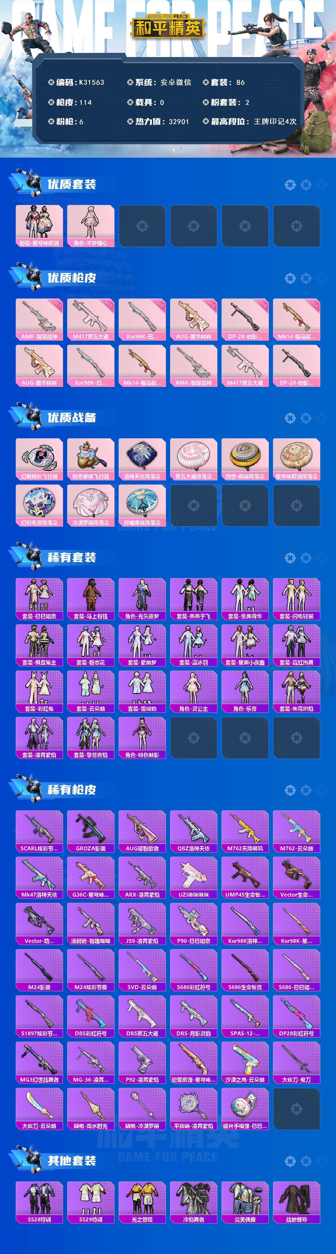 安卓 微信-2粉装-6特效枪-0载具-2粉色飞行器-32901热力值-4王牌印记-86套装-114枪皮