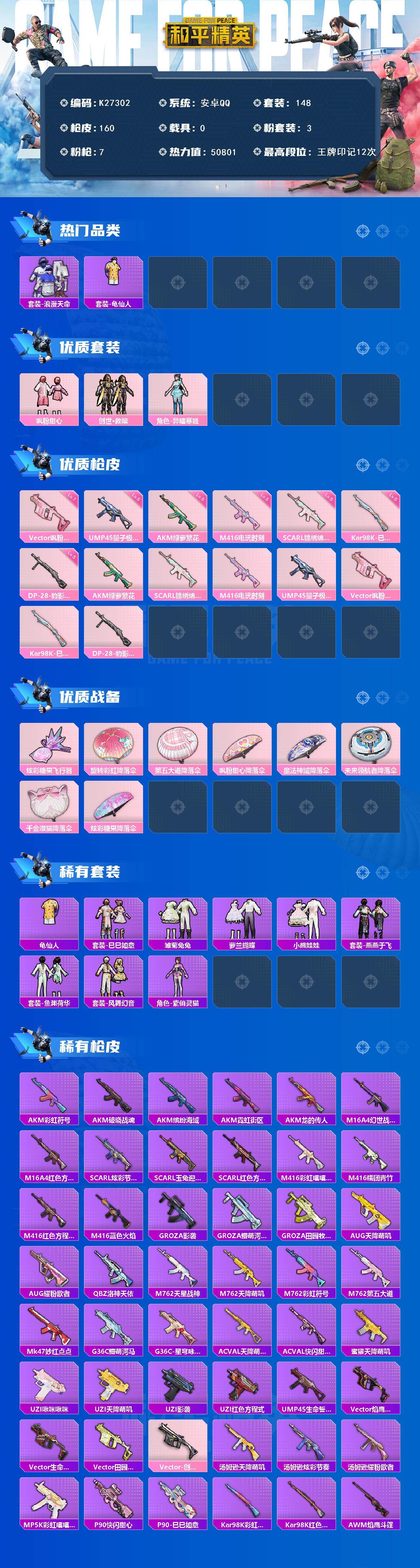安卓 手Q-3粉装-7特效枪-0载具-1粉色飞行器-50801热力值-12王牌印记-148套装-160枪皮